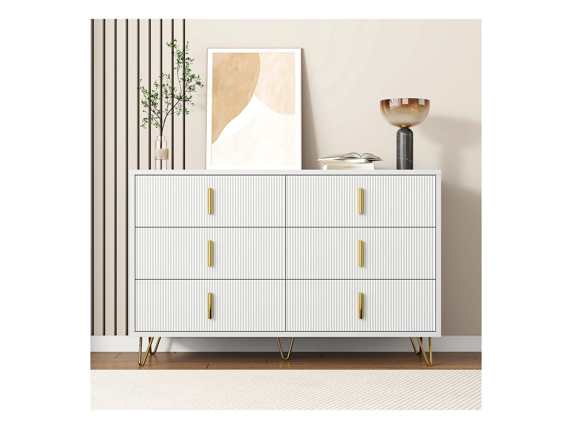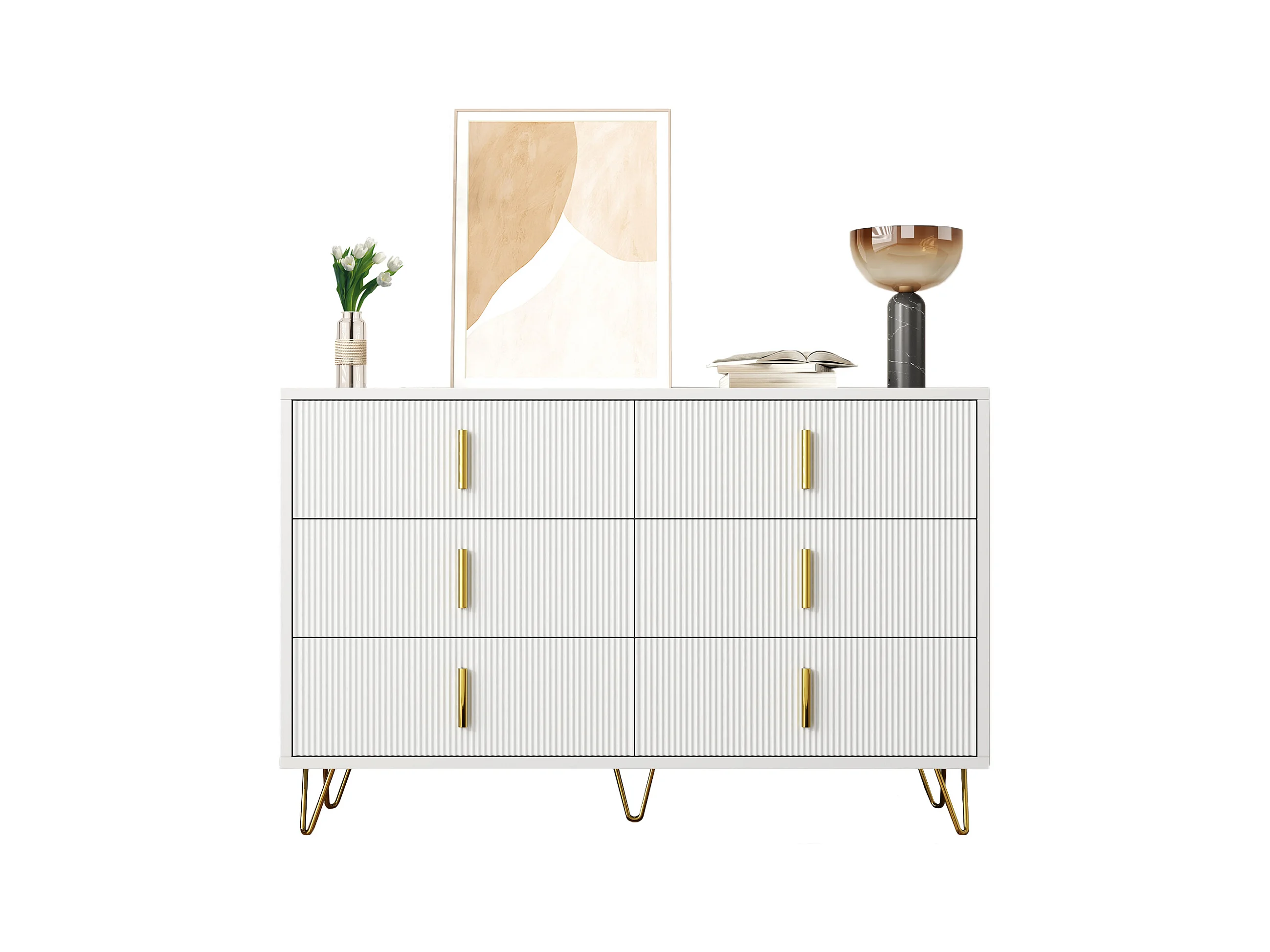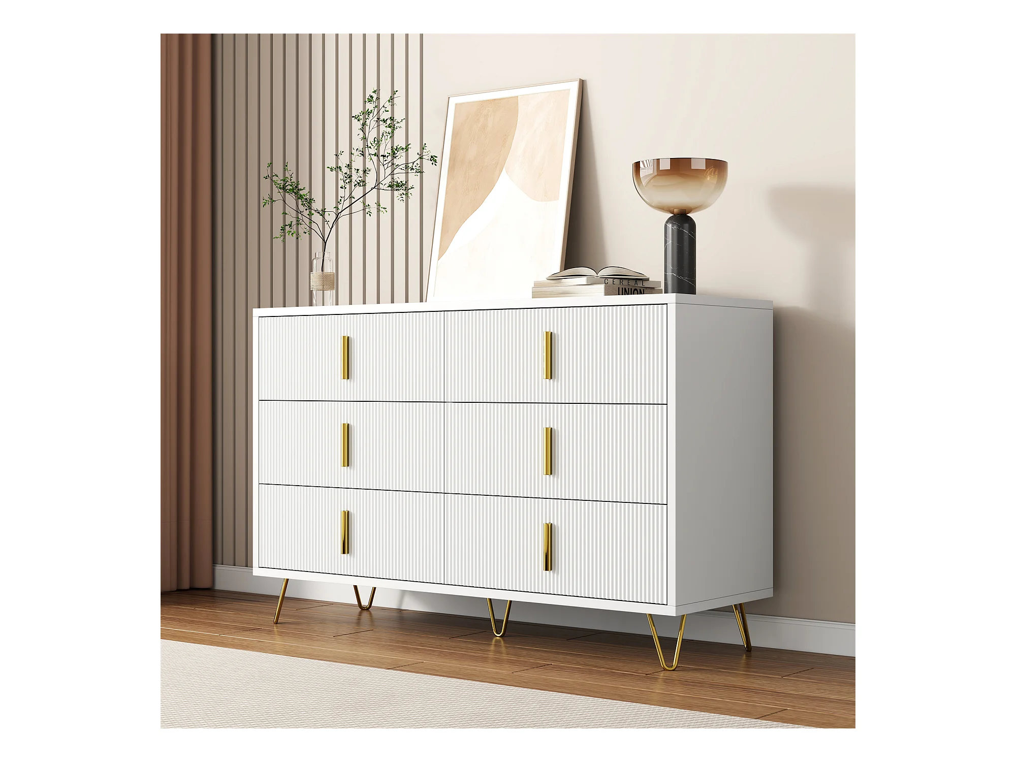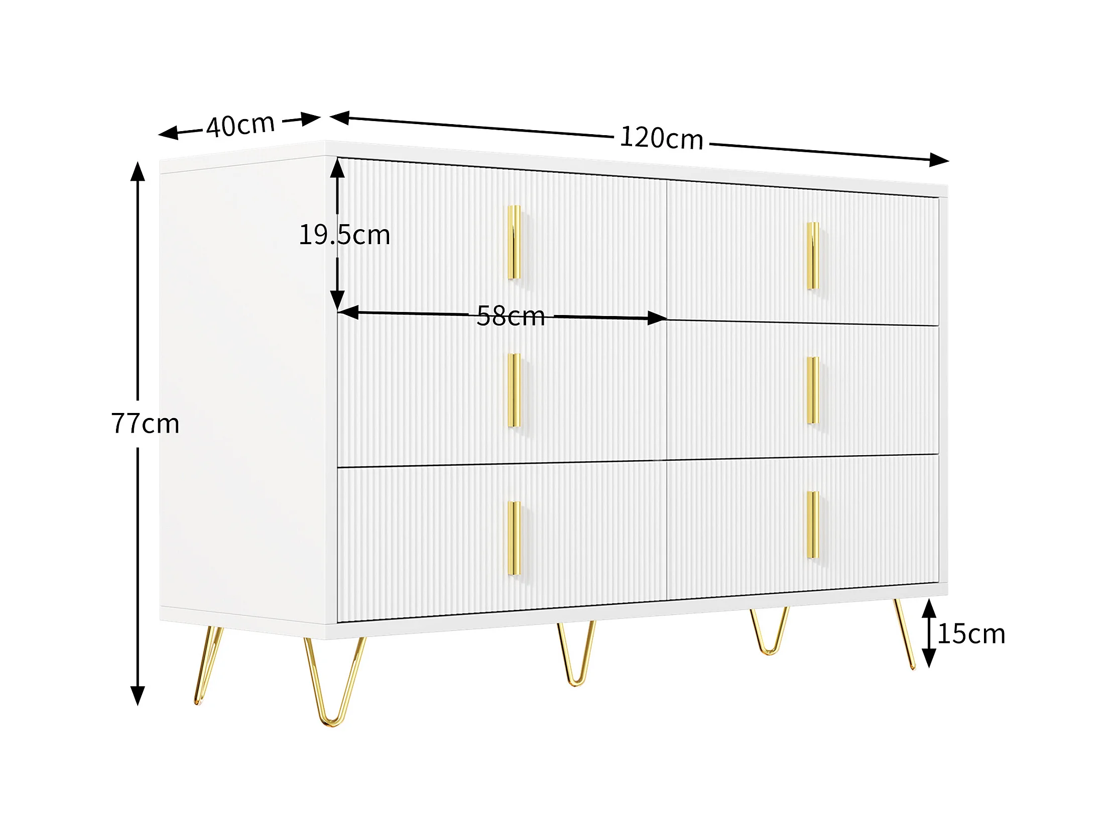 Commode avec 6 tiroirs - 120 x 44x 77 cm - Panneaux de particules et pièds en métal doré - Blanc