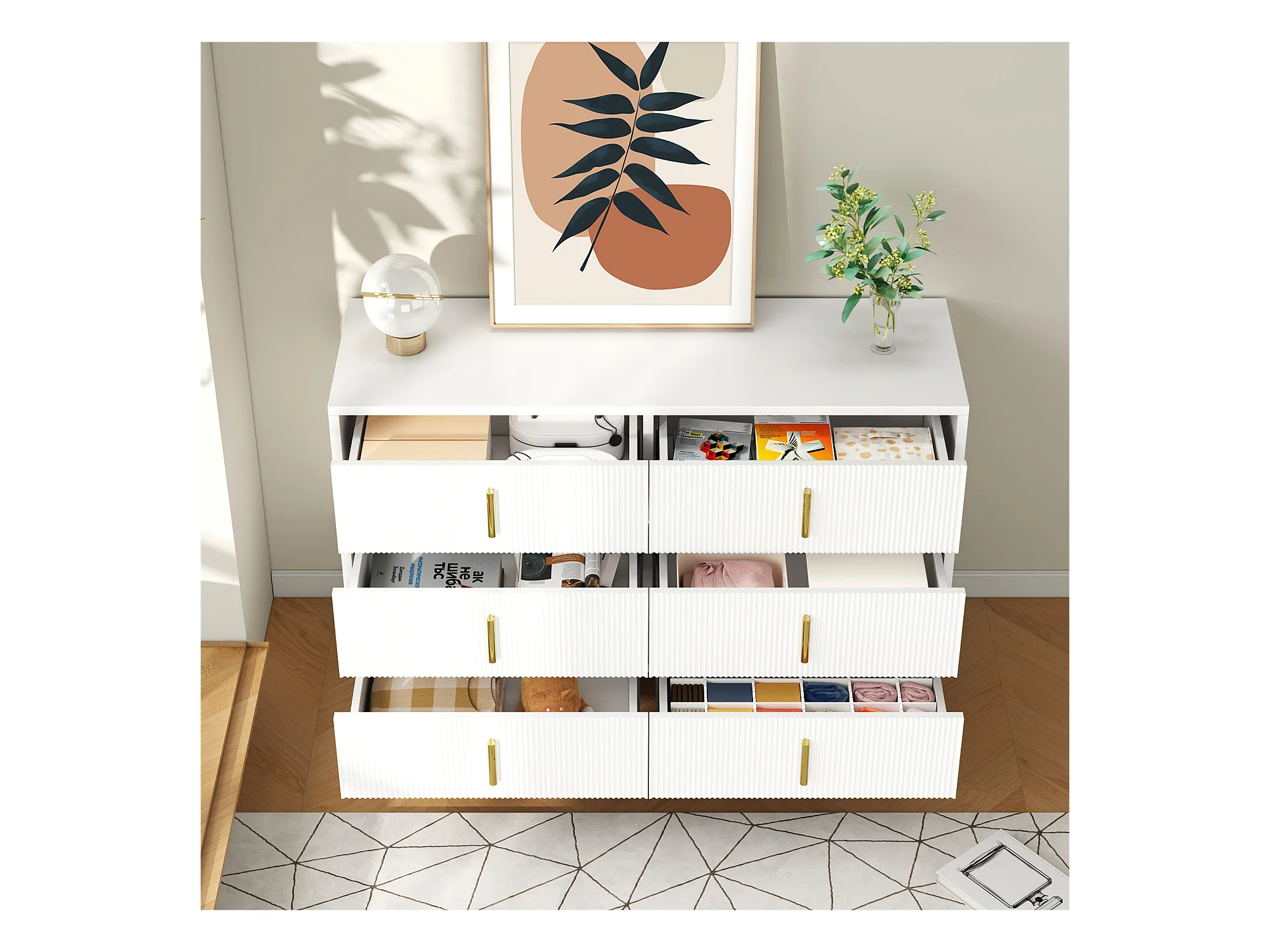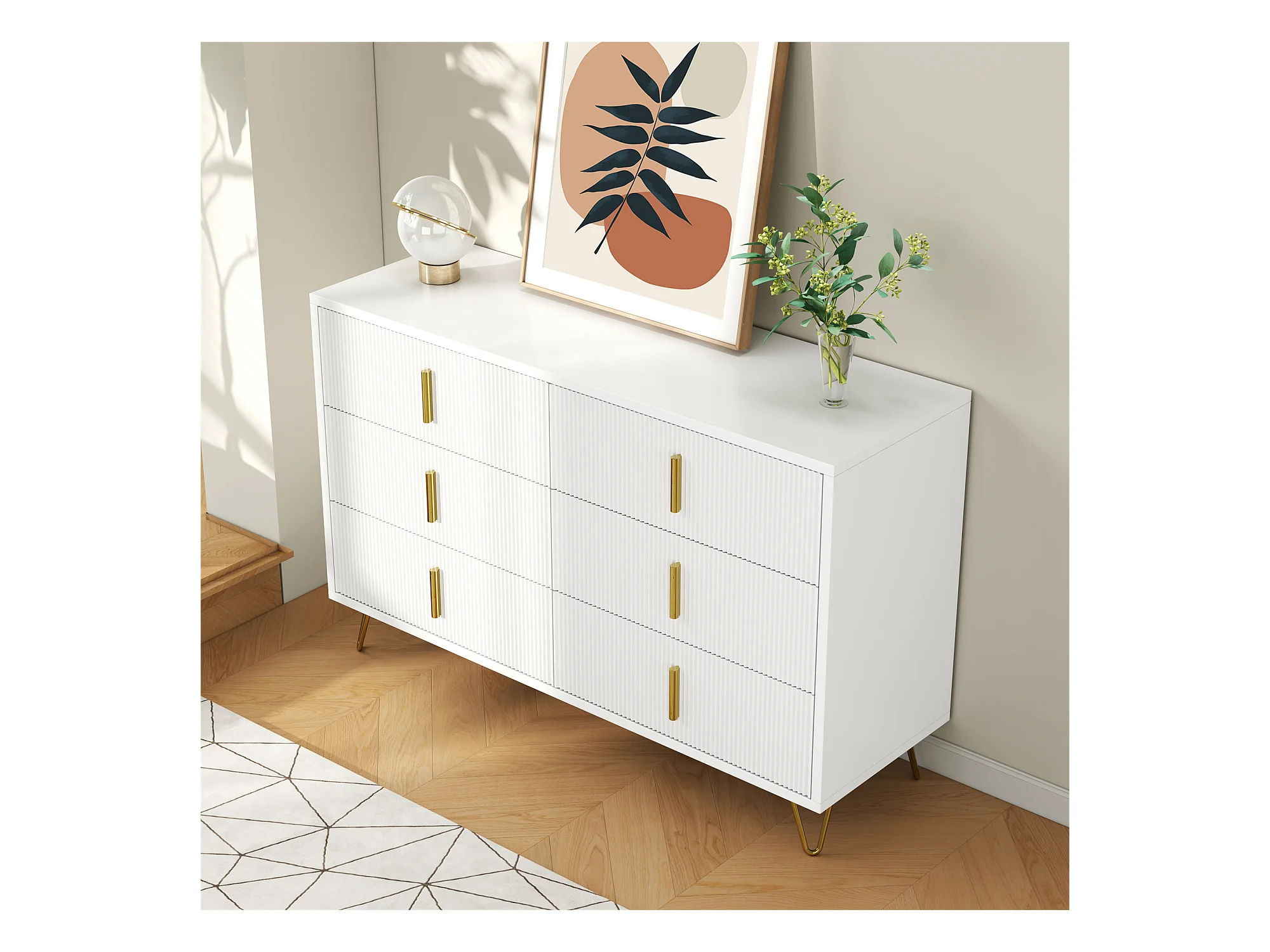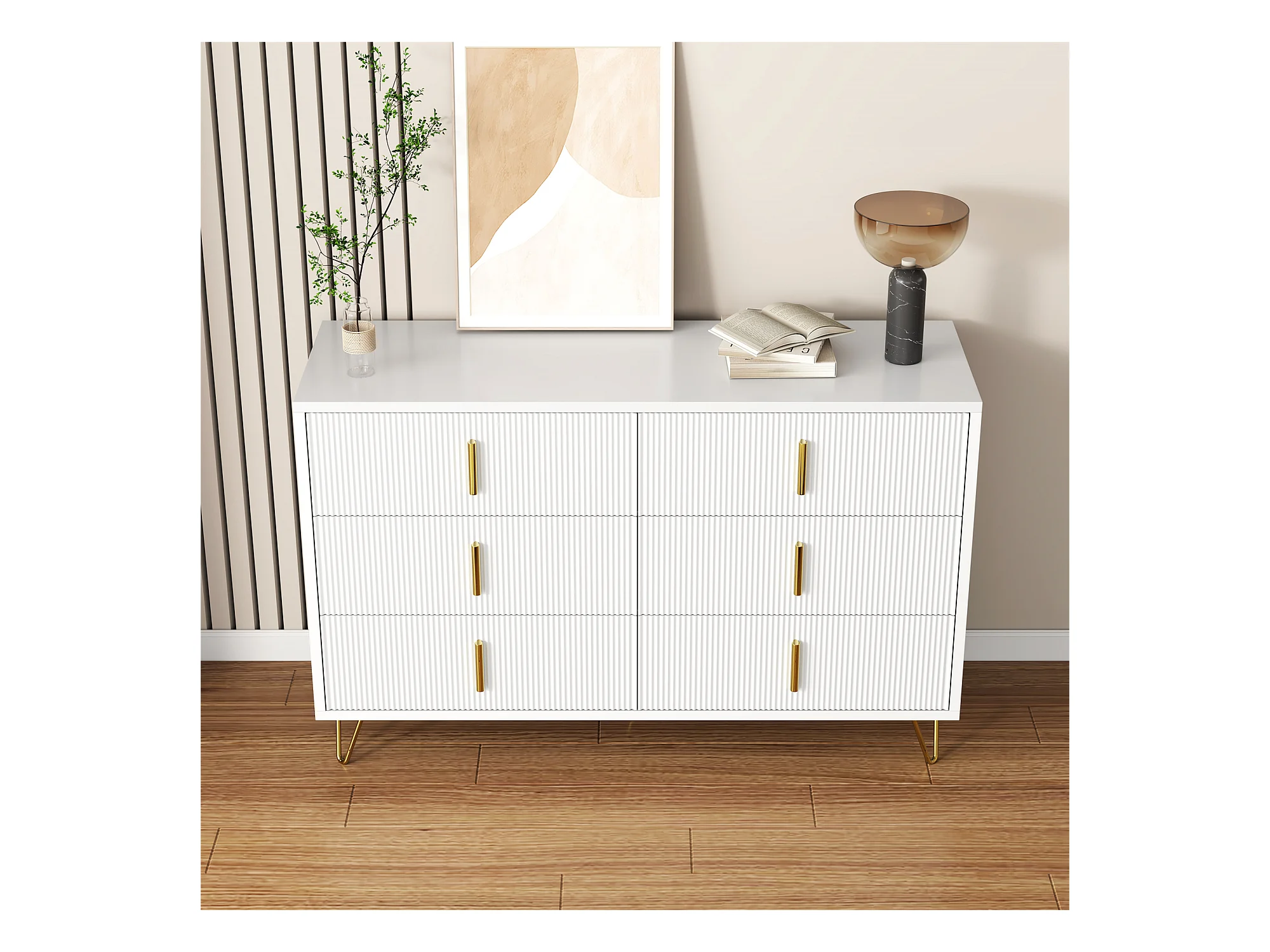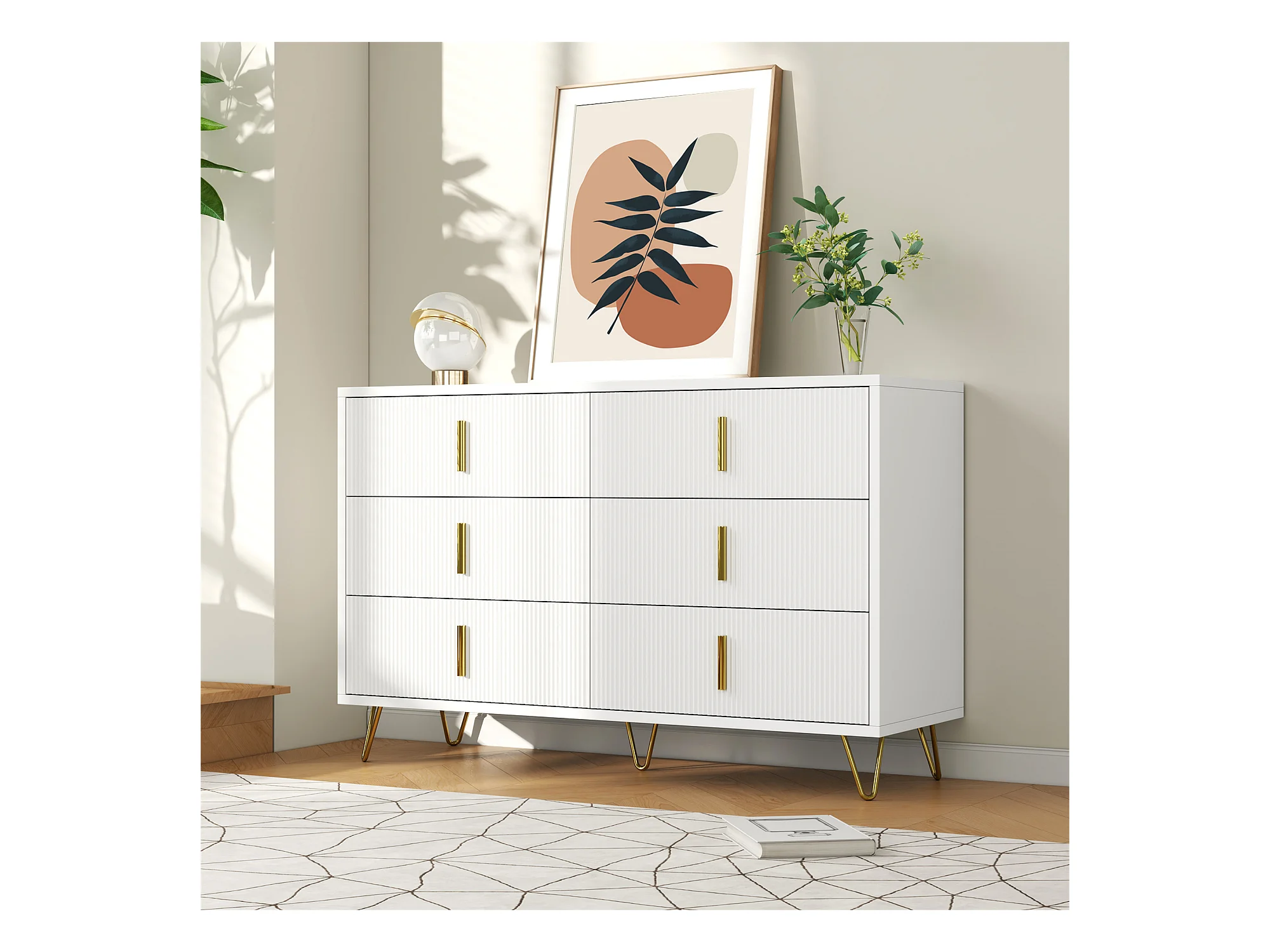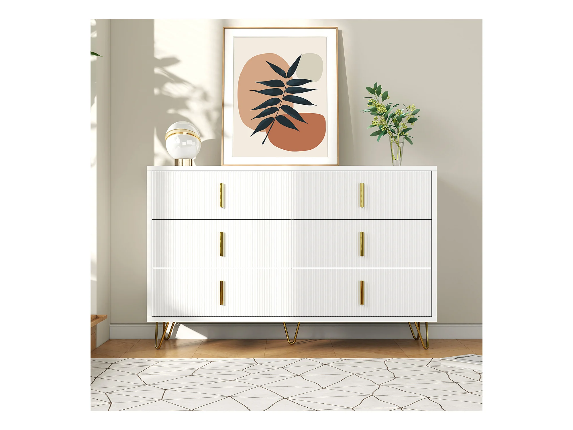 Commode avec 6 tiroirs - 120 x 44x 77 cm - Panneaux de particules et pièds en métal doré - Blanc