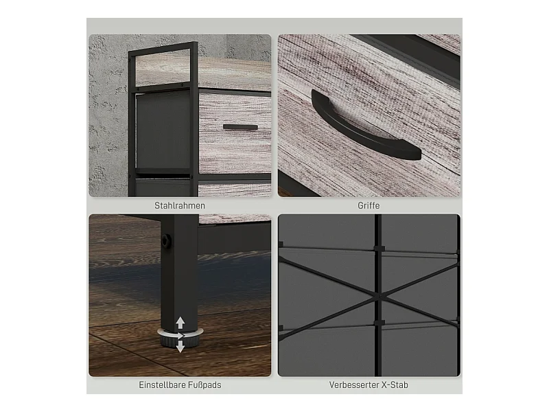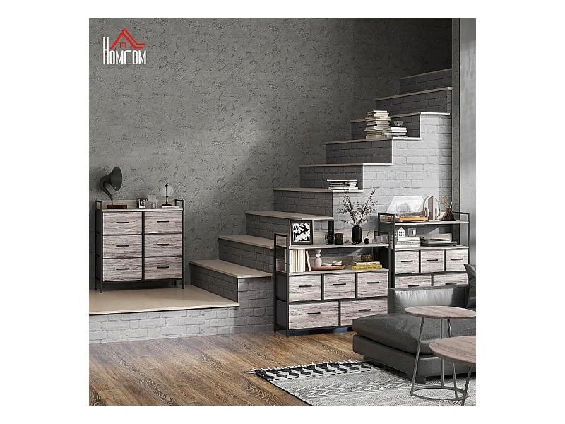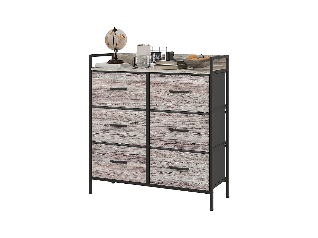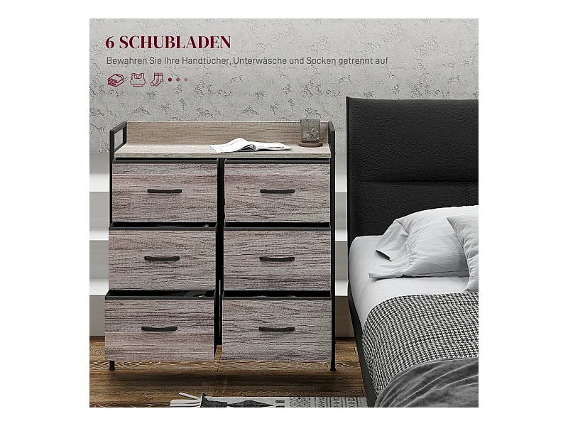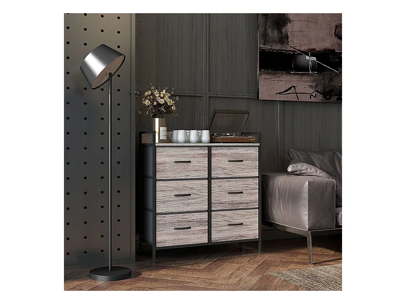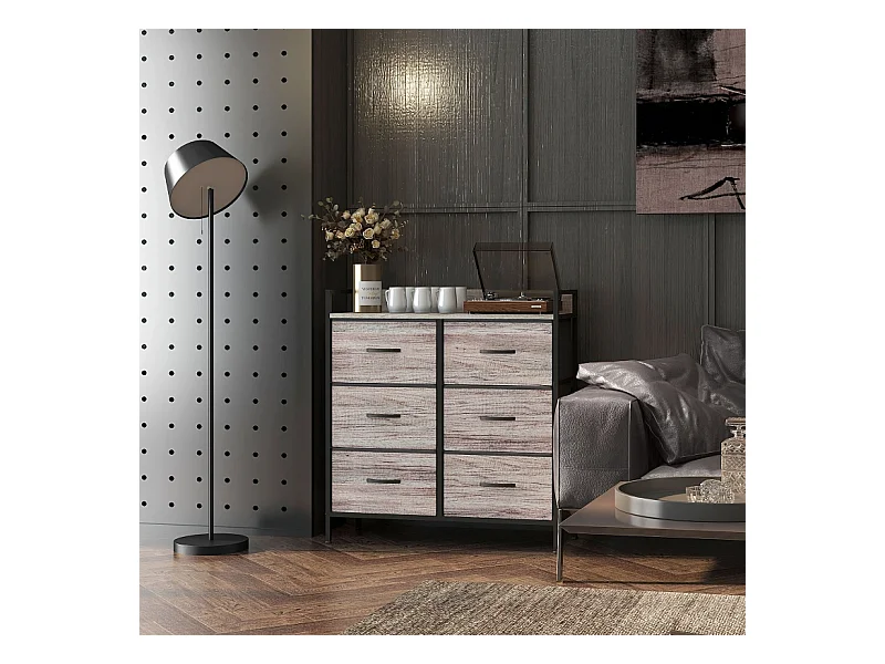 Commode avec 6 tiroirs en tissu, cadre en métal, design industriel, couleur bois clair (79x29x85 cm)
