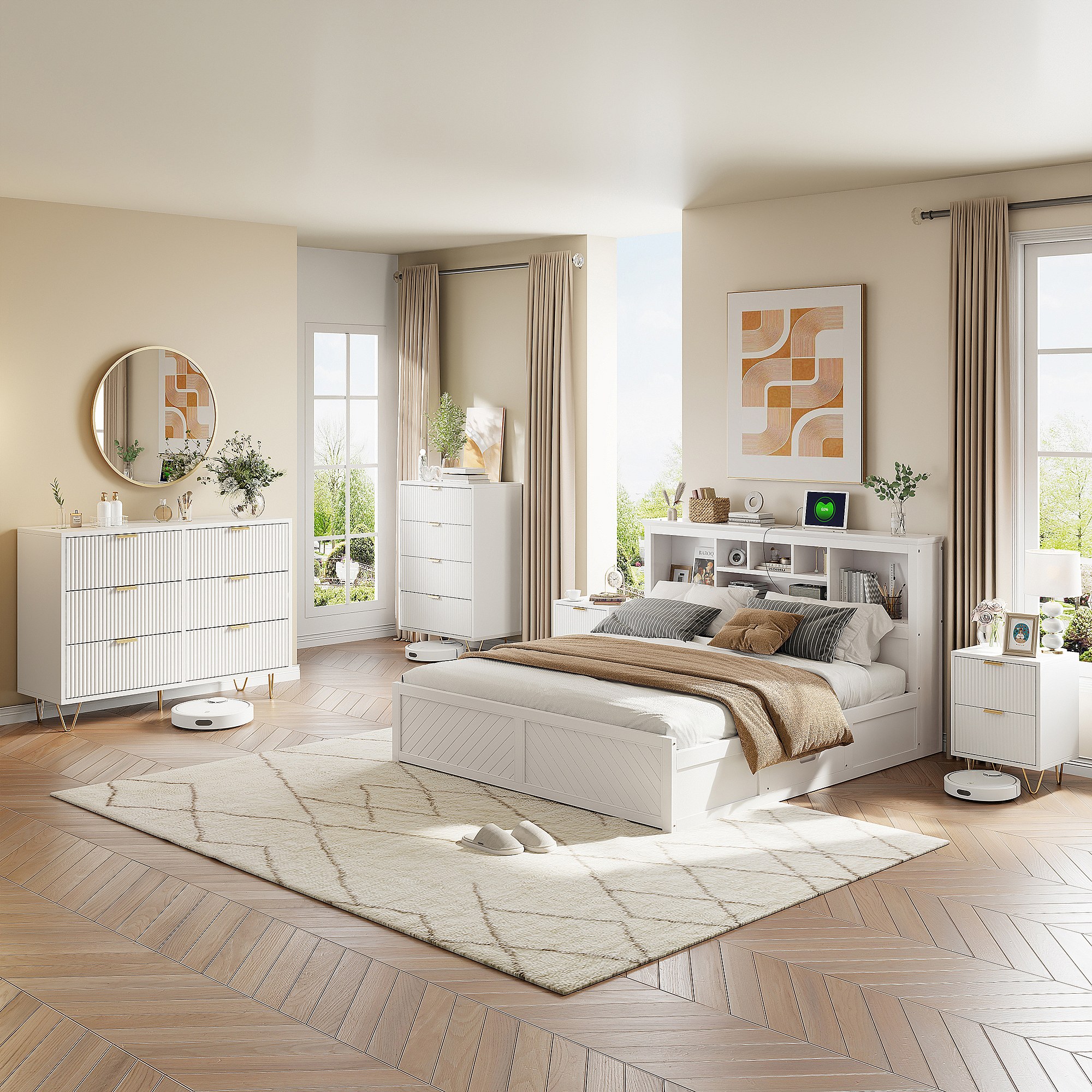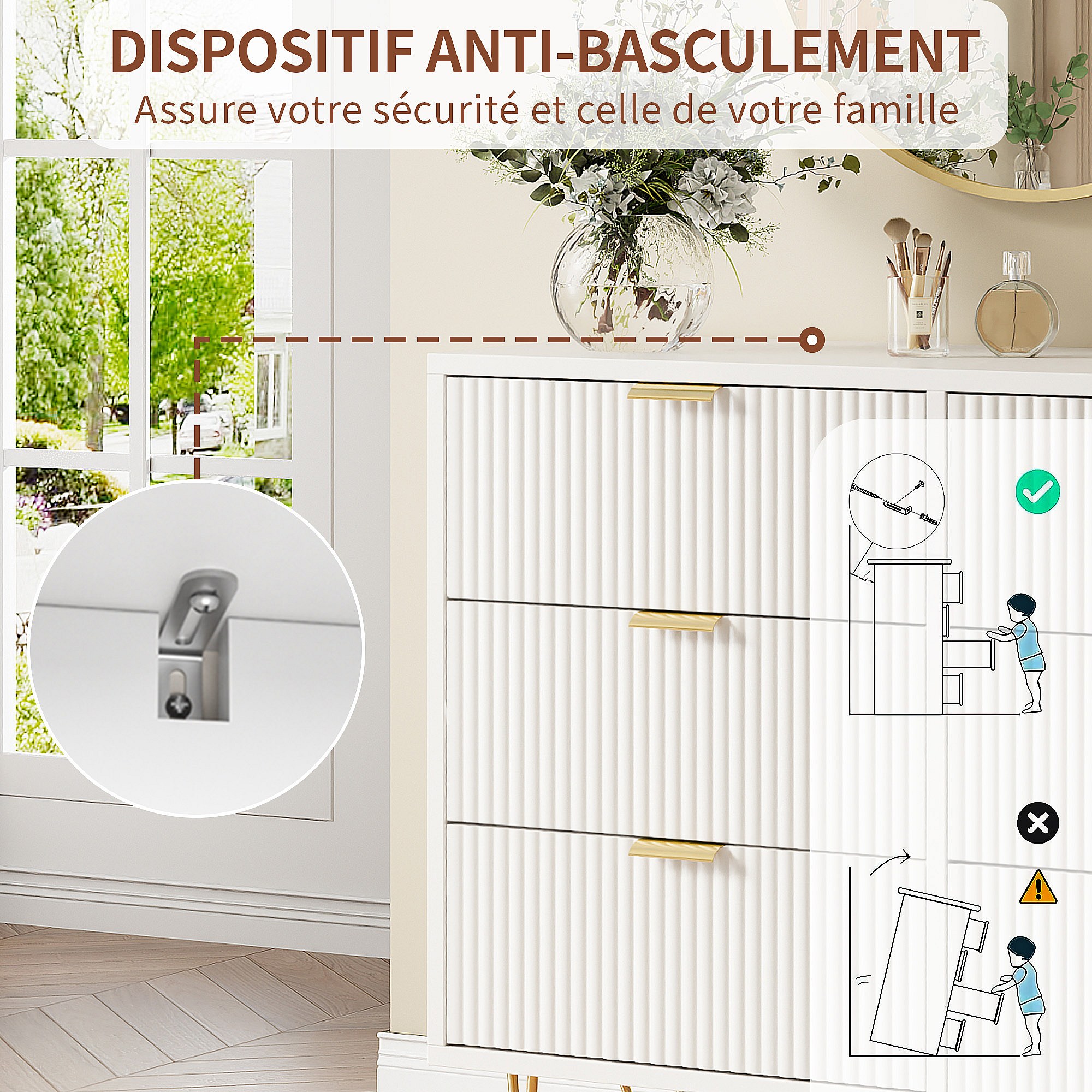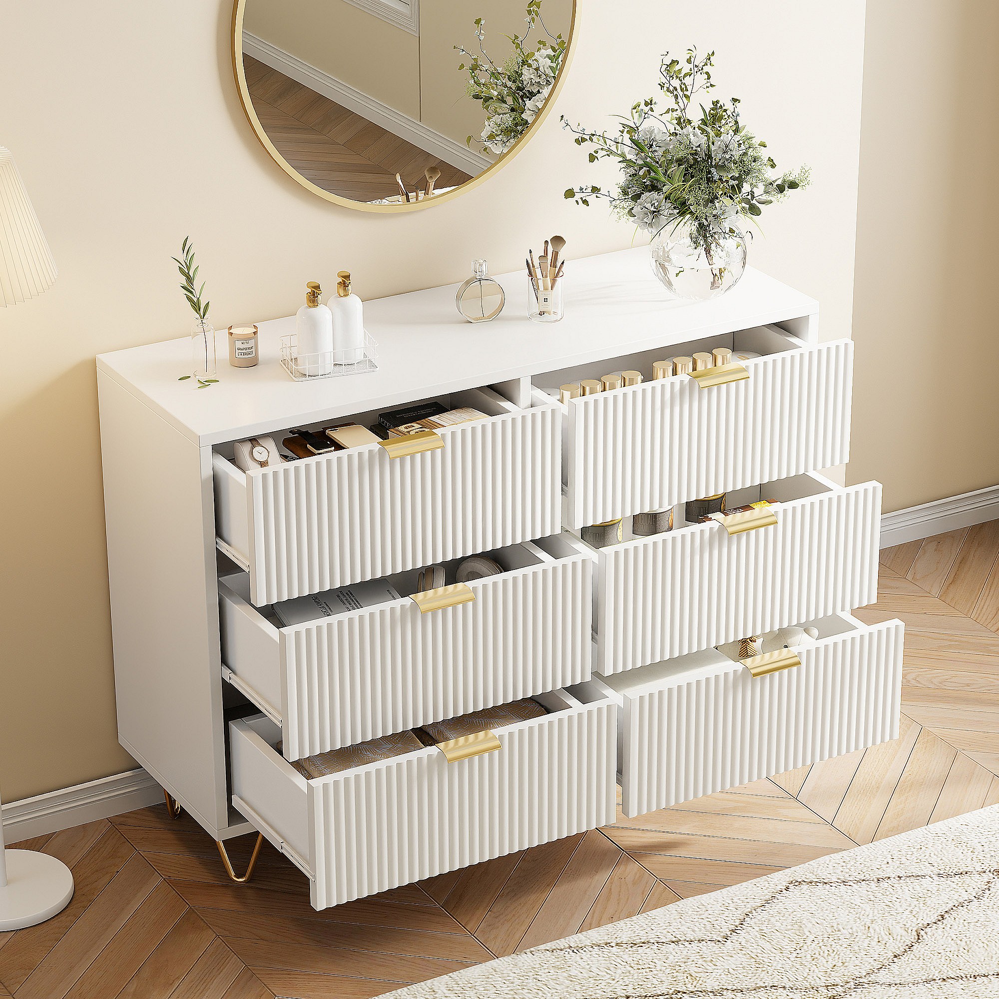 Commode avec 6 Tiroirs, Rangement Meuble Chambre Tiroirs, avec Pieds et Poignées en Métal Doré, Armoire à Tiroirs, Blanc