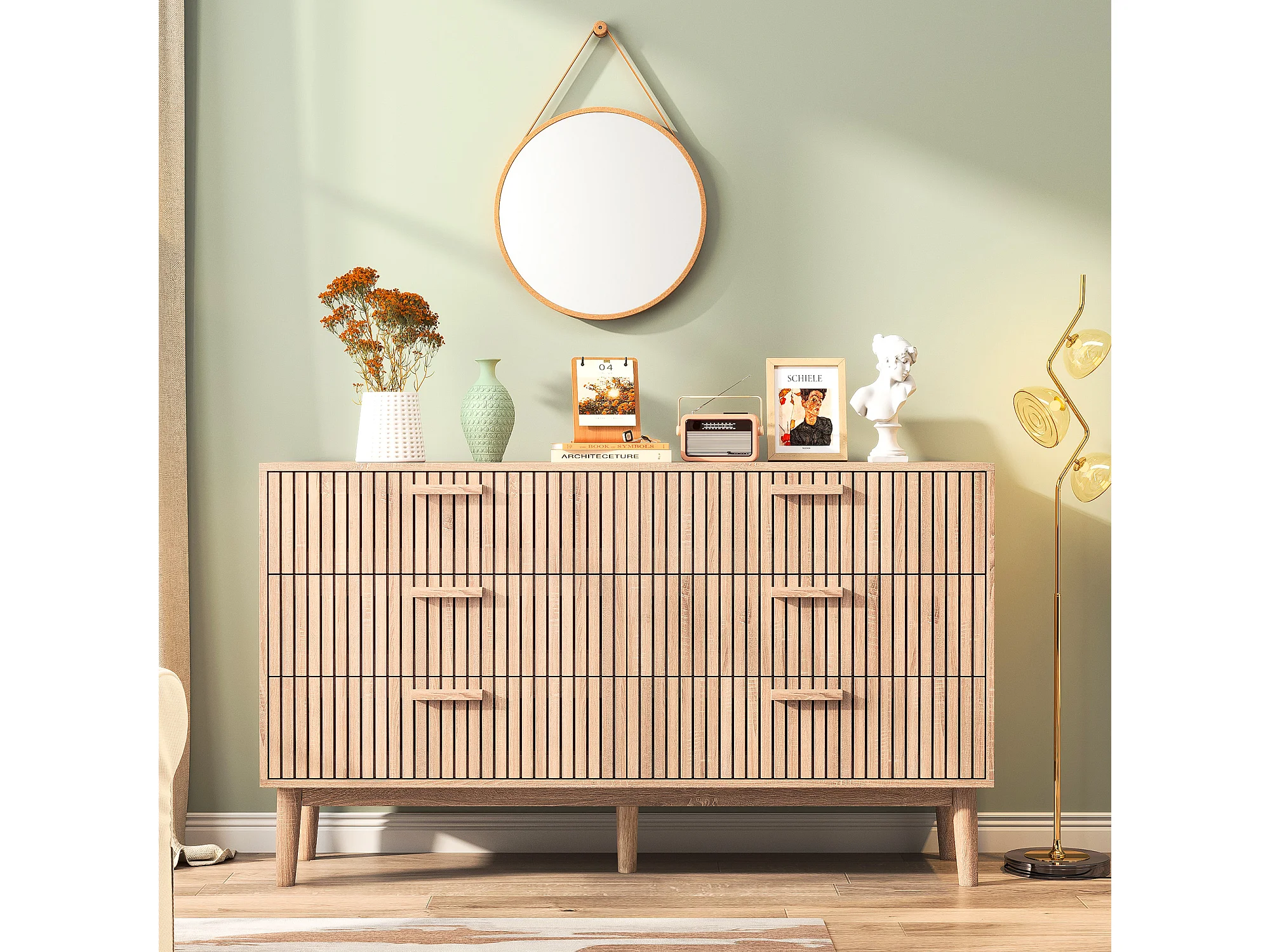 Commode 6 Tiroirs Cannelés SucceBuy, Bois, Système Coulissant/Anti-Basculement, Style Moderne, Organisateur, Salon/Couloir/Chambre/Entrée, Bois Clair