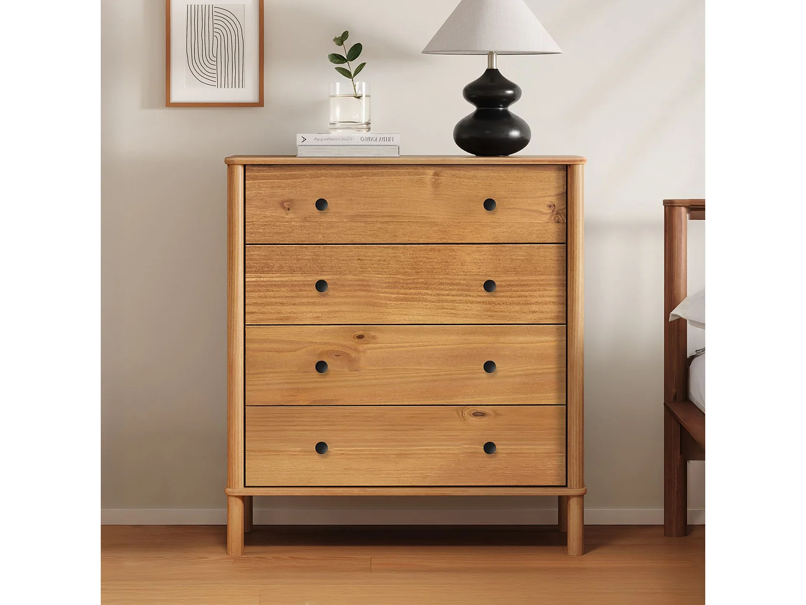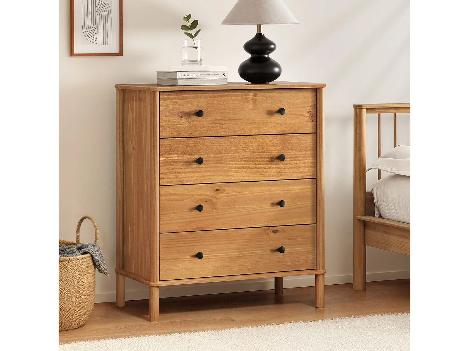 Commode chambre APOANA H 99 cm 4 tiroirs en bois massif coloris chêne meuble de rangement pour vêtements