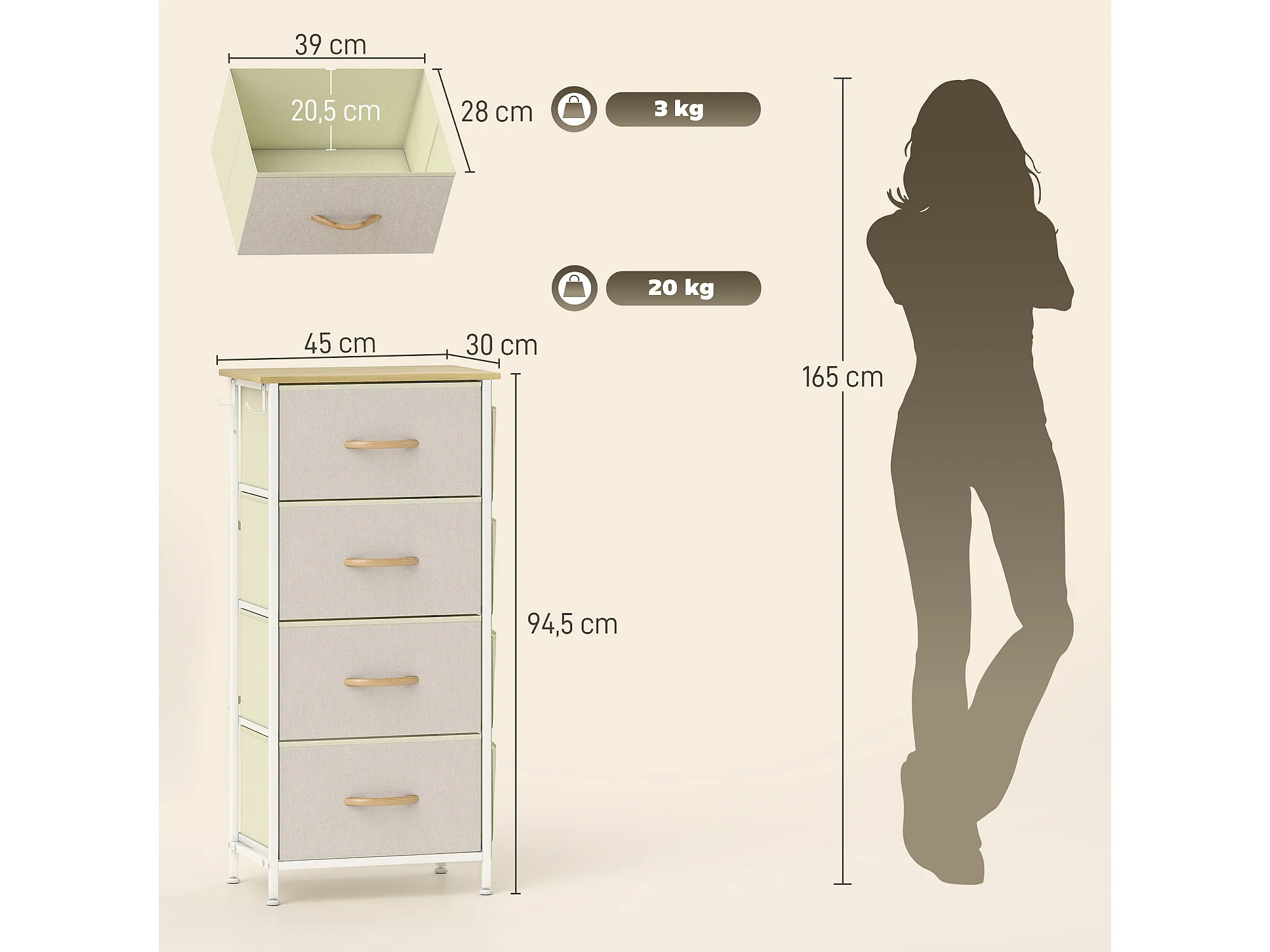 Commode chiffonnier 4 tiroirs en tissu beige 4 poches 2 crochets acier blanc effet bois