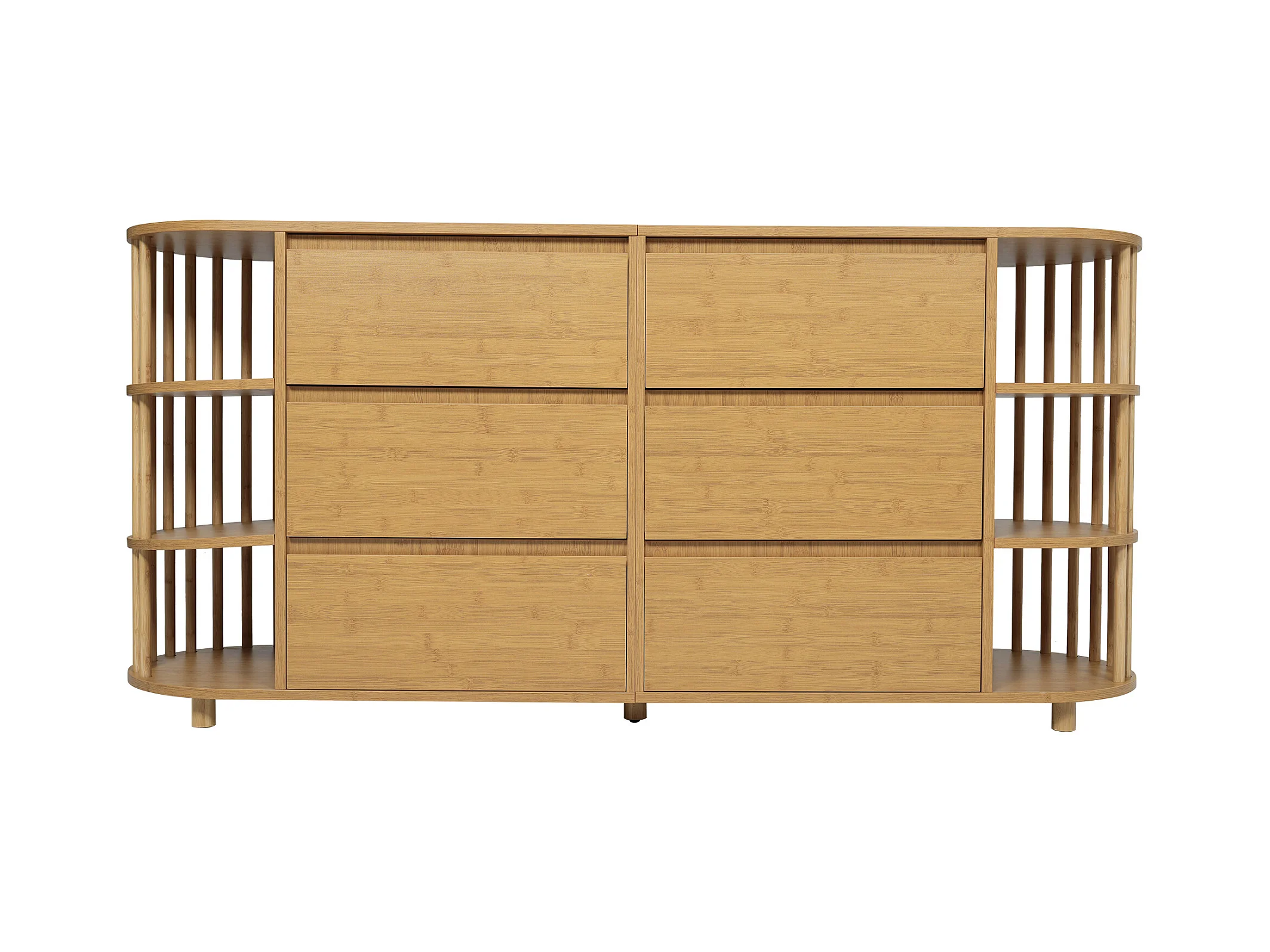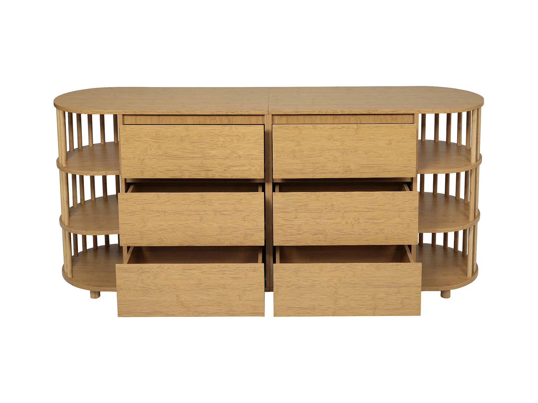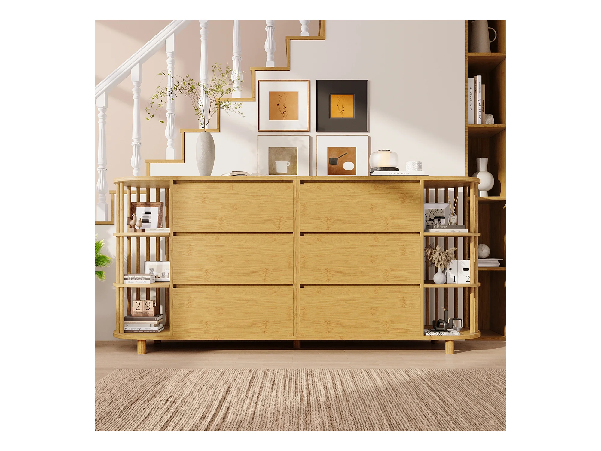 Commode couleur naturelle avec 6 tiroirs et étagères ouvertes, réglable en hauteur