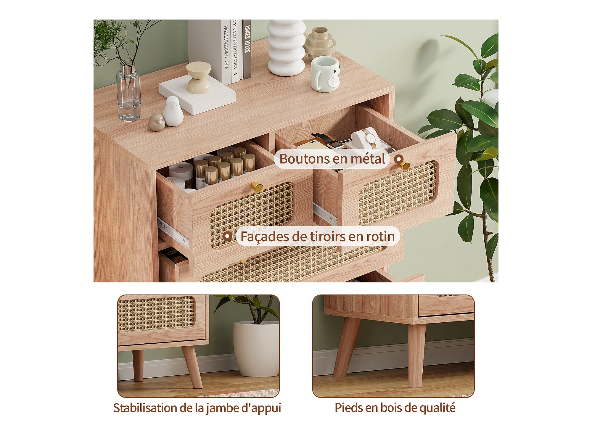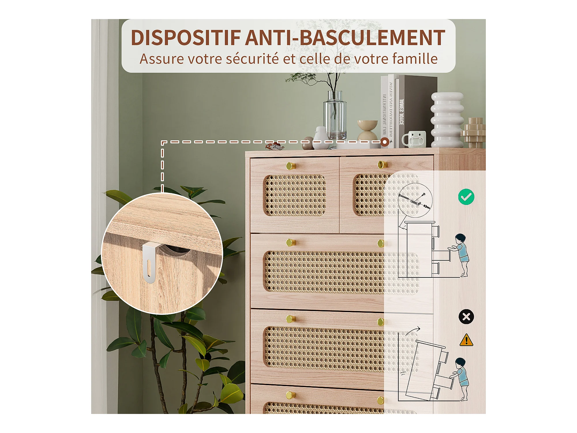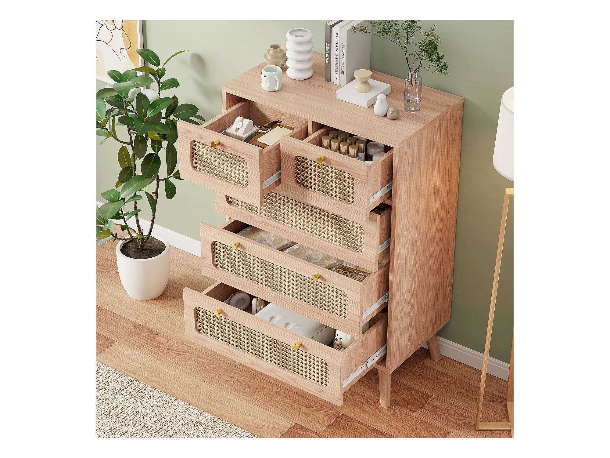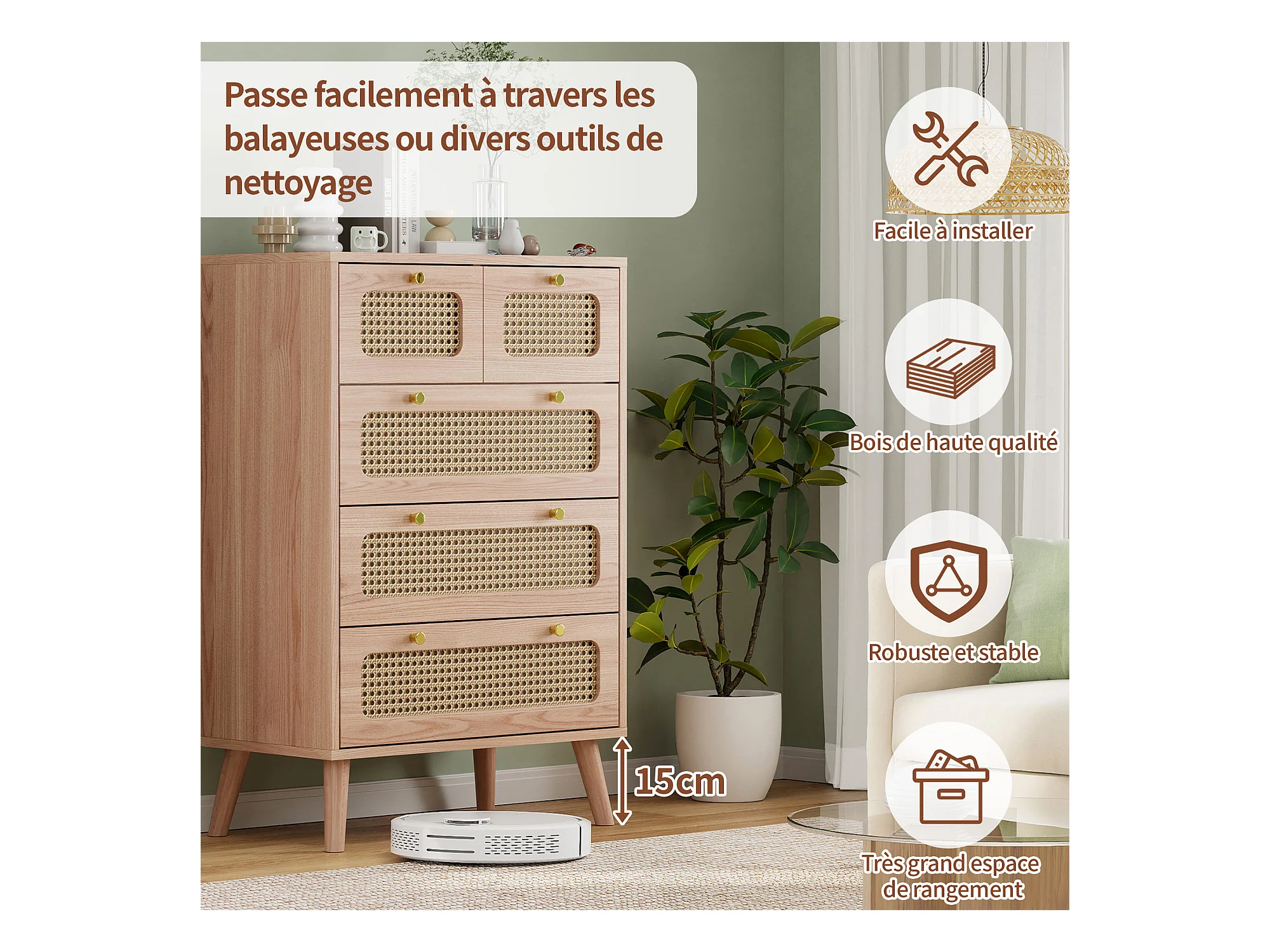 Commode en rotin Meuble de Rangement avec 5 tiroirs, Buffet Commode Chambre (A Couleur du Bois)