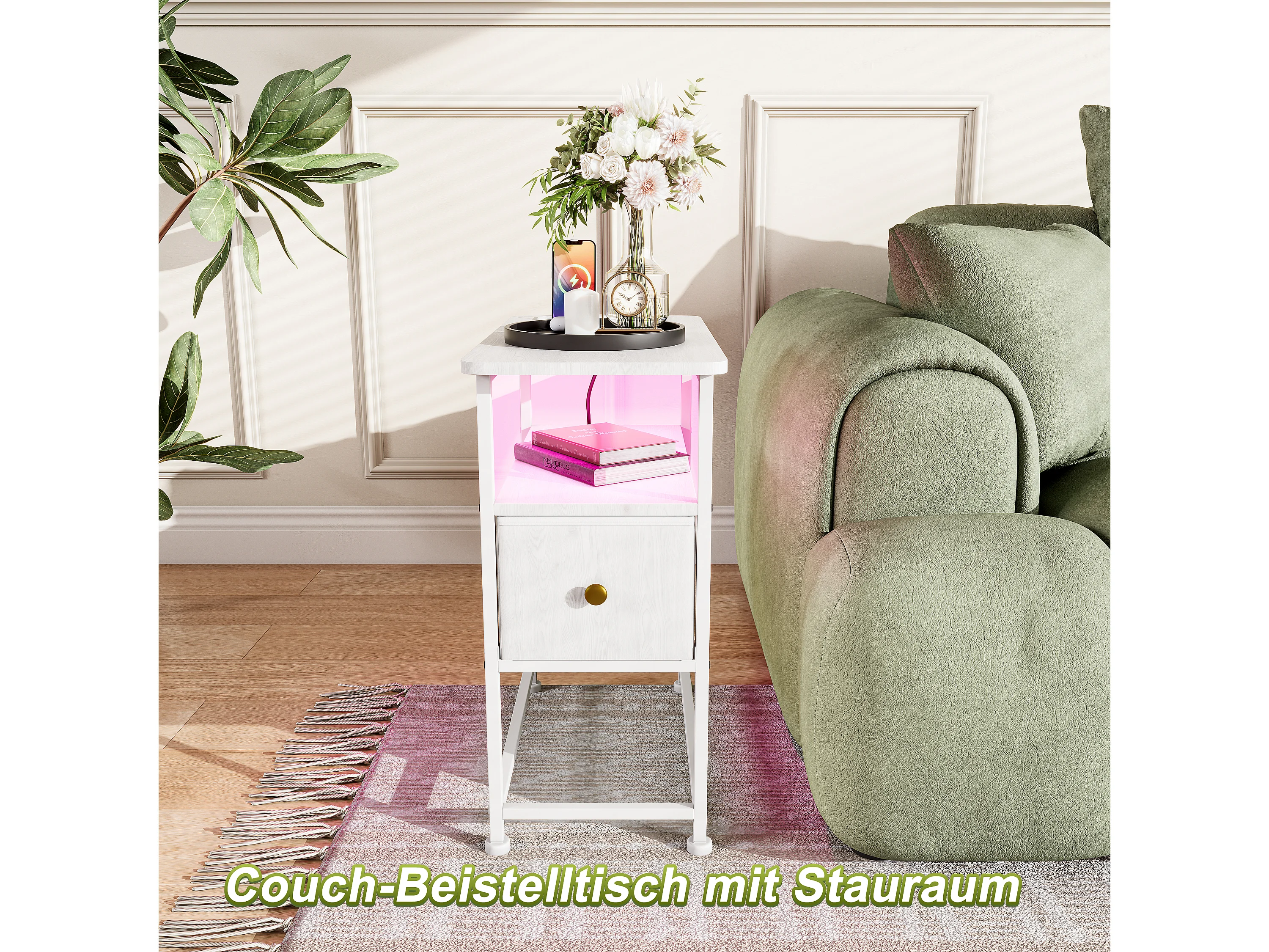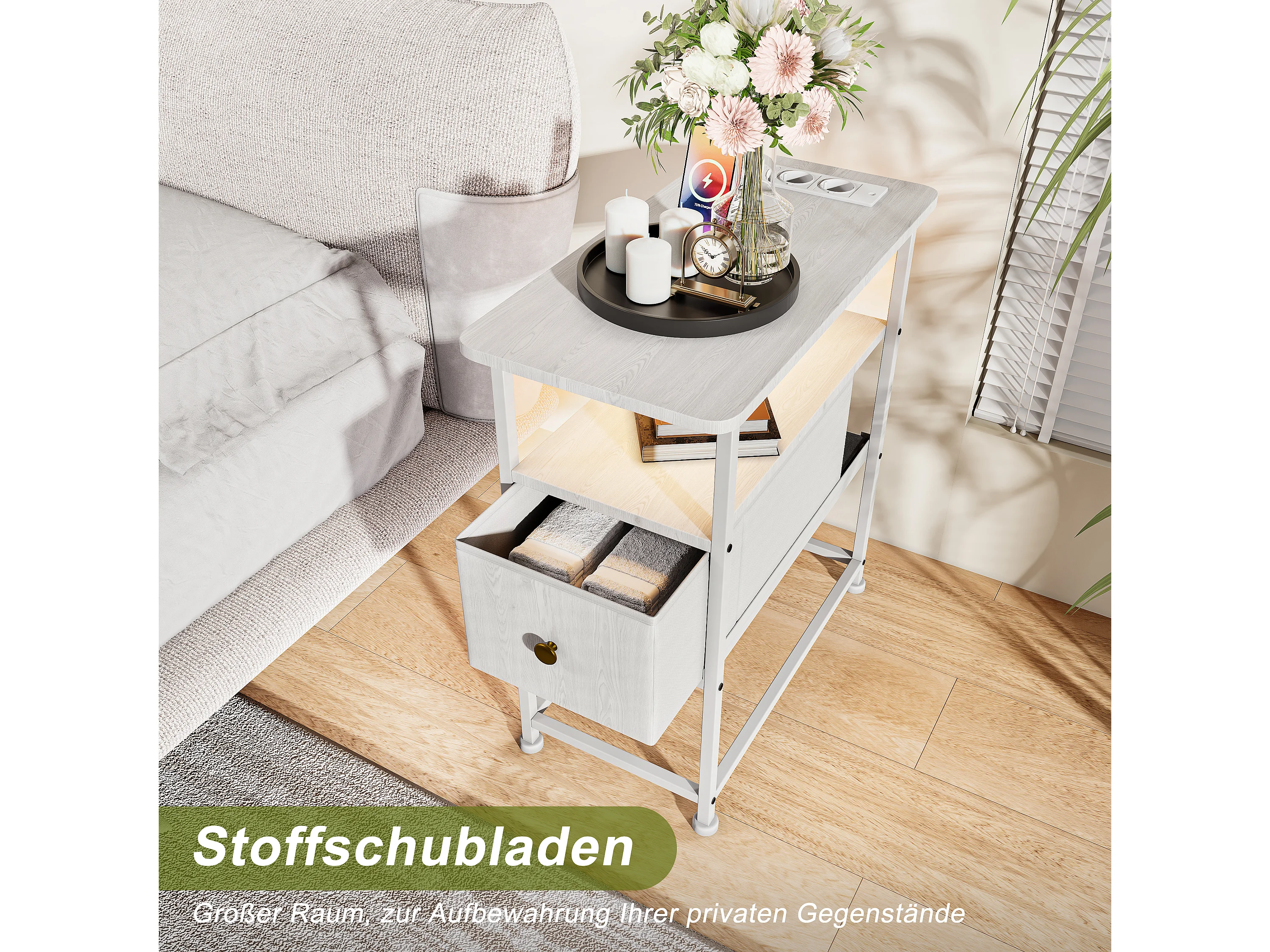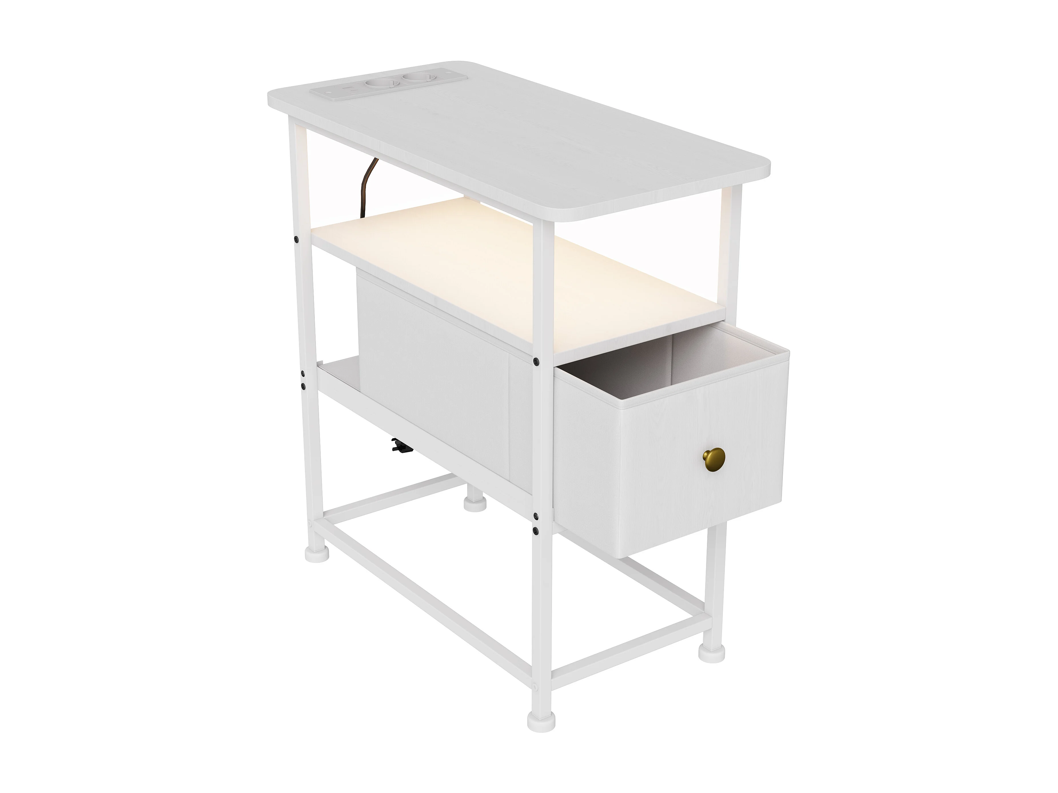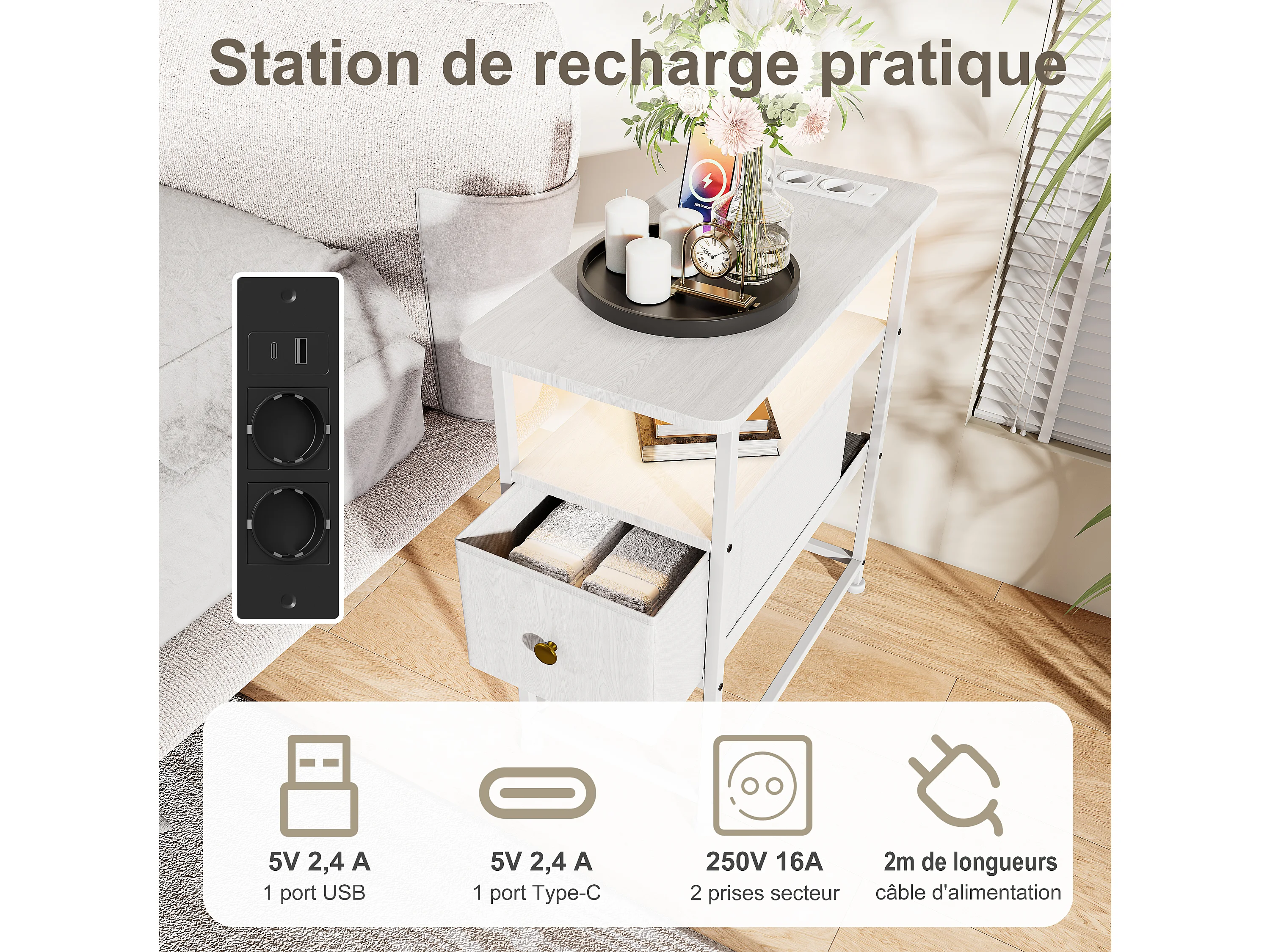 Commode étroite, table de chevet avec fonction de chargement et bande lumineuse, table d'appoint avec tiroirs, 30 x 60 x 62 cm,Blanc