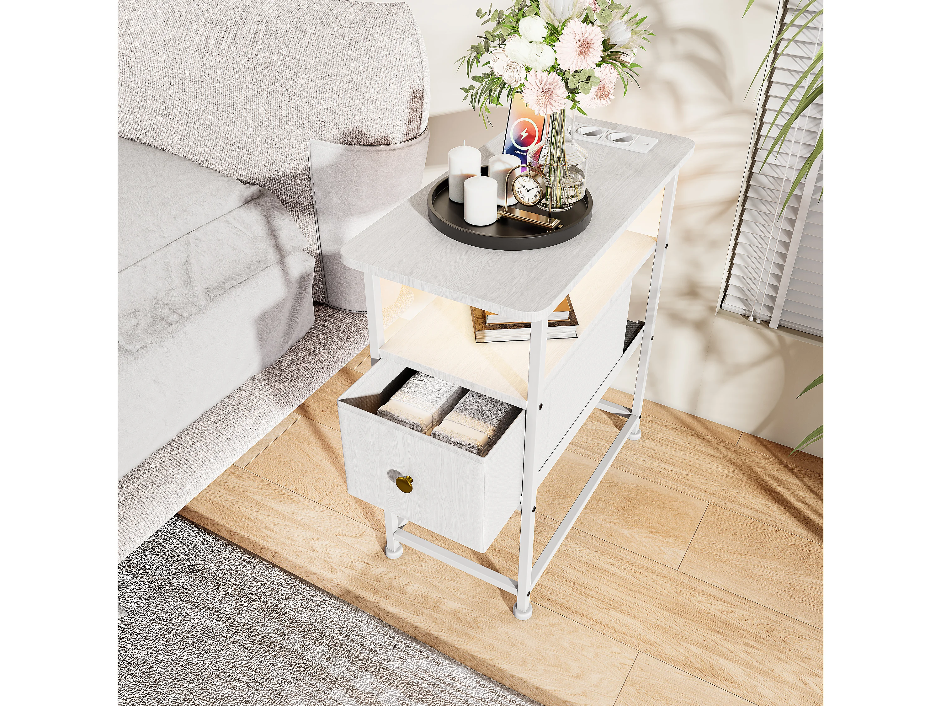 Commode étroite à 3 tiroirs, table de chevet avec fonction de chargement et bande lumineuse, table d'appoint avec tiroirs, 30 x 60 x 62 cm,Blanc