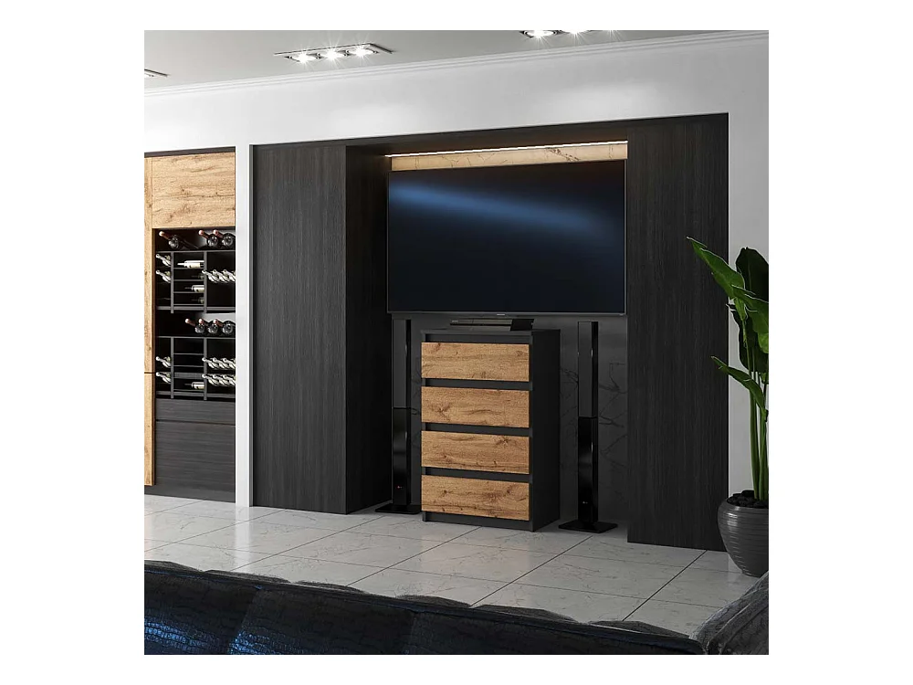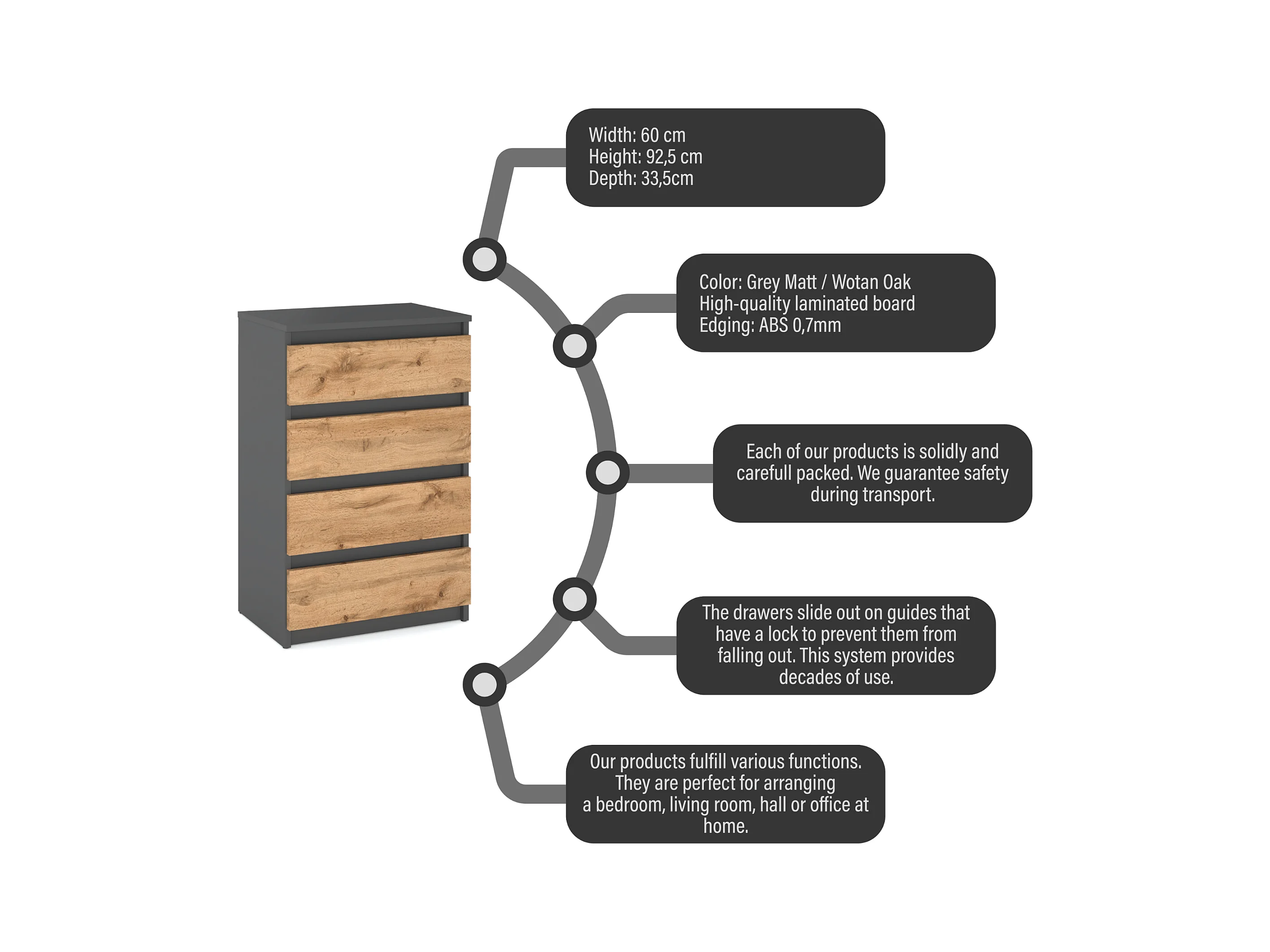 Commode Gris / Chêne Wotan avec 4 tiroirs 60 cm – Meuble TV, armoire pour salon ou chambre