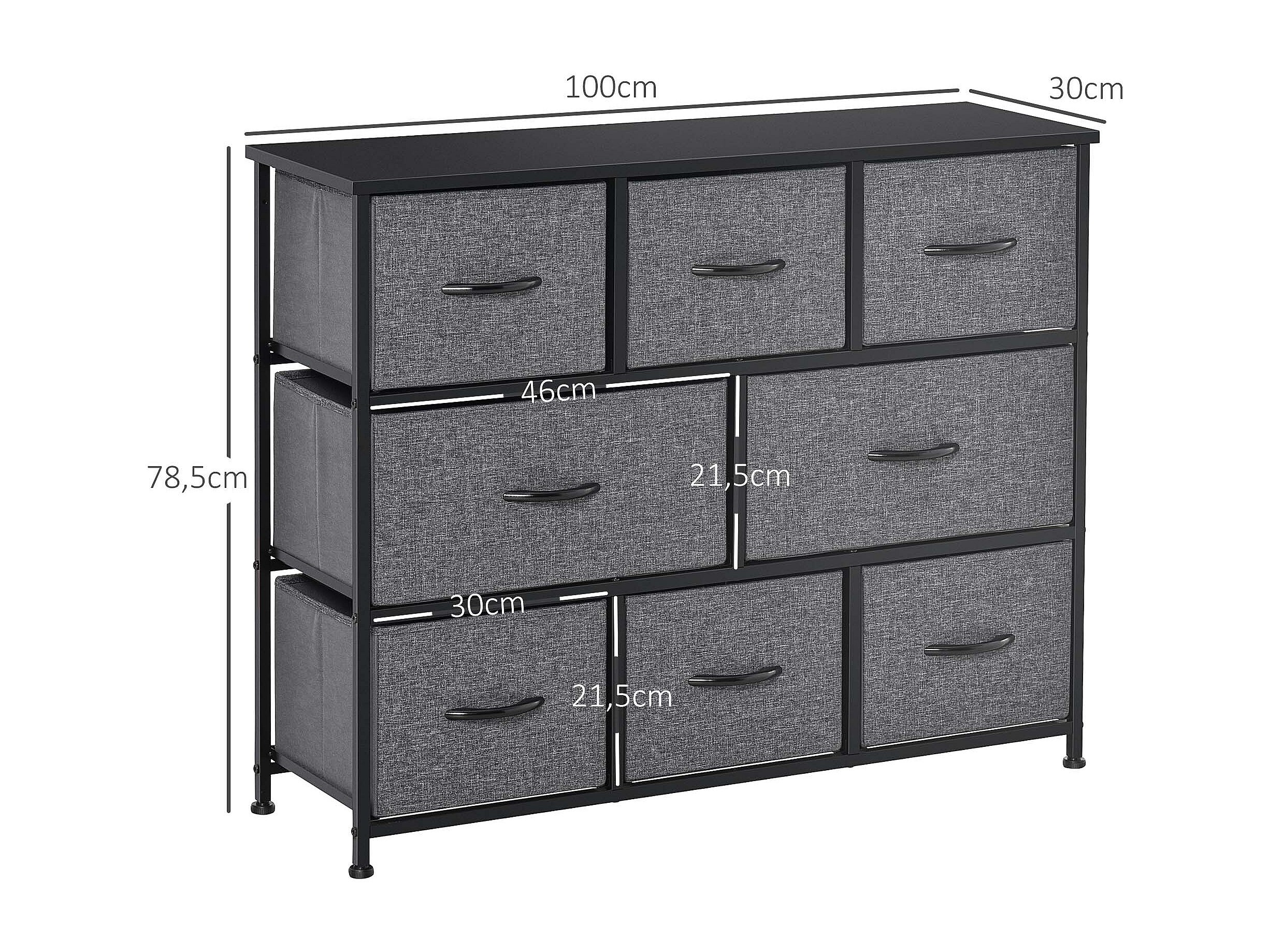 Meuble de rangement commode 9 tiroirs plateau acier MDF noir non tissé gris