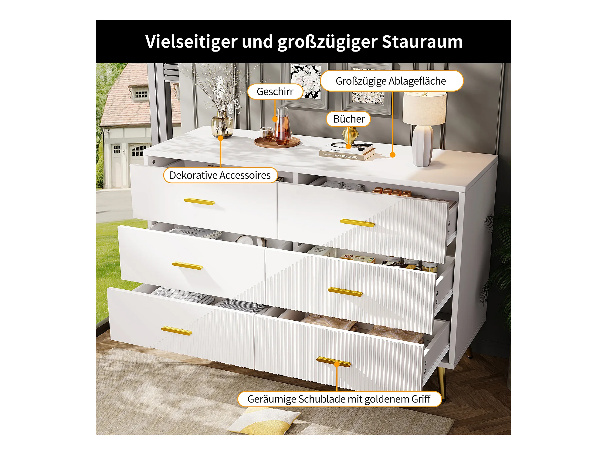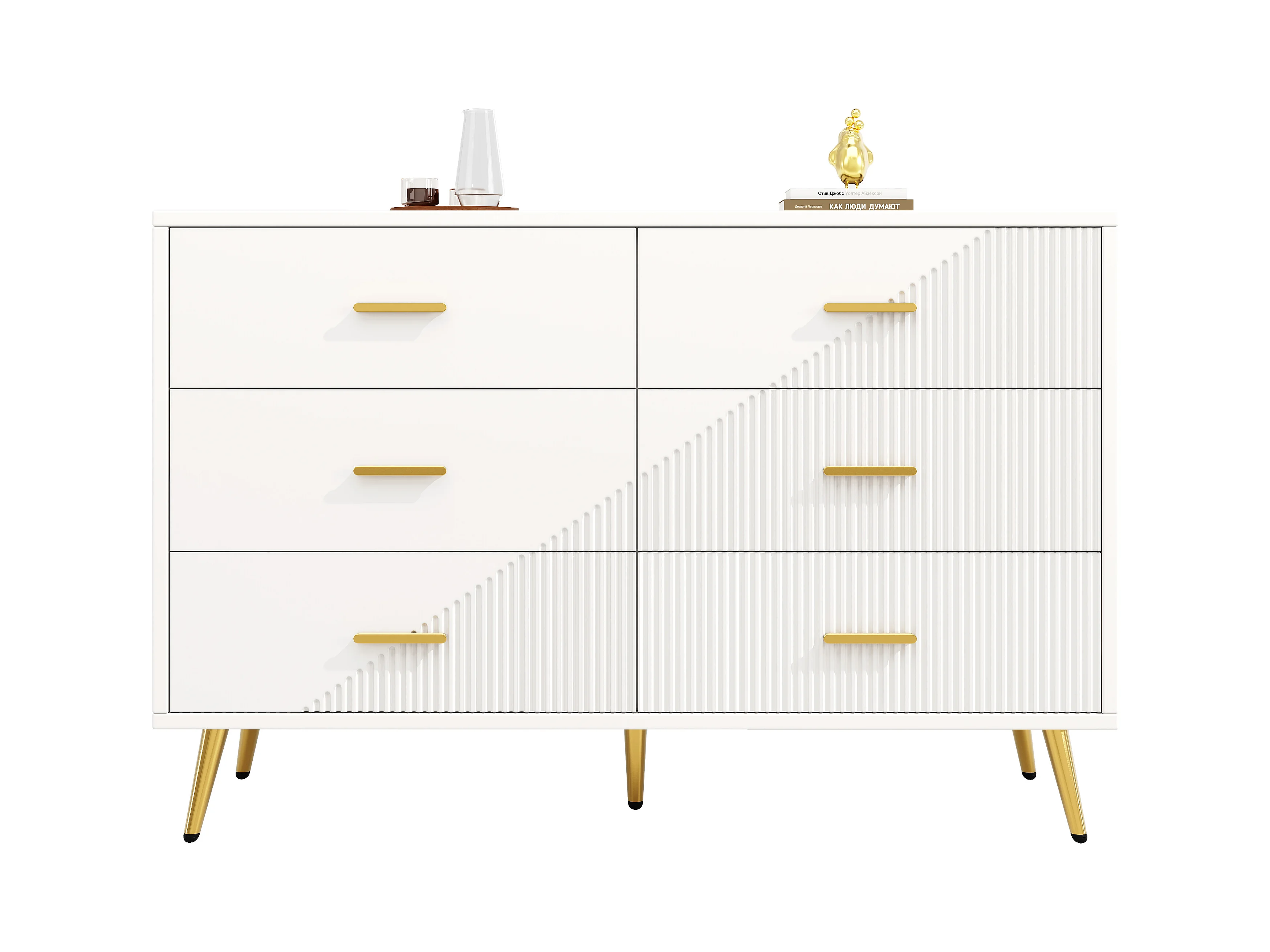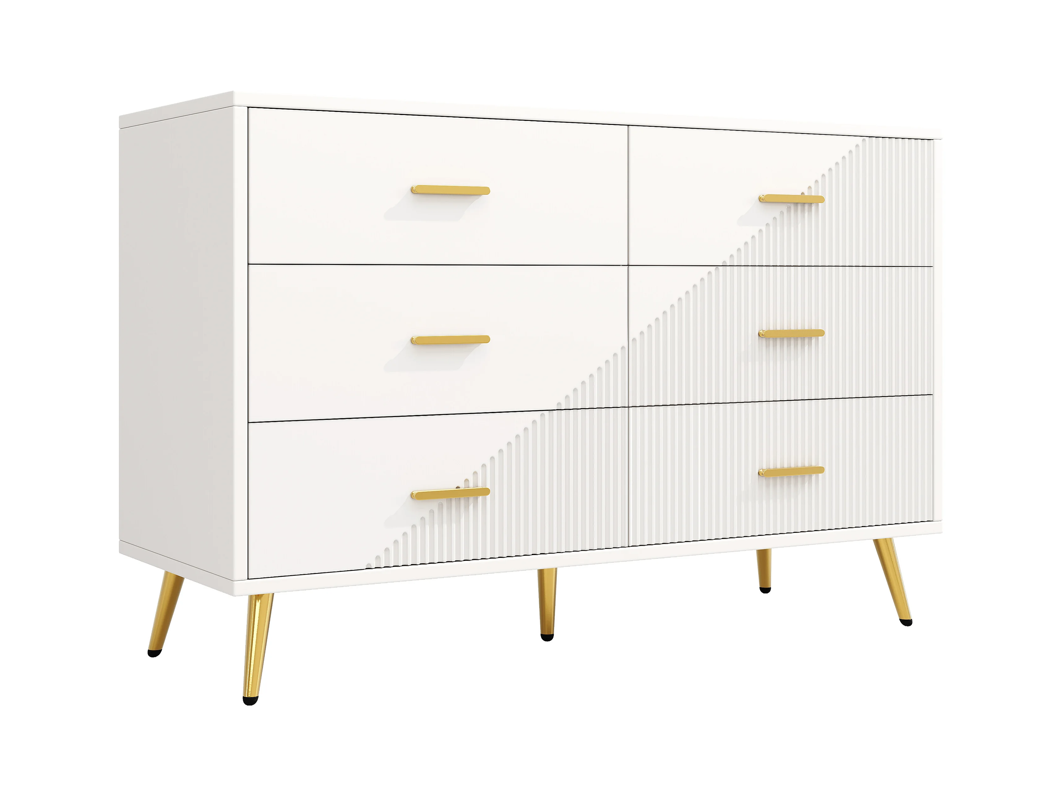 Commode moderne à 6 tiroirs - 120 x 40 x 75 cm - pieds dorés - portes tridimensionnelles - MDF + Métal - blanc