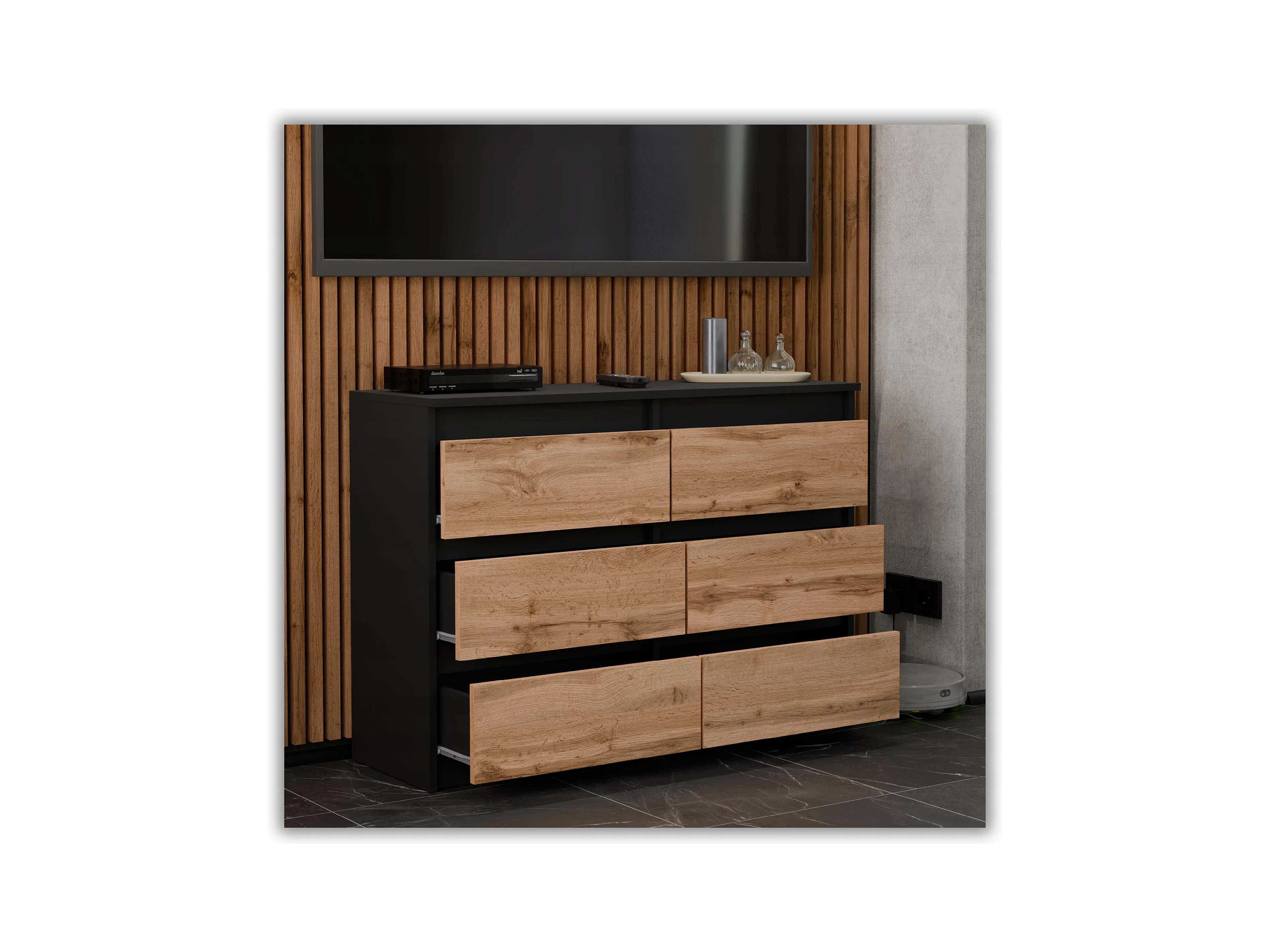 Commode Noire + Chêne Wotan 100 cm – 6 tiroirs – Meuble TV spacieux style loft / salon