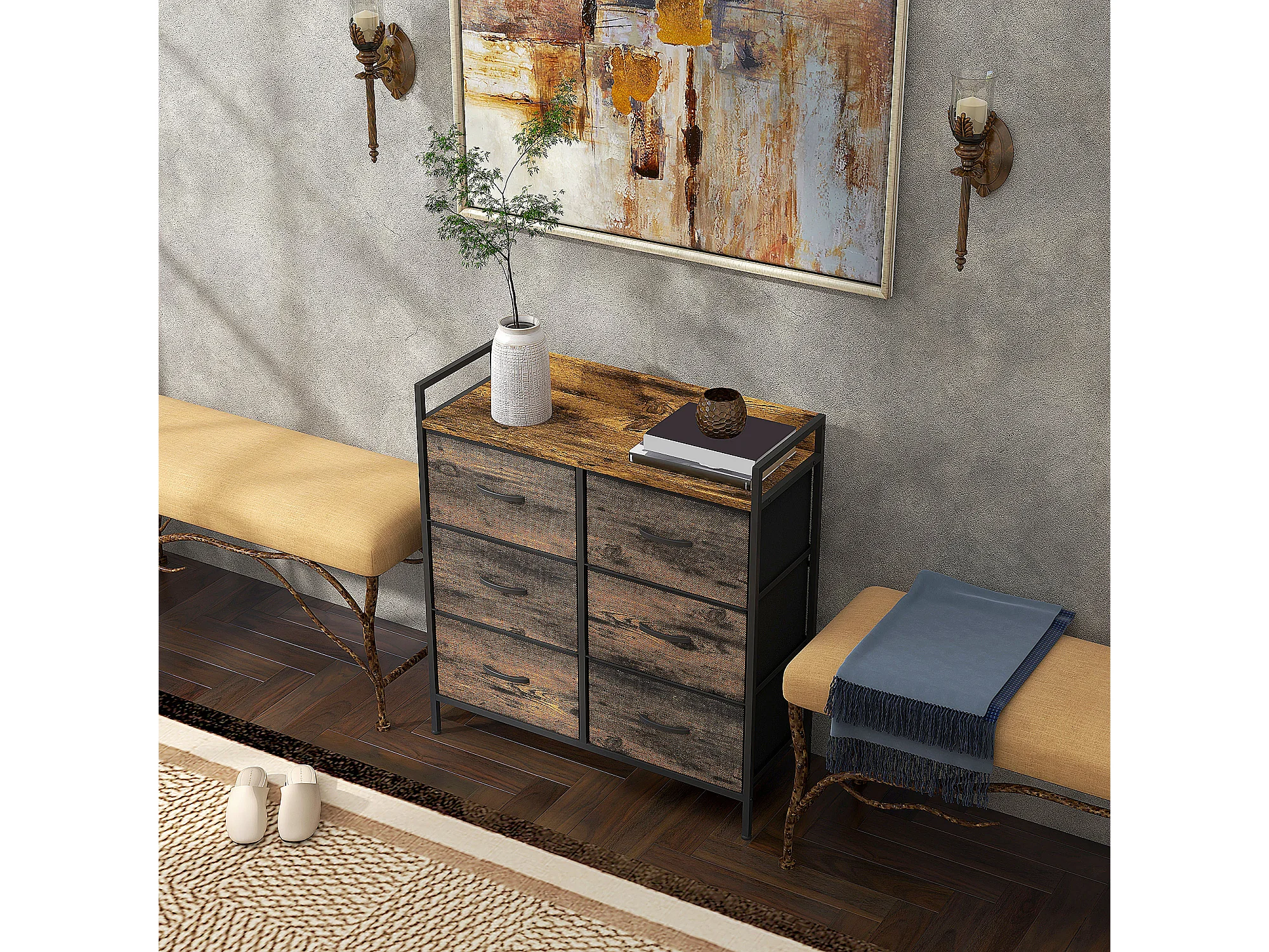 Commode style industriel - 6 tiroirs, étagère - châssis métal noir tiroirs non tissés effet bois vieilli