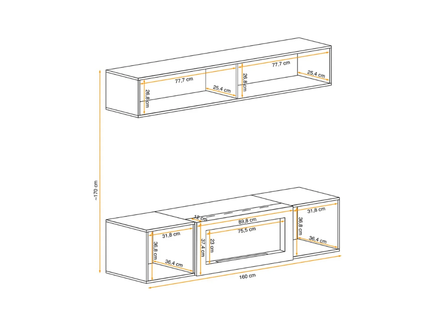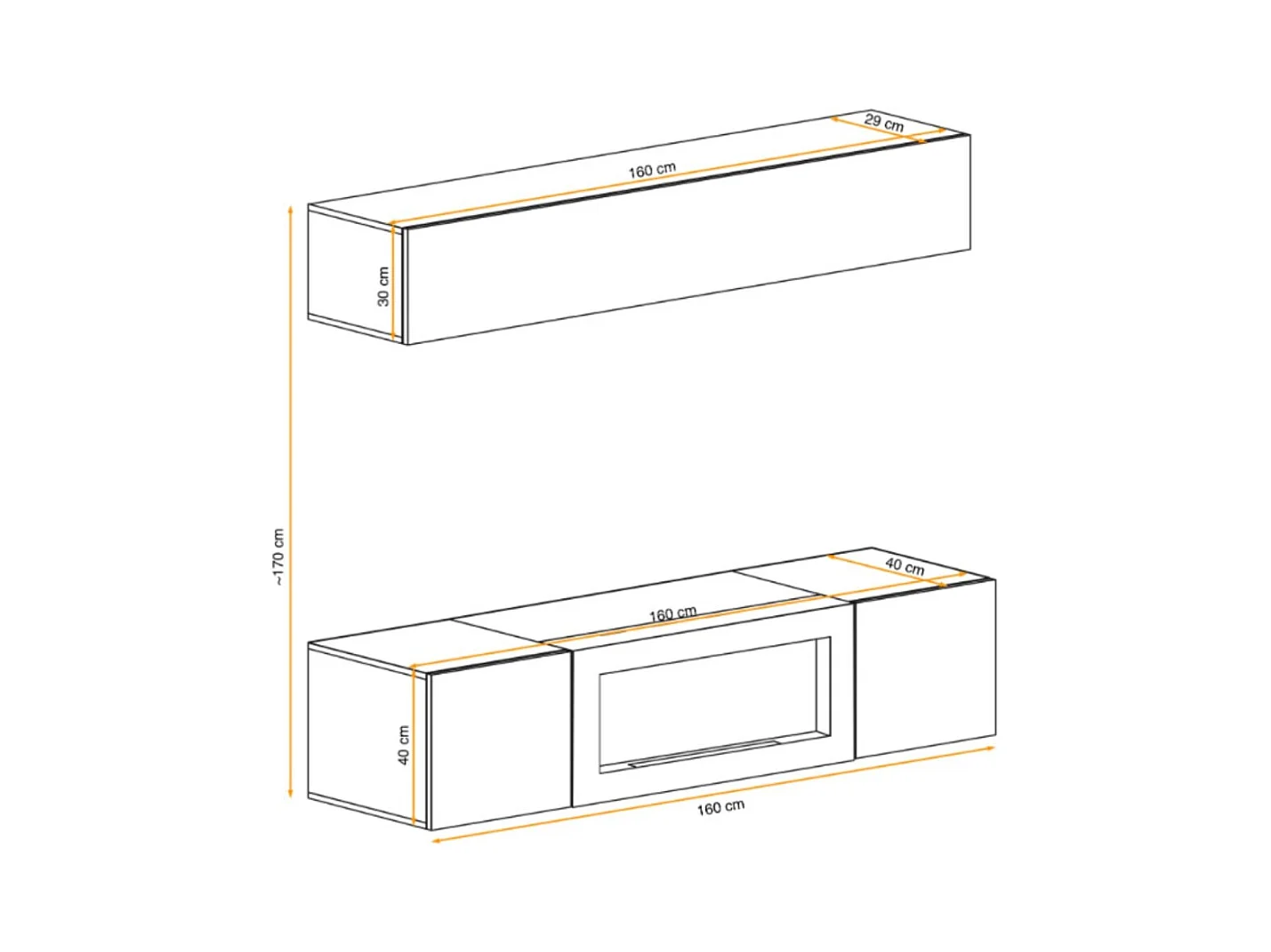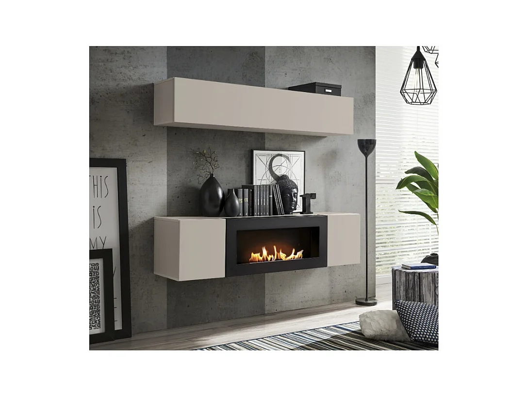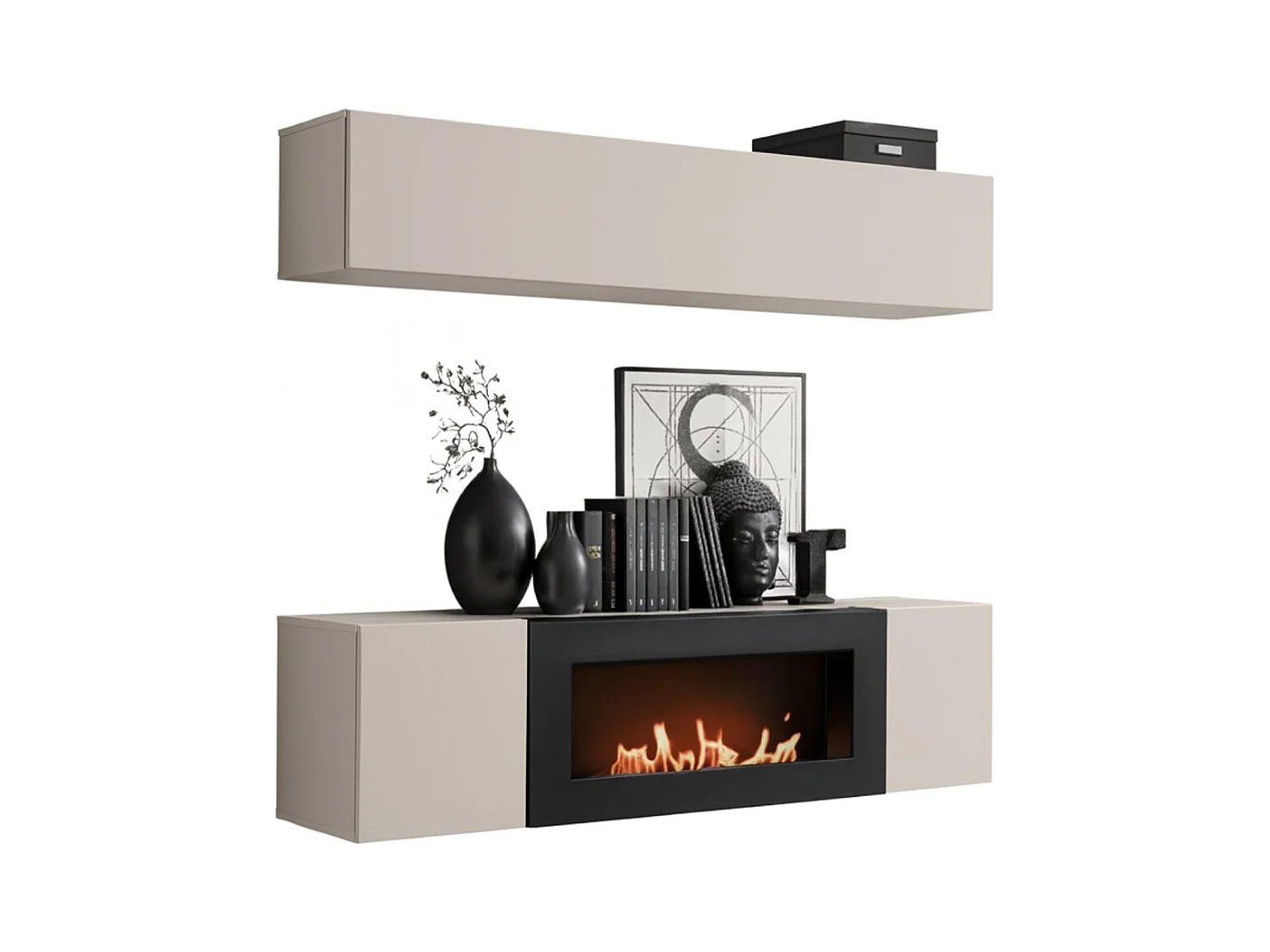 Composition murale FLY cachemire avec colonne suspendue horizontale et meuble TV cheminée bio-éthanol