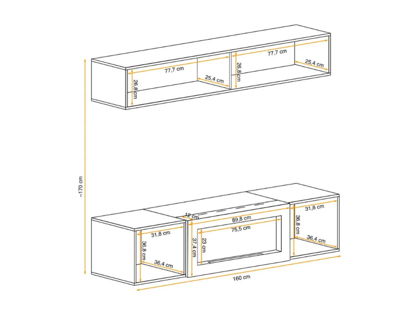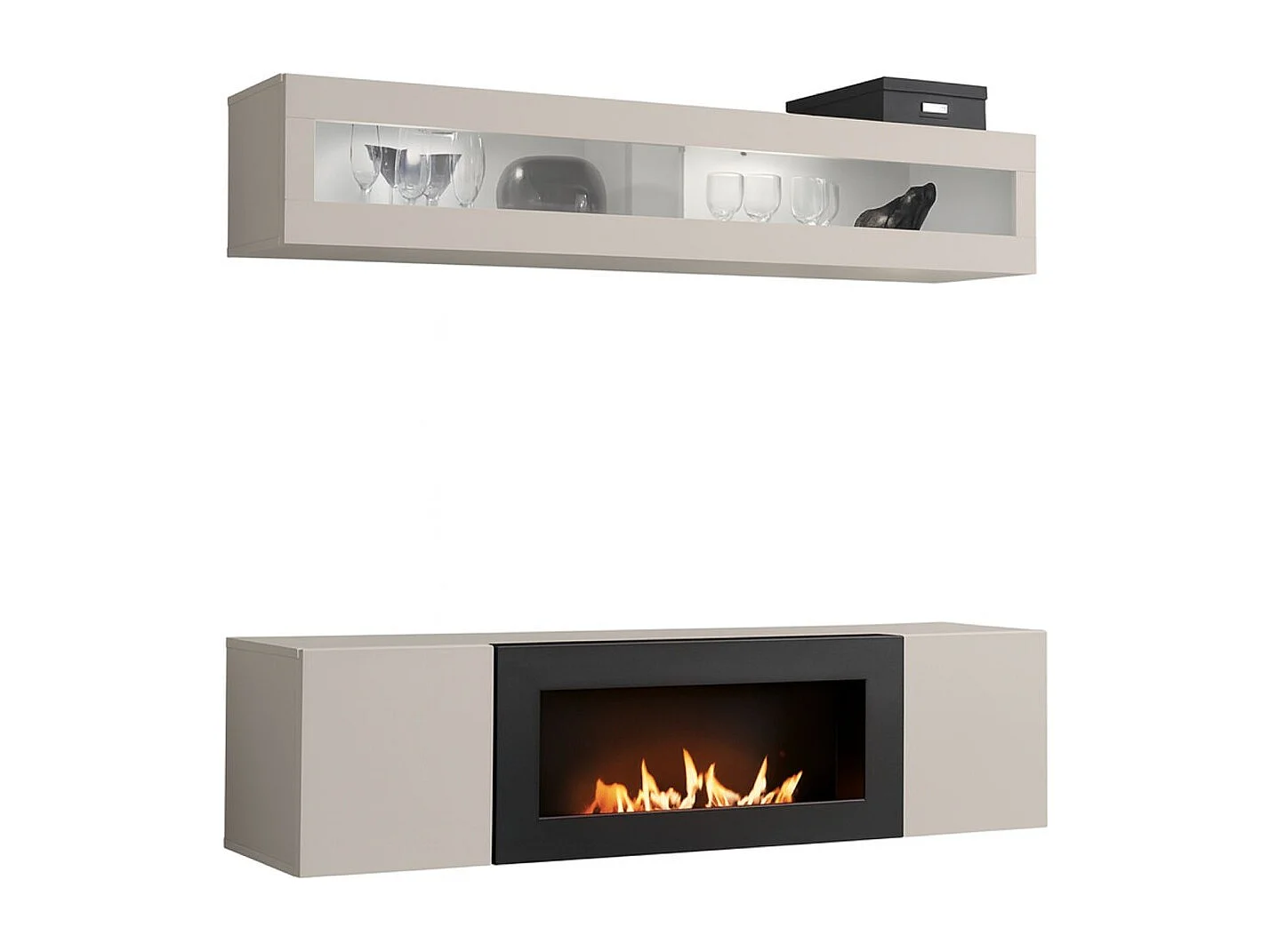 Composition murale FLY cachemire avec vitrine vitrée horizontale et meuble TV cheminée bio-éthanol