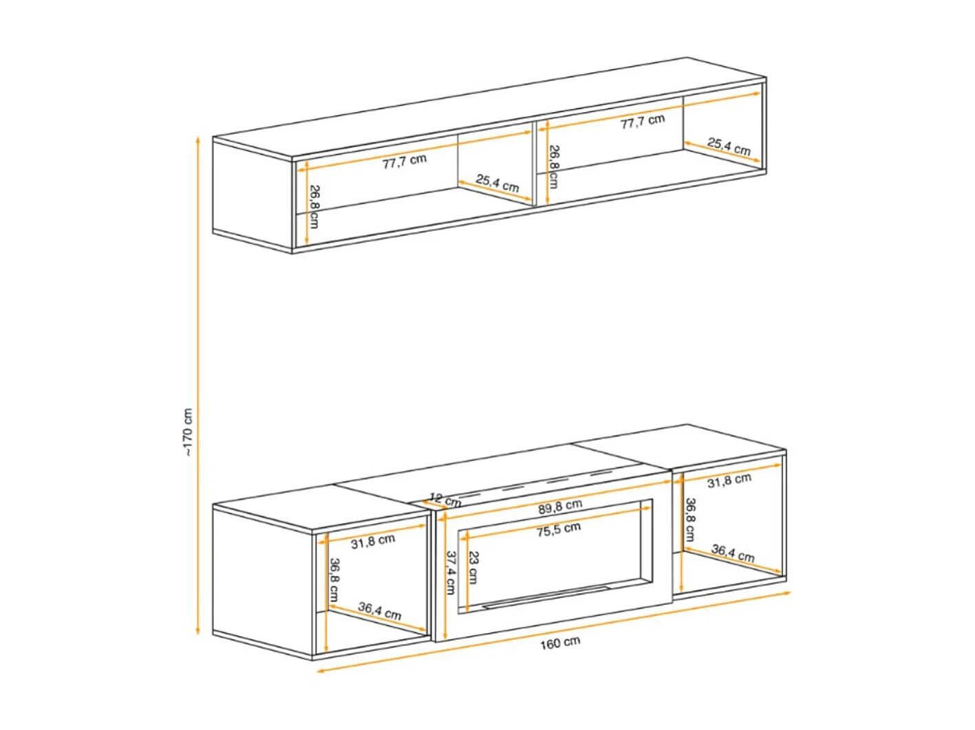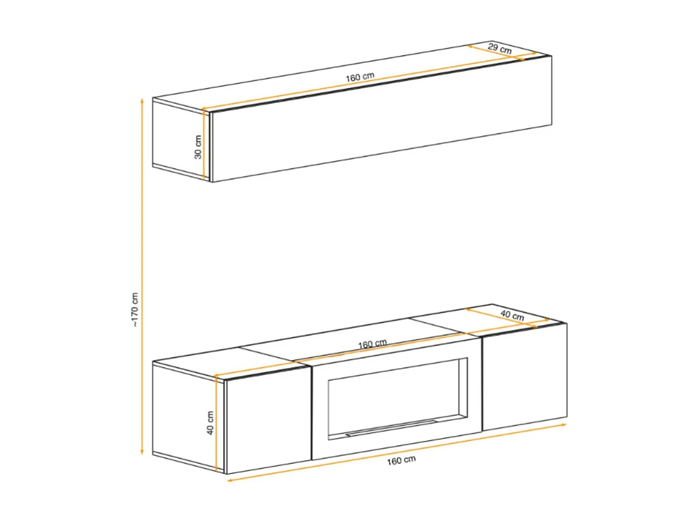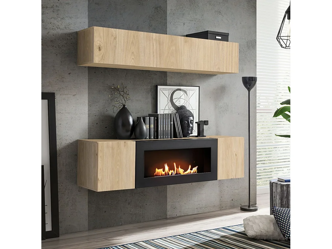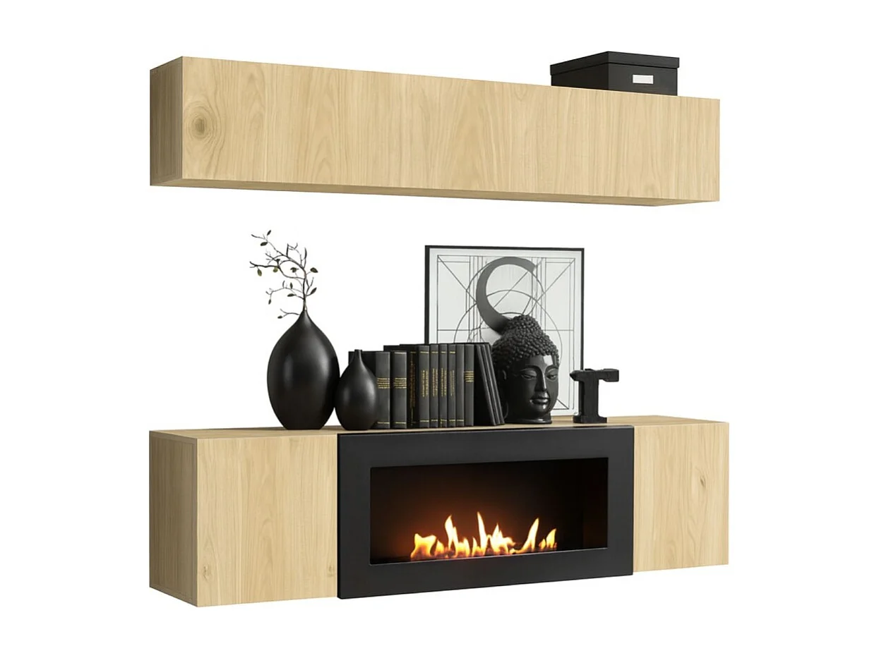 Composition murale FLY – Chêne clair – Vitrine horizontale et meuble TV avec cheminée bio-éthanol