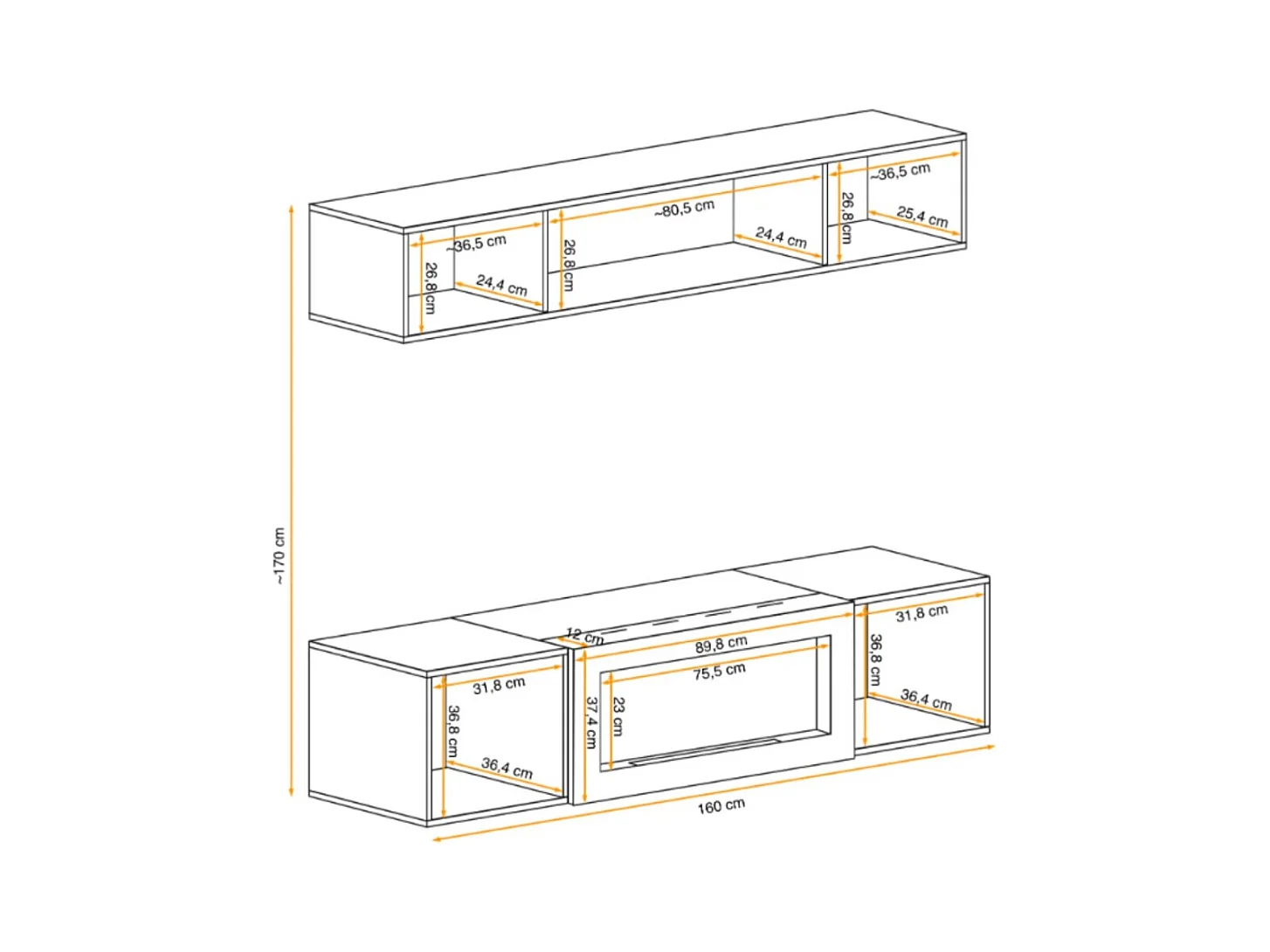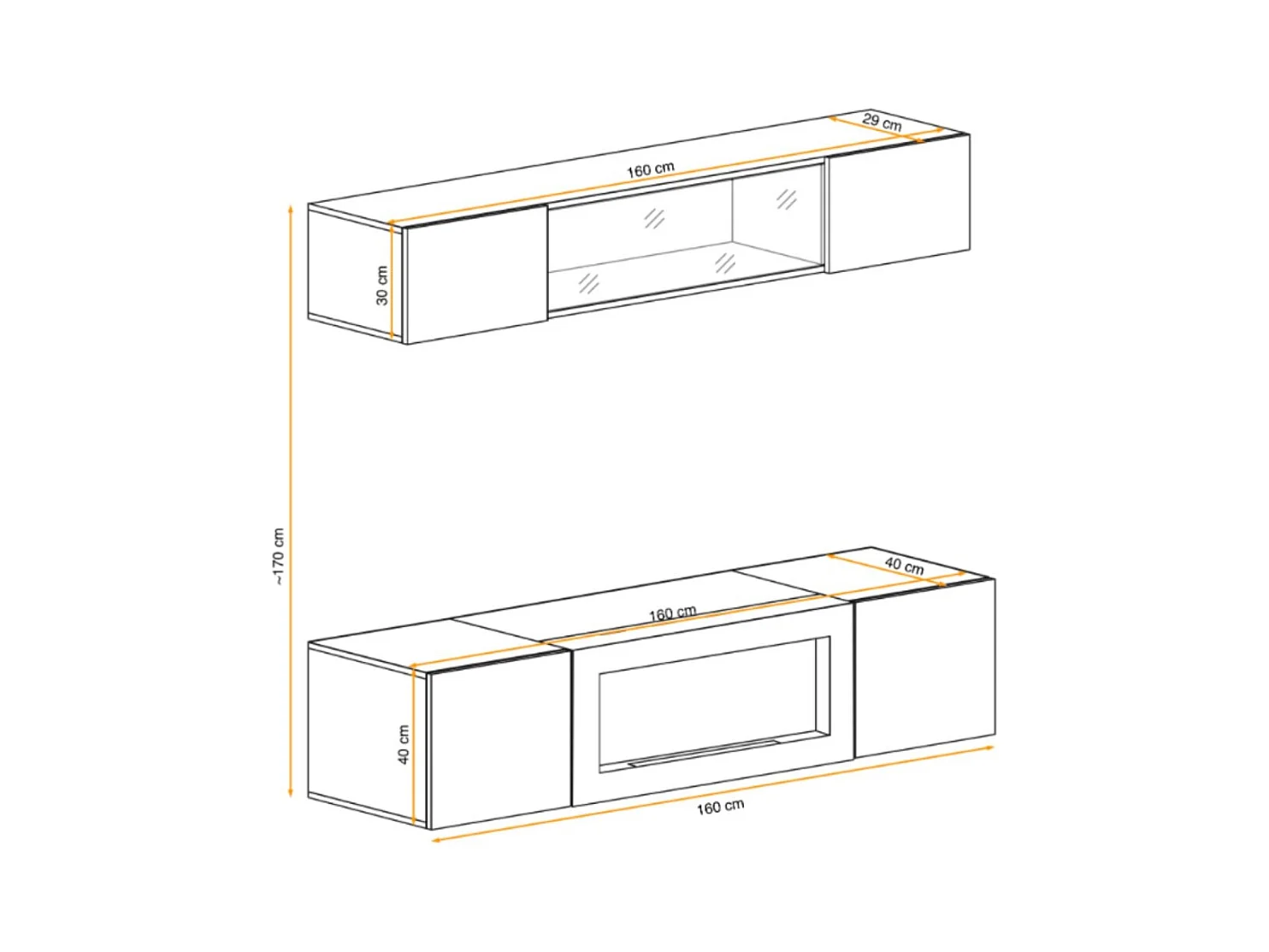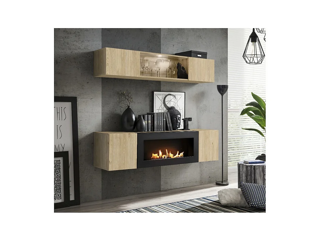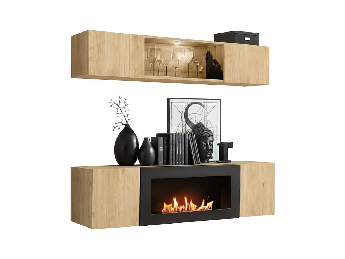Composition murale FLY – Chêne clair – Vitrine horizontale partiellement vitrée et meuble TV avec cheminée bio-éthanol