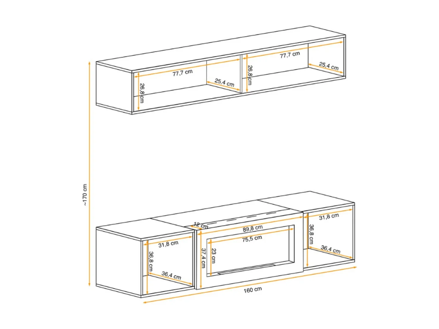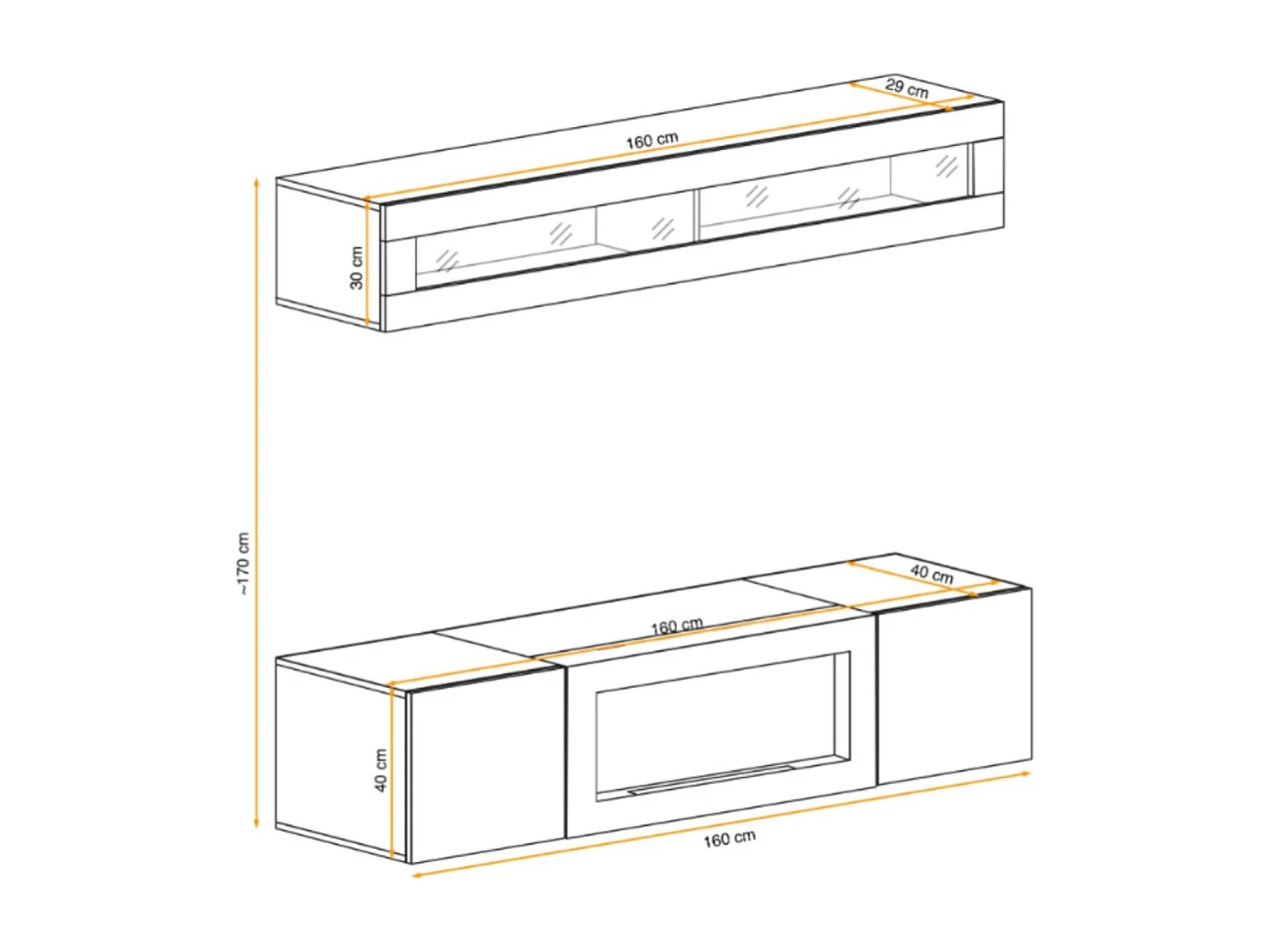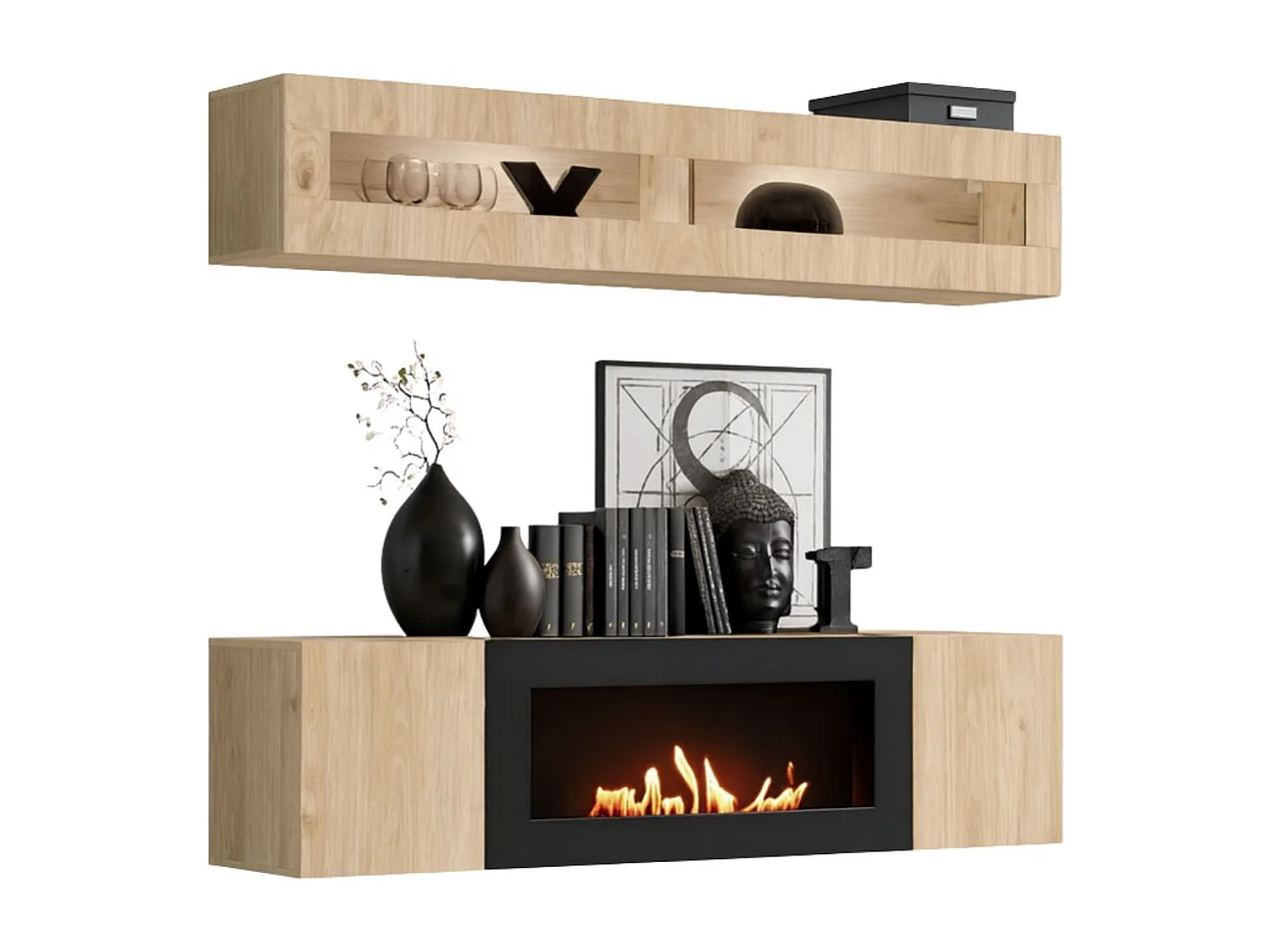 Composition murale FLY – Chêne clair – Vitrine horizontale vitrée et meuble TV avec cheminée bio-éthanol