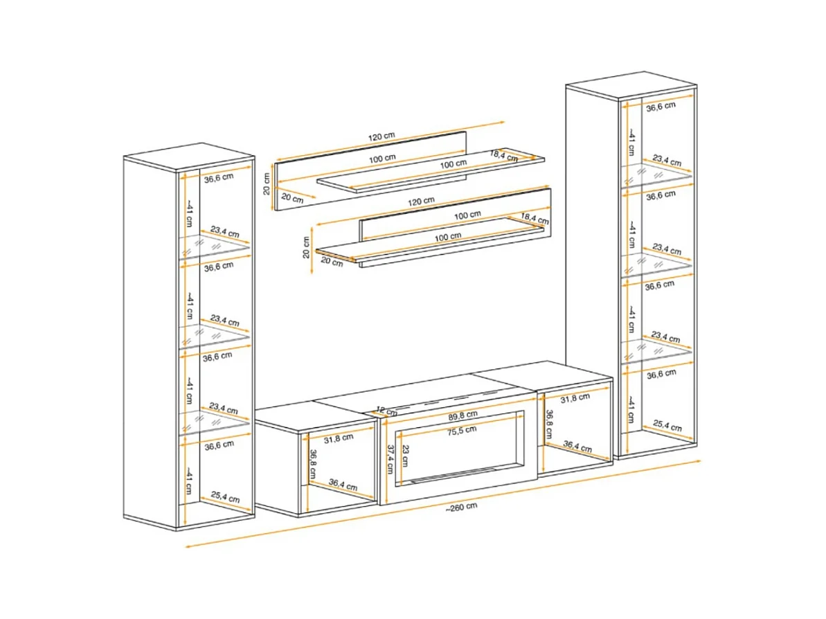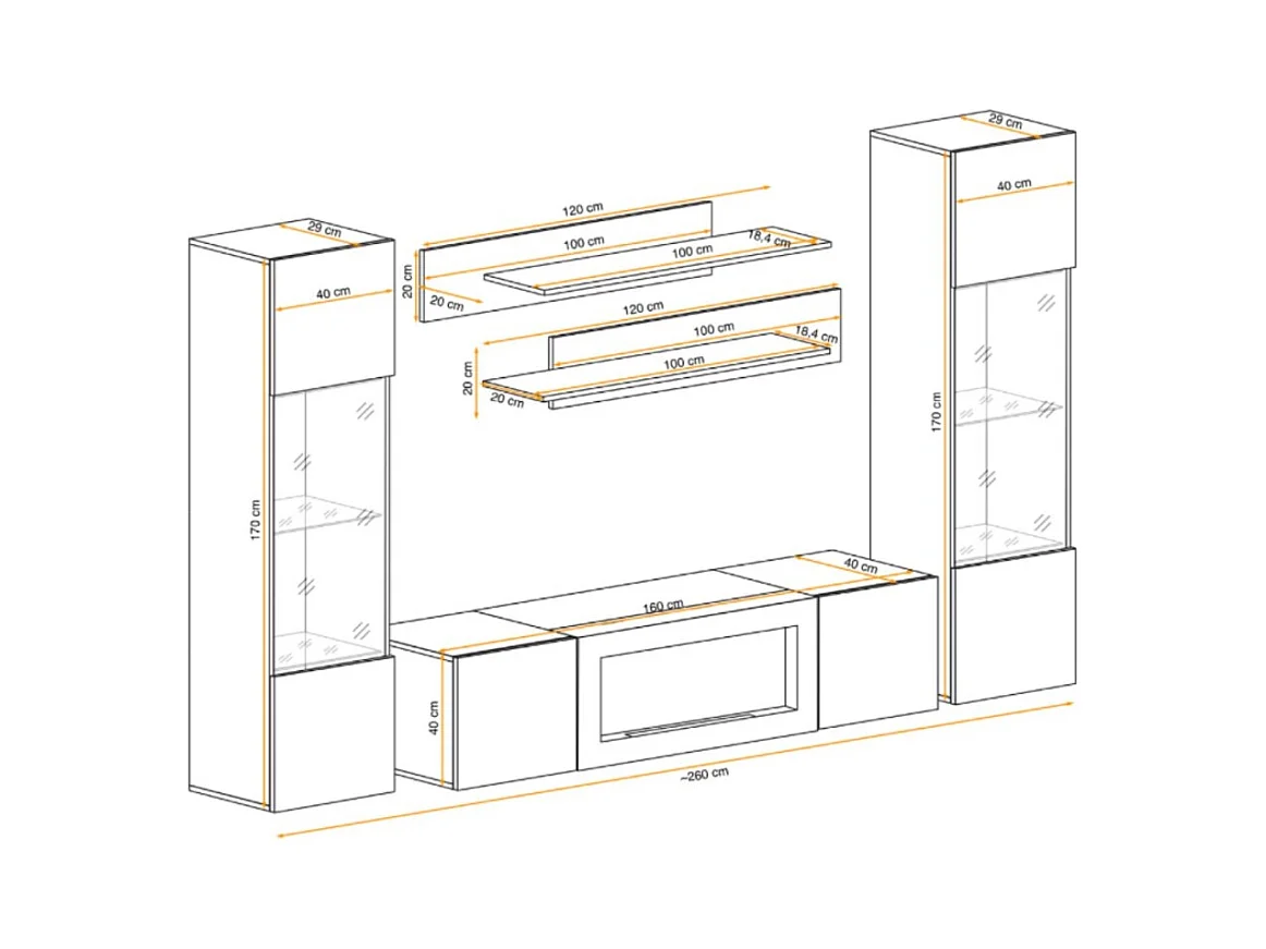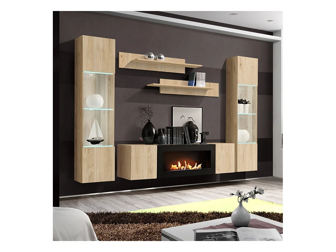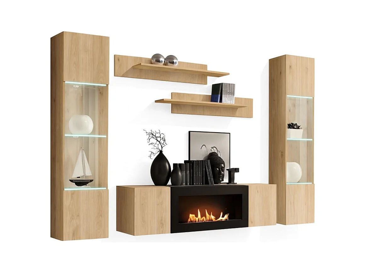 Composition murale FLY – Chêne clair – Vitrines partiellement vitrées LED, étagères et meuble TV avec cheminée bio-éthanol
