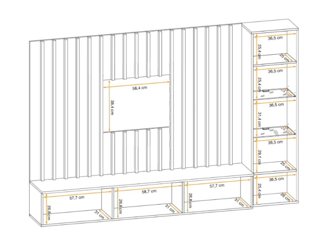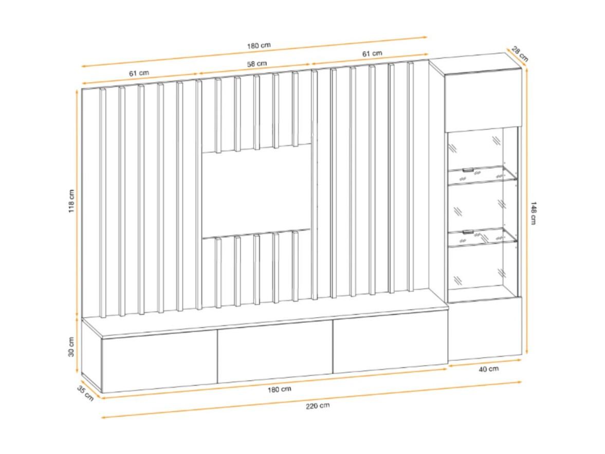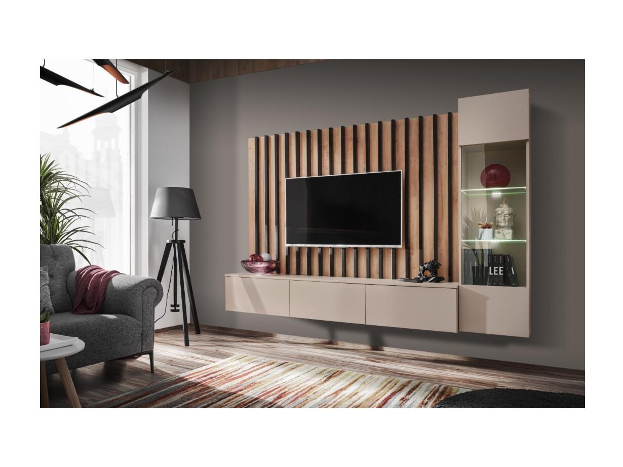 Composition murale TASHYA – Meuble TV, vitrine suspendue et panneau mural – Chêne Artisan et blanc sable