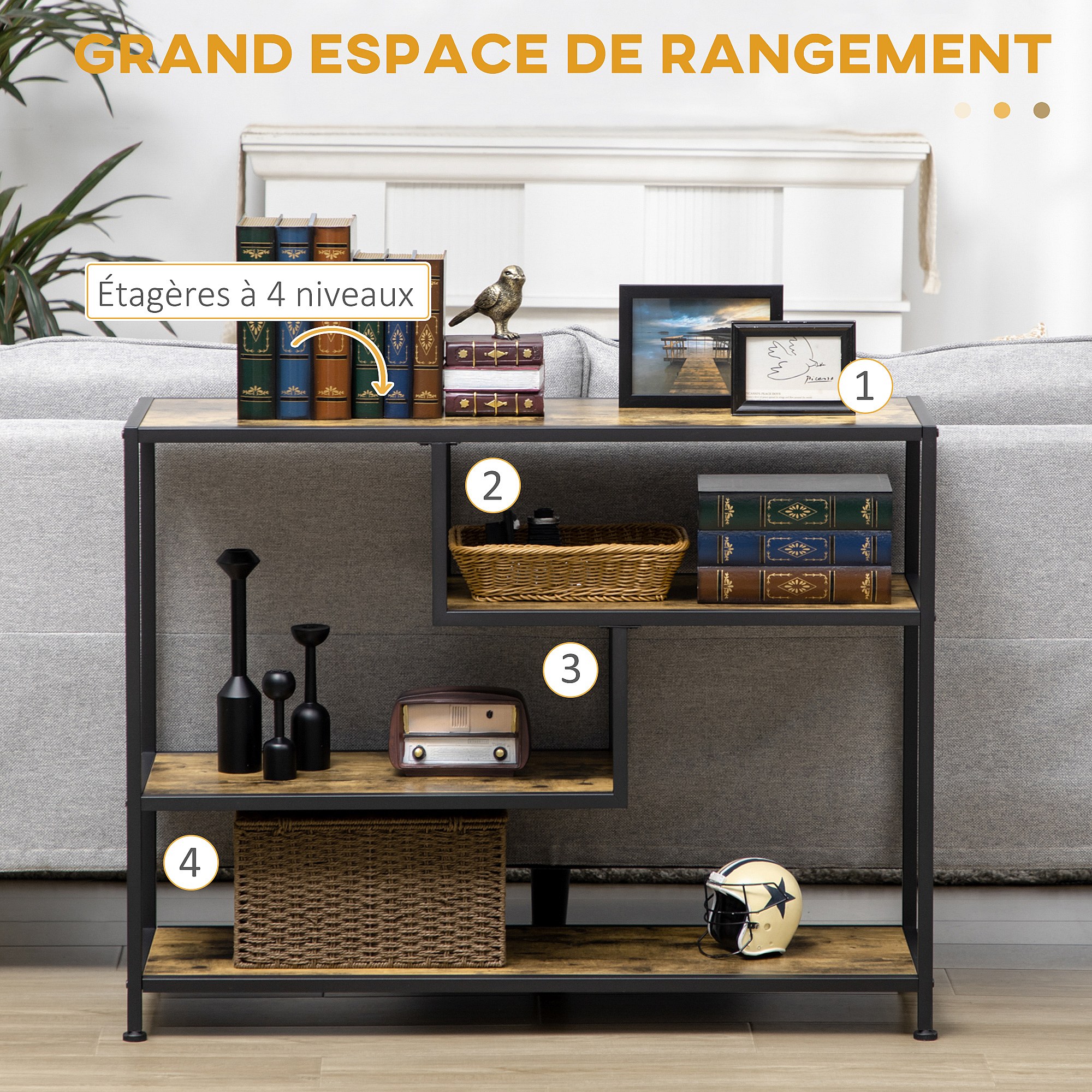 Console design industriel 4 étagères acier noir panneaux aspect bois vieilli