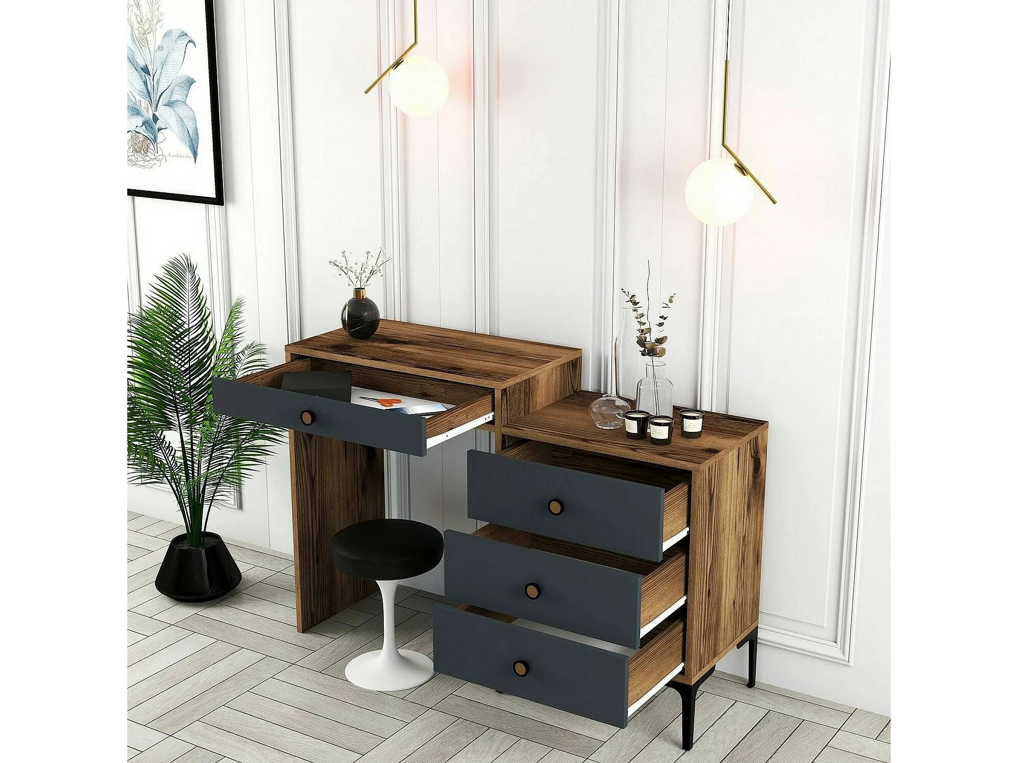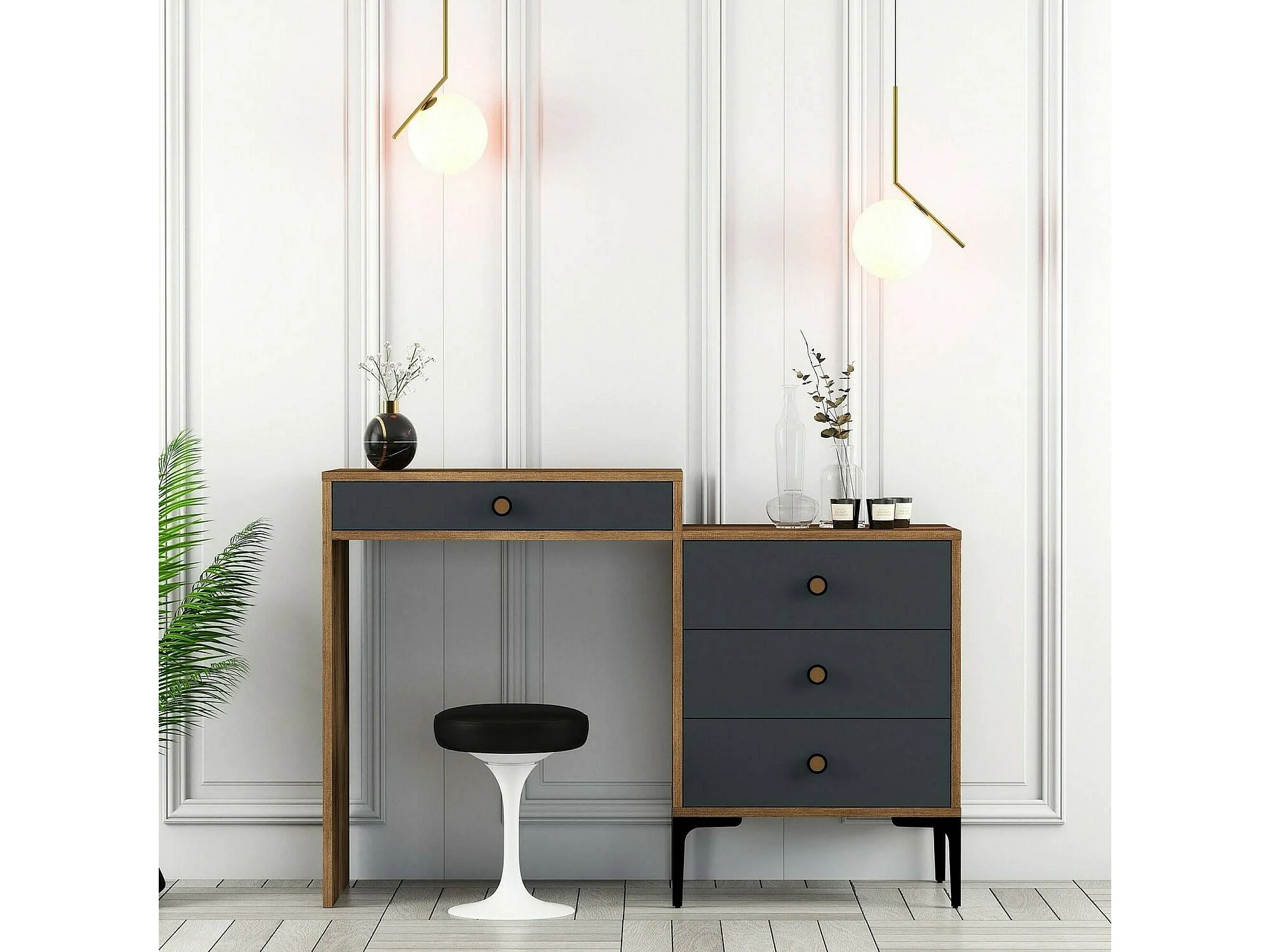 Console Lyra, Table polyvalente, Armoire de rangement, Bureau du couloir, 124x40 h85 cm, Noyer et Anthracite