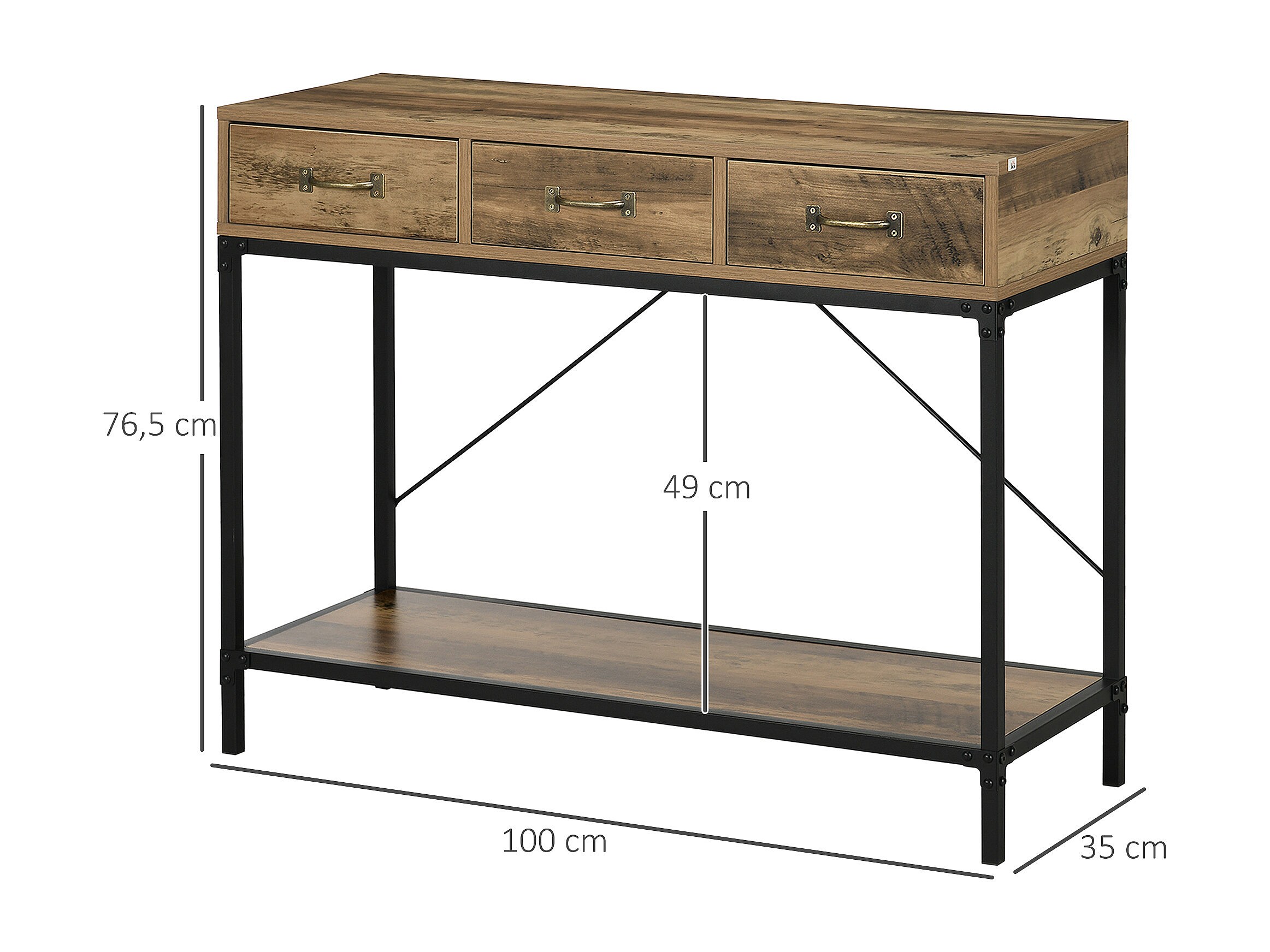 Console table d'appoint design industriel 3 tiroirs étagère acier noir panneaux particules aspect bois vieilli