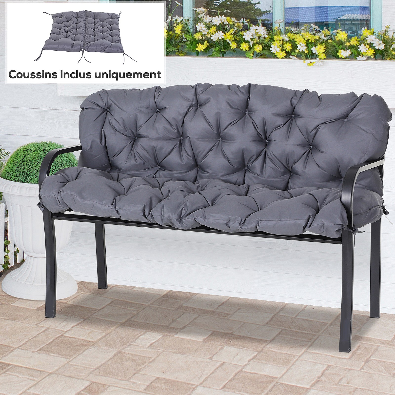 Coussin matelas assise dossier pour banc de jardin balancelle canapé 2 places grand confort 132 x 110 x 10 cm gris