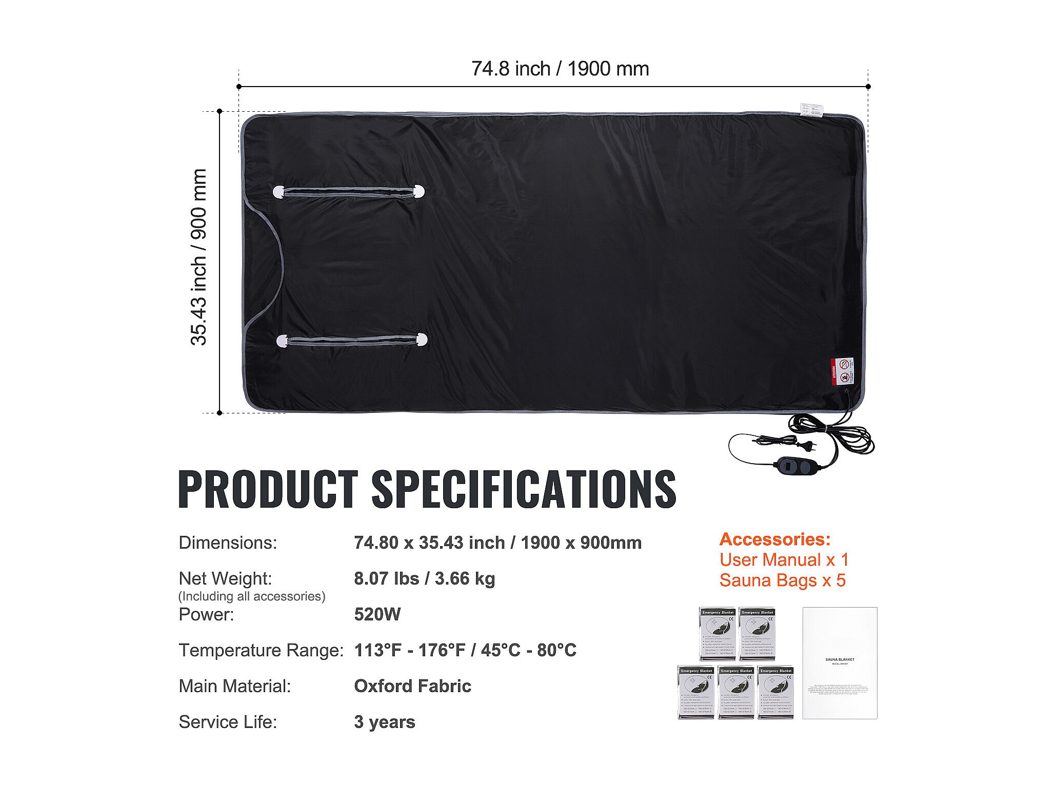 Couverture, SucceBuy Couverture de Sauna 190x90 CM Chauffage Infrarouge Lointain Avec Trous pour Les Bras, Tissu Oxford