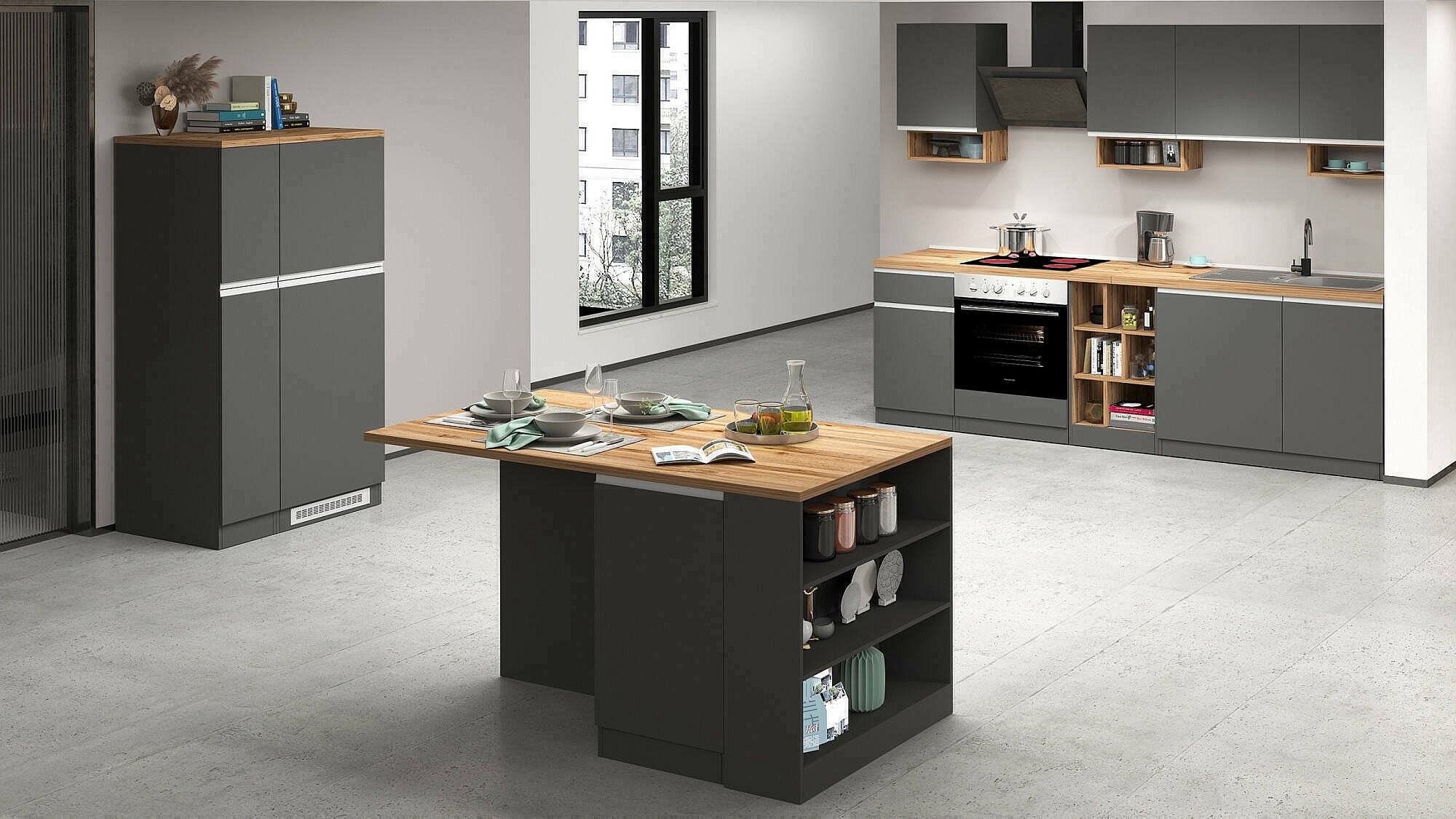 Cuisine complète Danderso, Ensemble avec garde-manger, Meuble de kitchenette, Kit bloc avec îlot et porte-frigo, 100% Made in Italy, Anthracite et Chêne