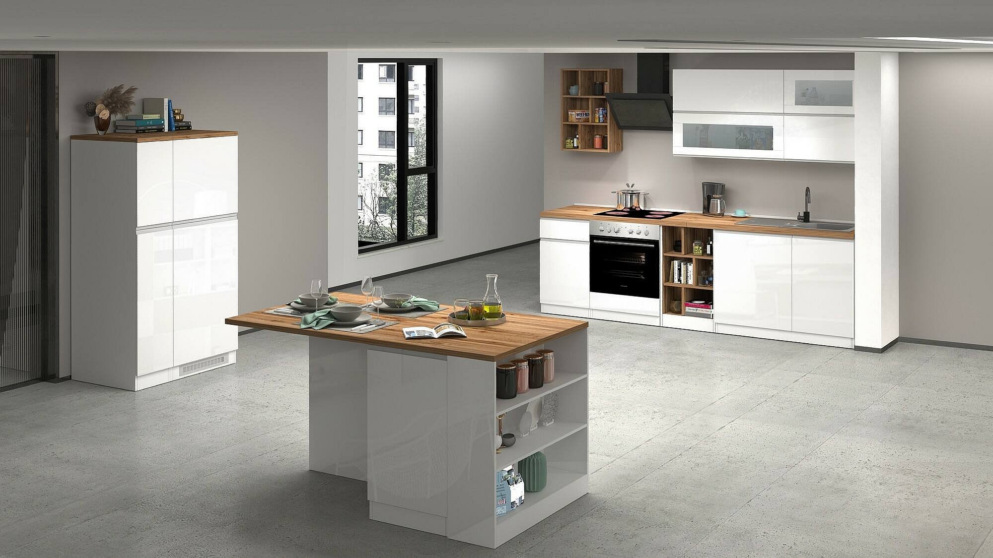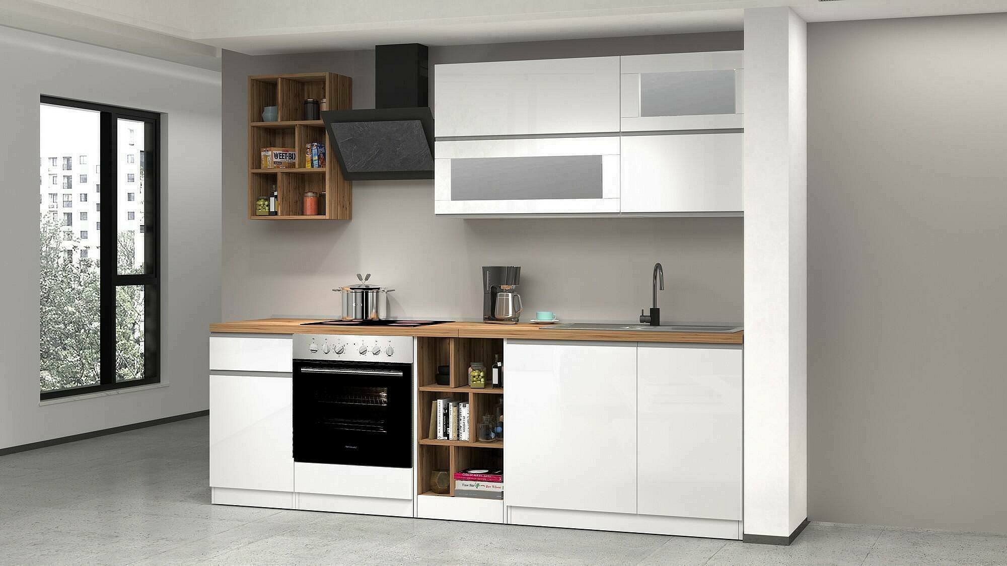 Cuisine complète Dcastill, Ensemble avec garde-manger, Meuble de kitchenette, Kit bloc linéaire, 100% Made in Italy, 255x60h85 cm, Blanc brillant et chêne
