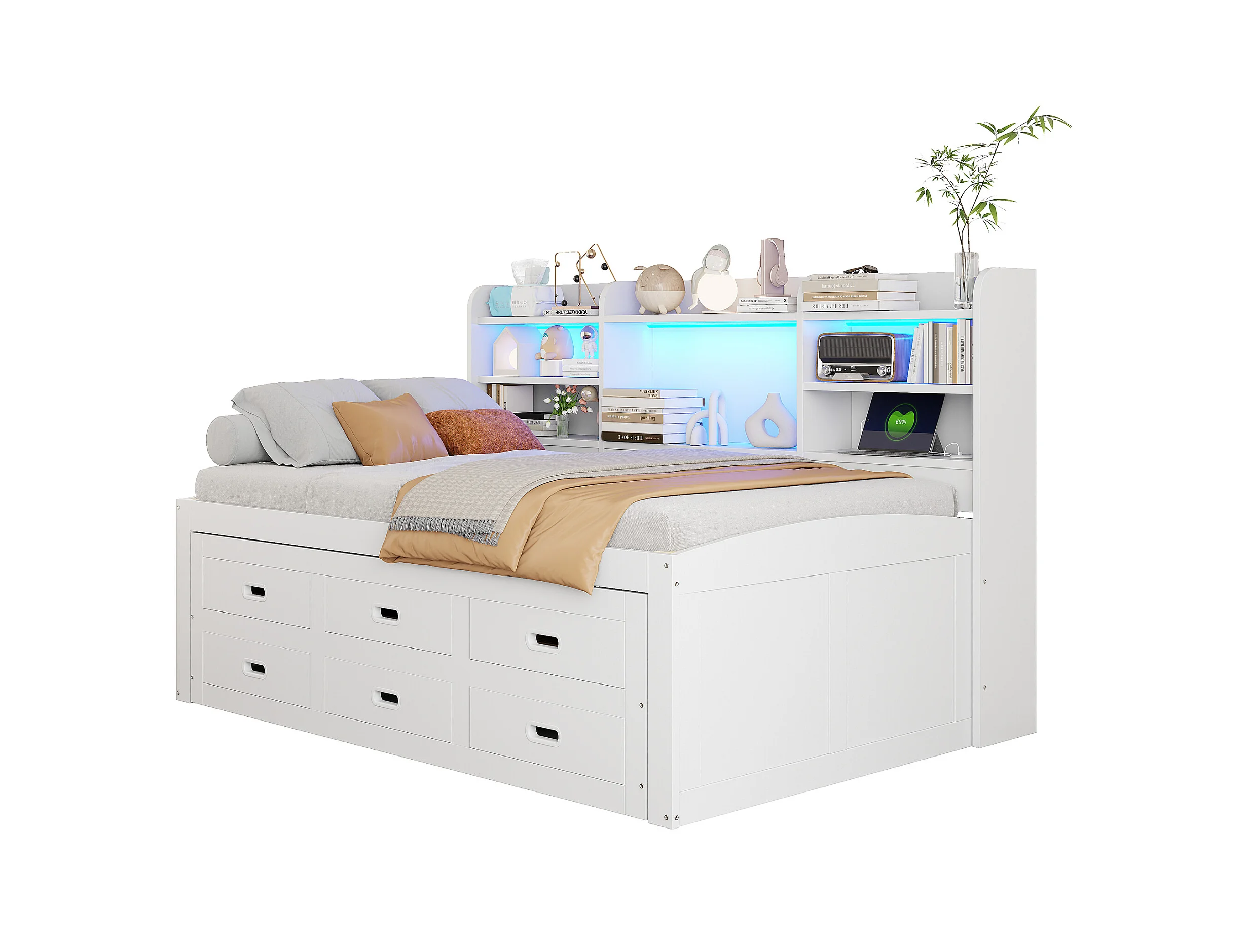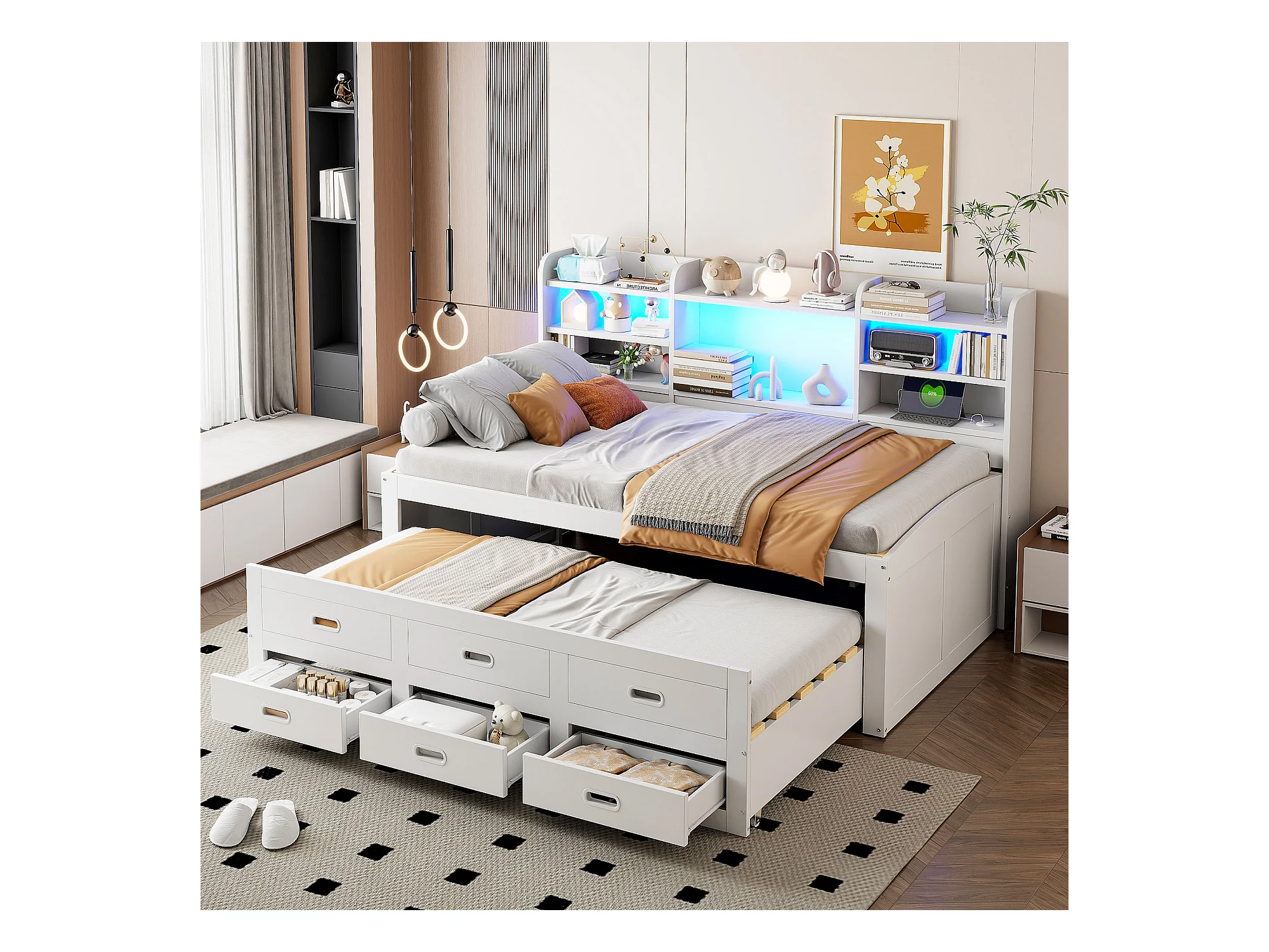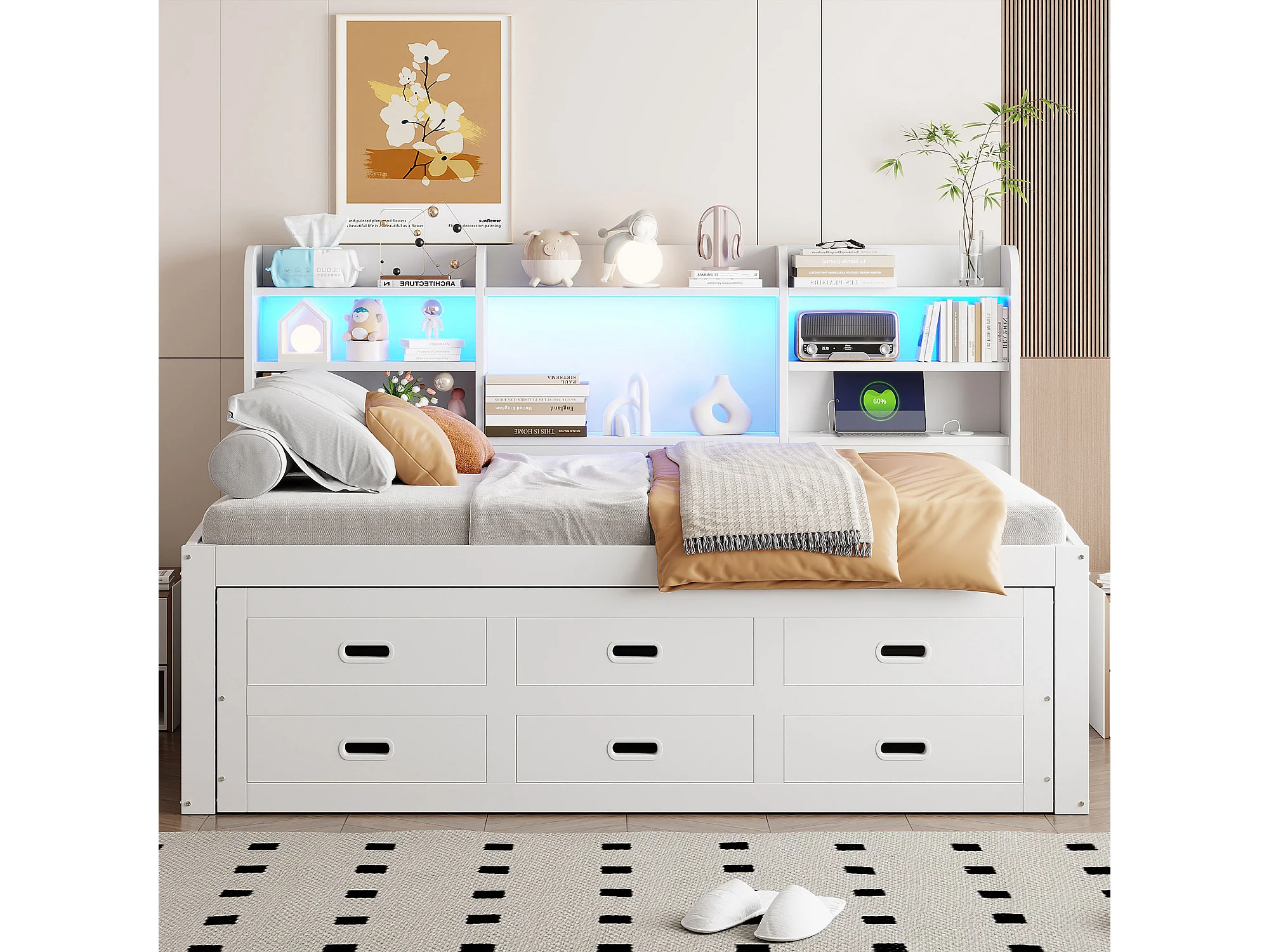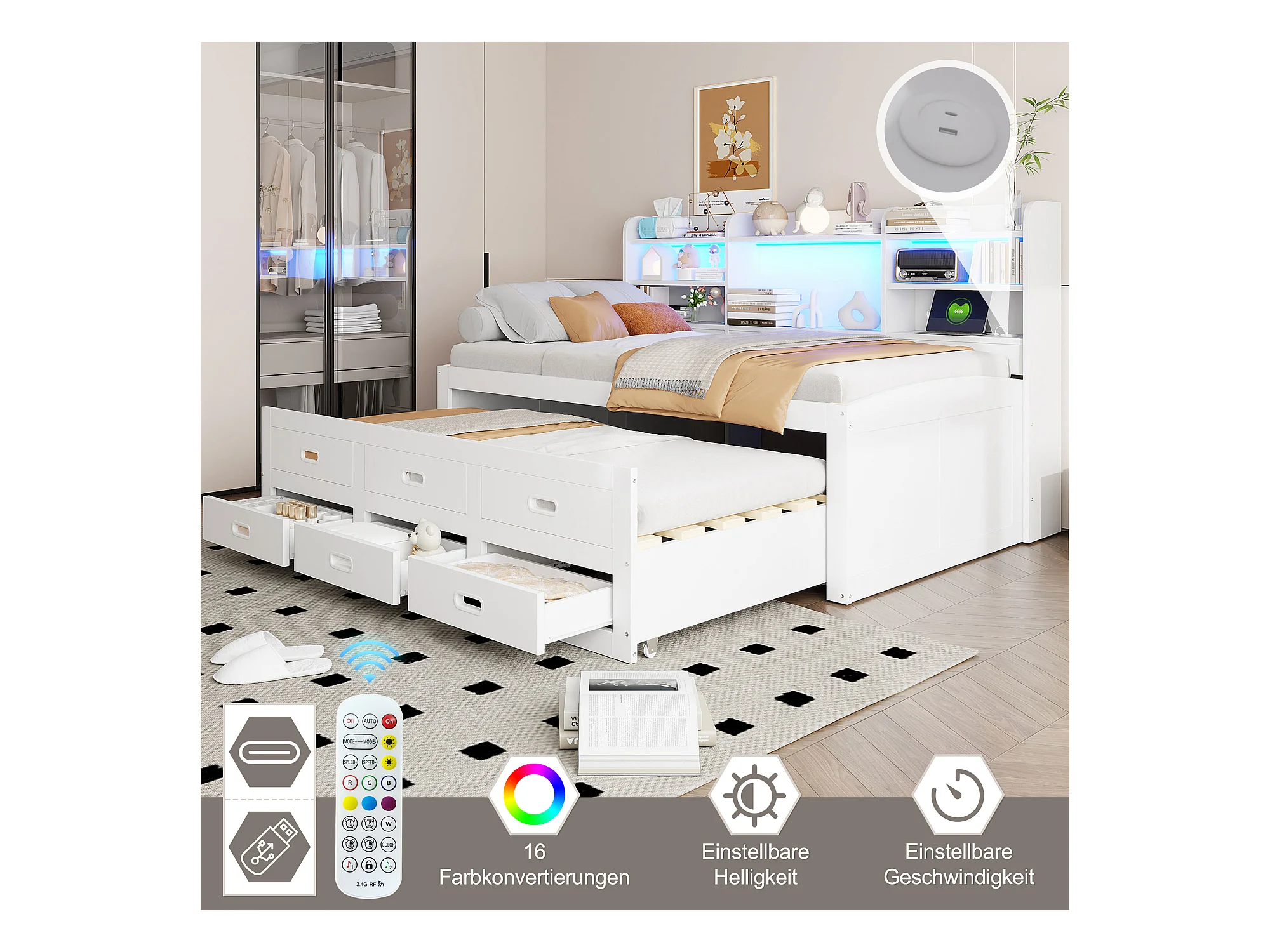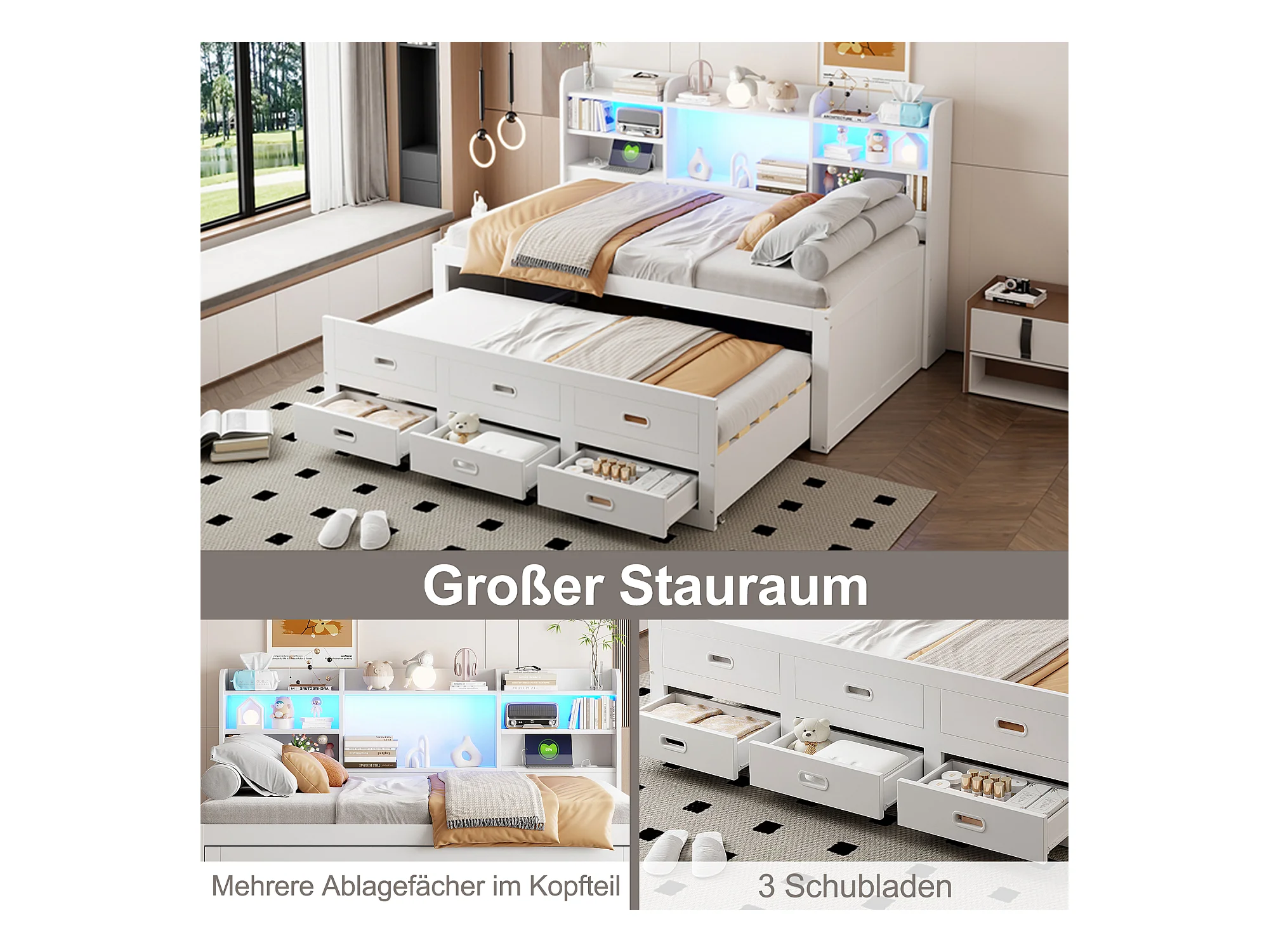 Daybett, Schlafsofa, mit LED-Fernbedienung, 3 Schubladen, Nachttischablage, Multifunktionales Ausziehbett, Weiß (210x210x115 cm)