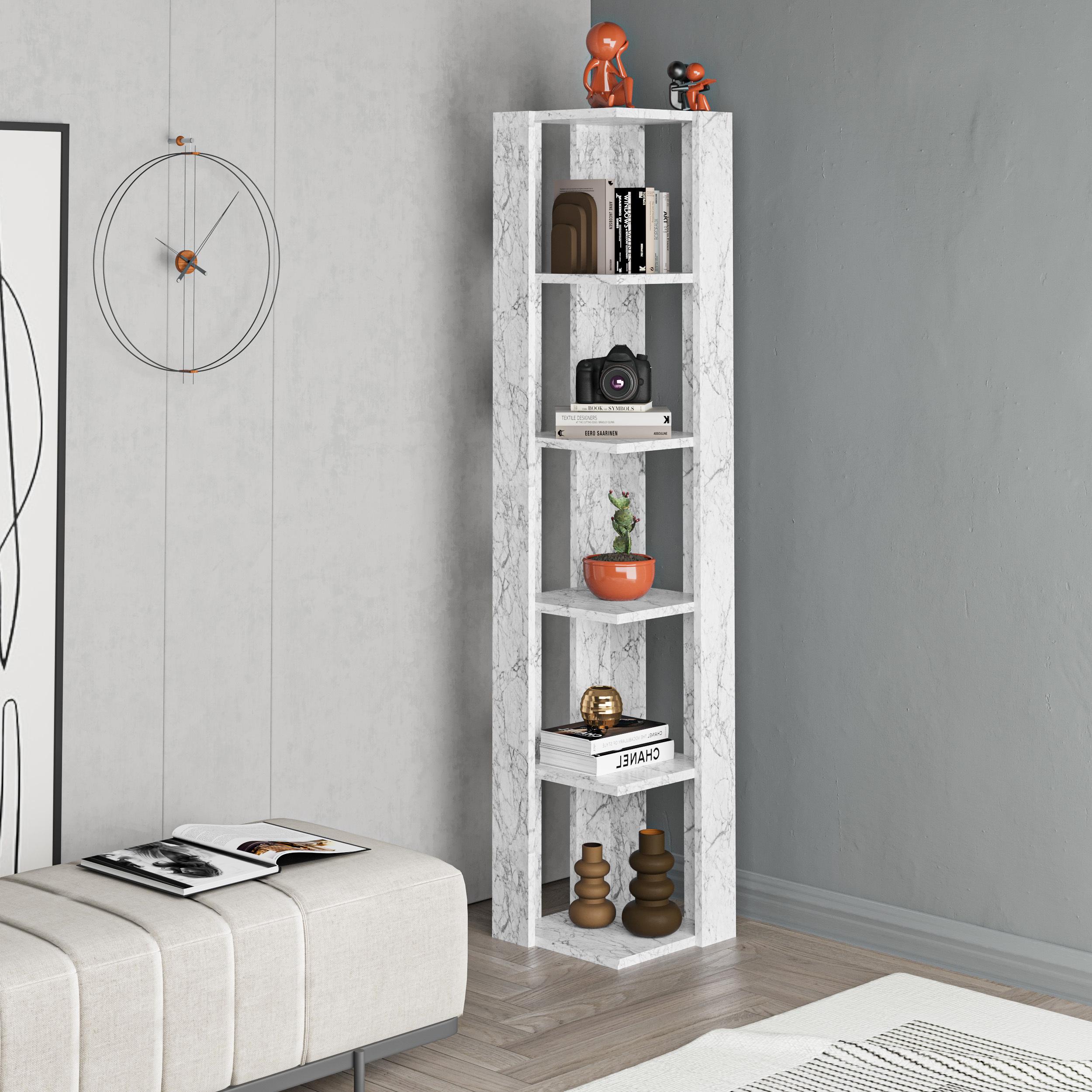 Decortie Nati Tall Corner Bookcase Modern Shelving Unit Space-Saving Storage White Marble Effect 161cm