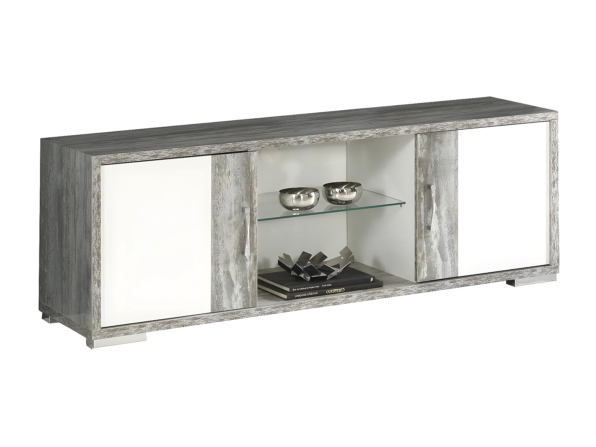 DENYS - Meuble TV 2 Portes Laqué Blanc et Effet Bois Taupe