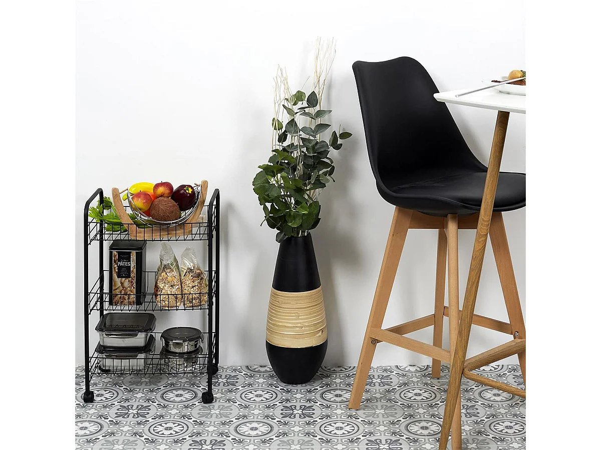KALIO - Desserte sur roulettes en Métal imitation bois et Plateaux en Plastique Noirs