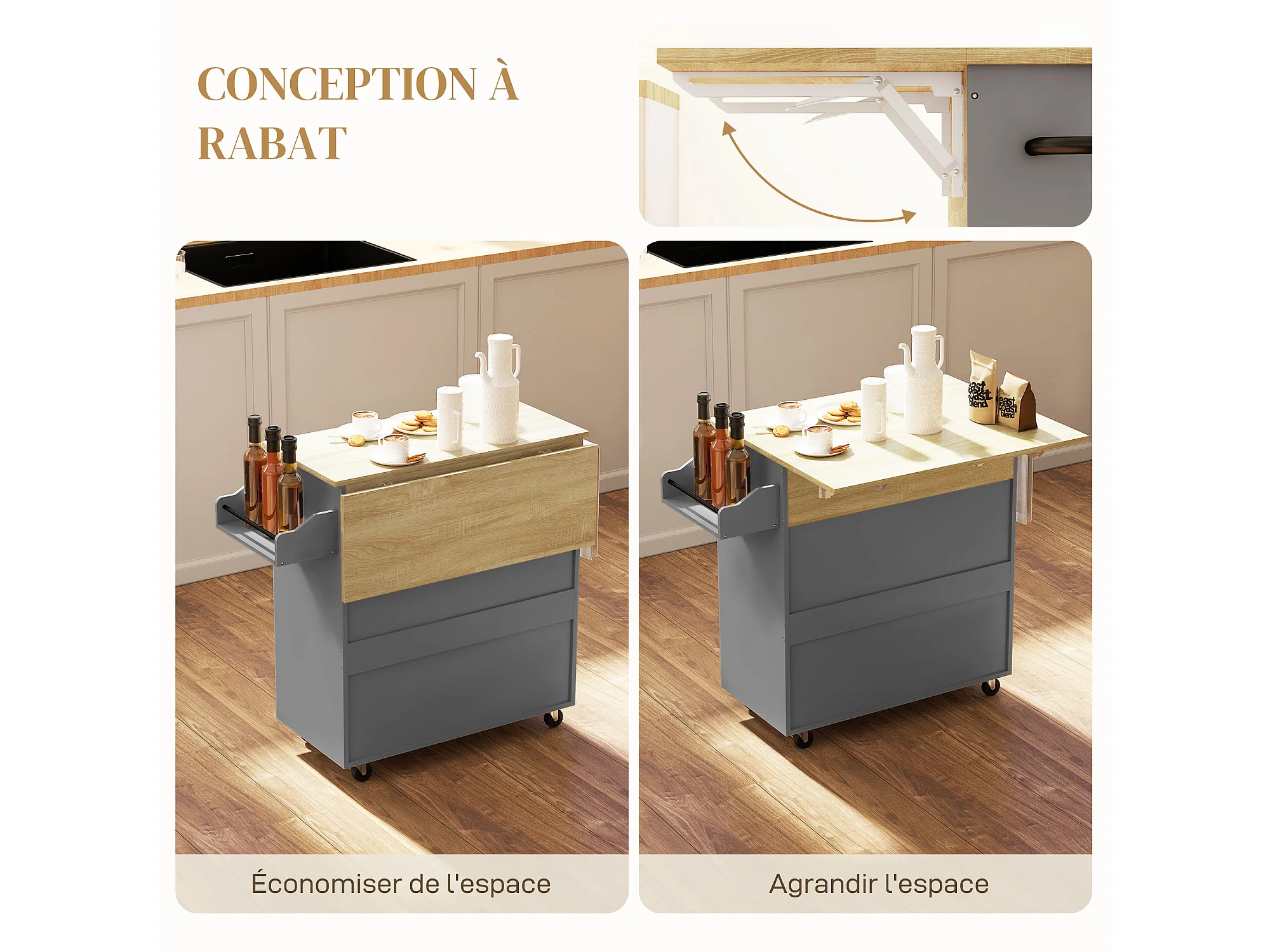Desserte de cuisine 2 portes étagère tiroir support épices porte-serviette gris effet bois naturel