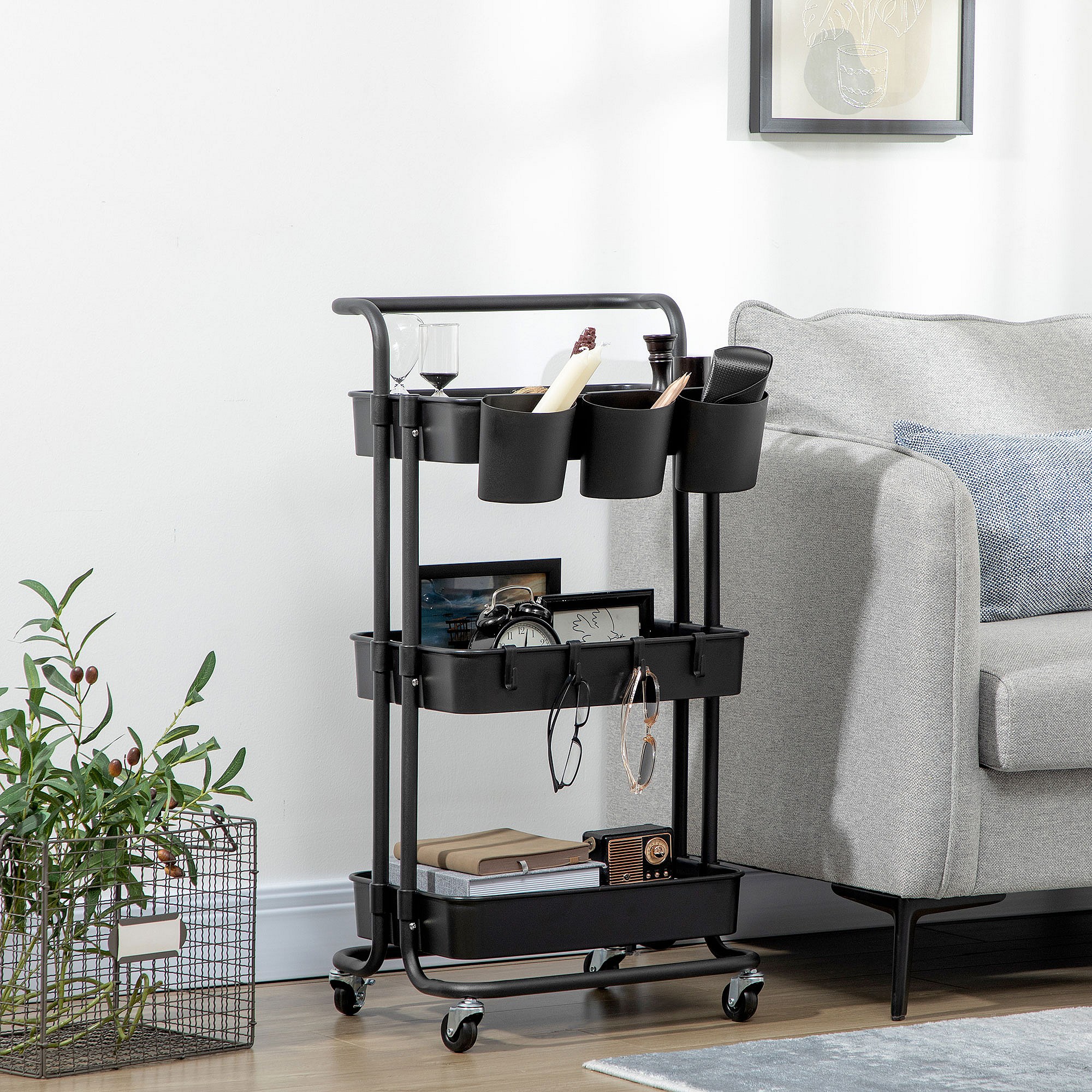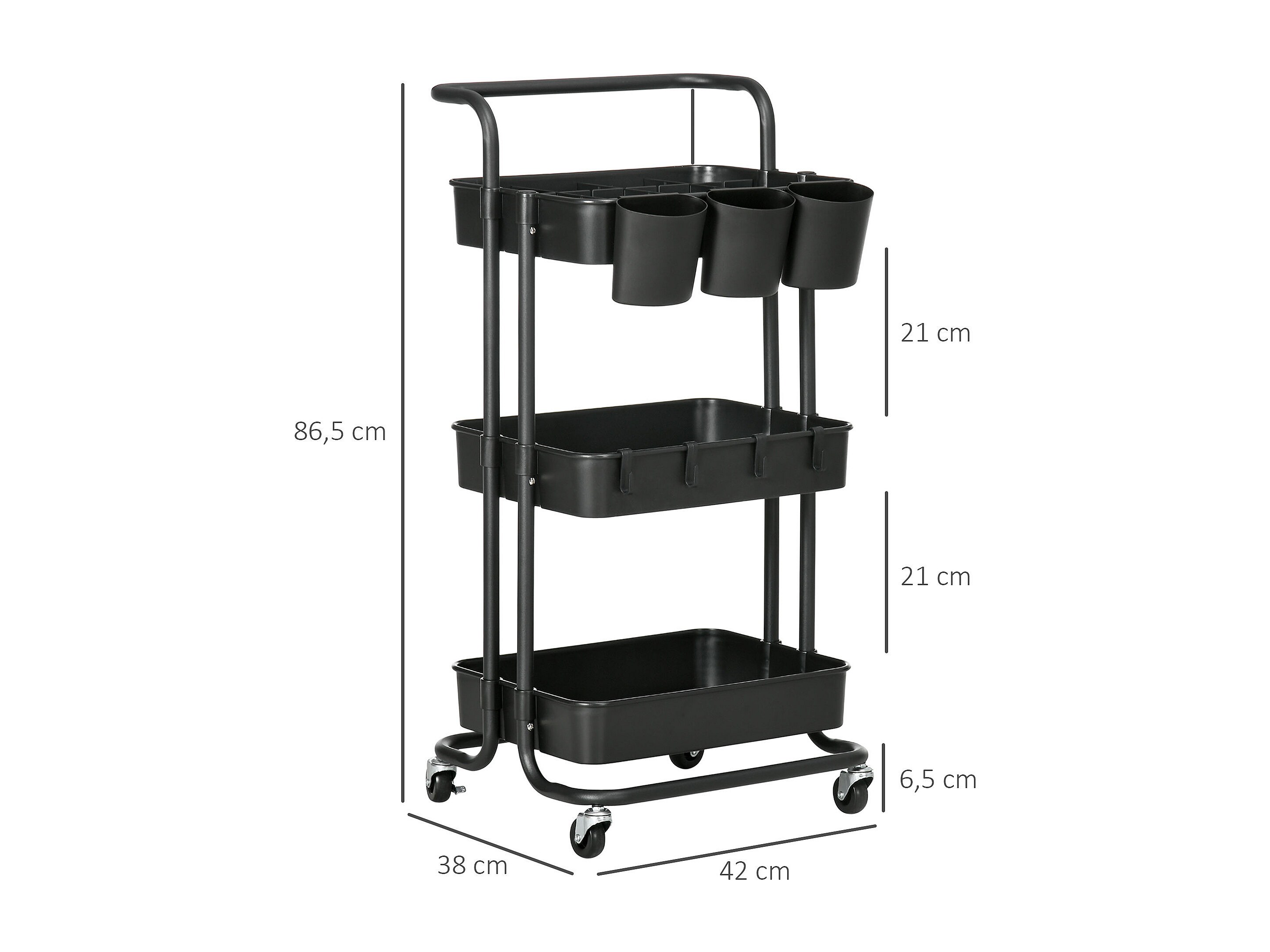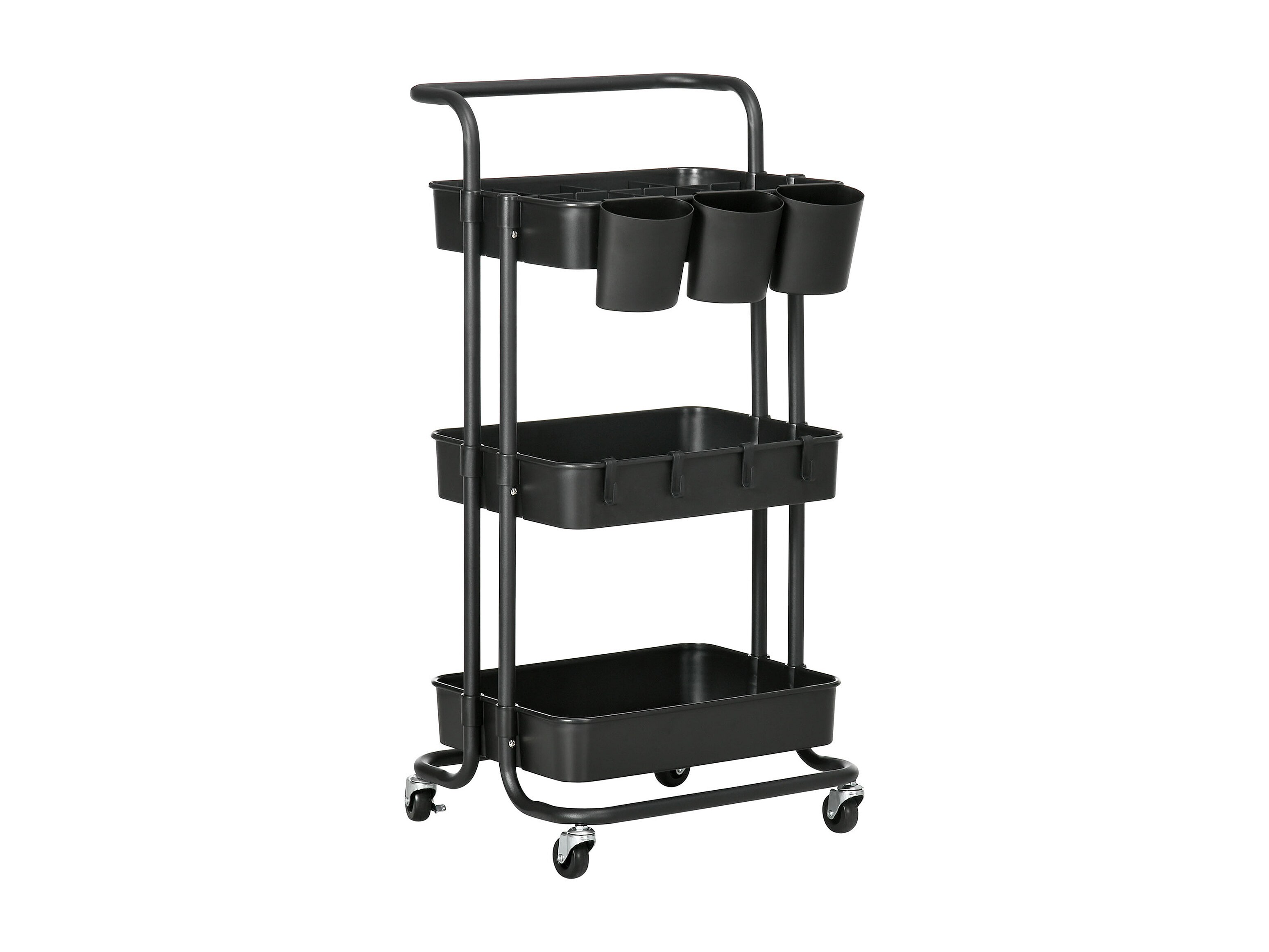 Desserte de cuisine - 3 étagères avec rebords - 4 crochets, 3 pots suspendus - acier ABS noir