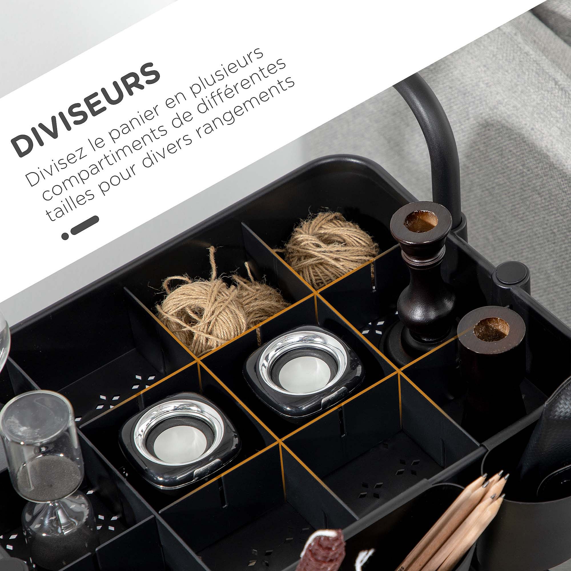 Chariot de service desserte de cuisine à roulettes multi-rangements 4 paniers métal tiroir + 4 range-bouteilles bois pin noir plateau carrelé blanc