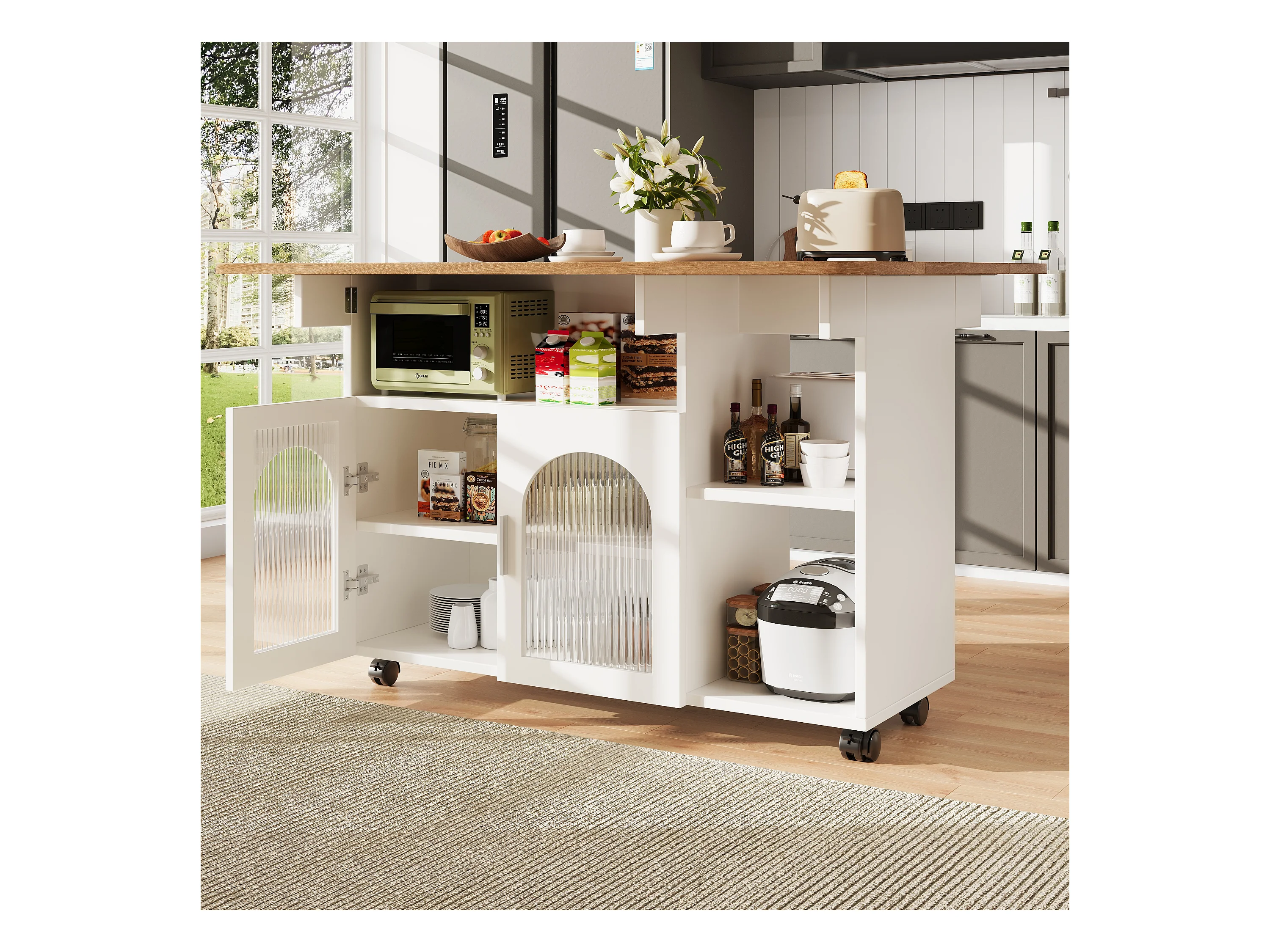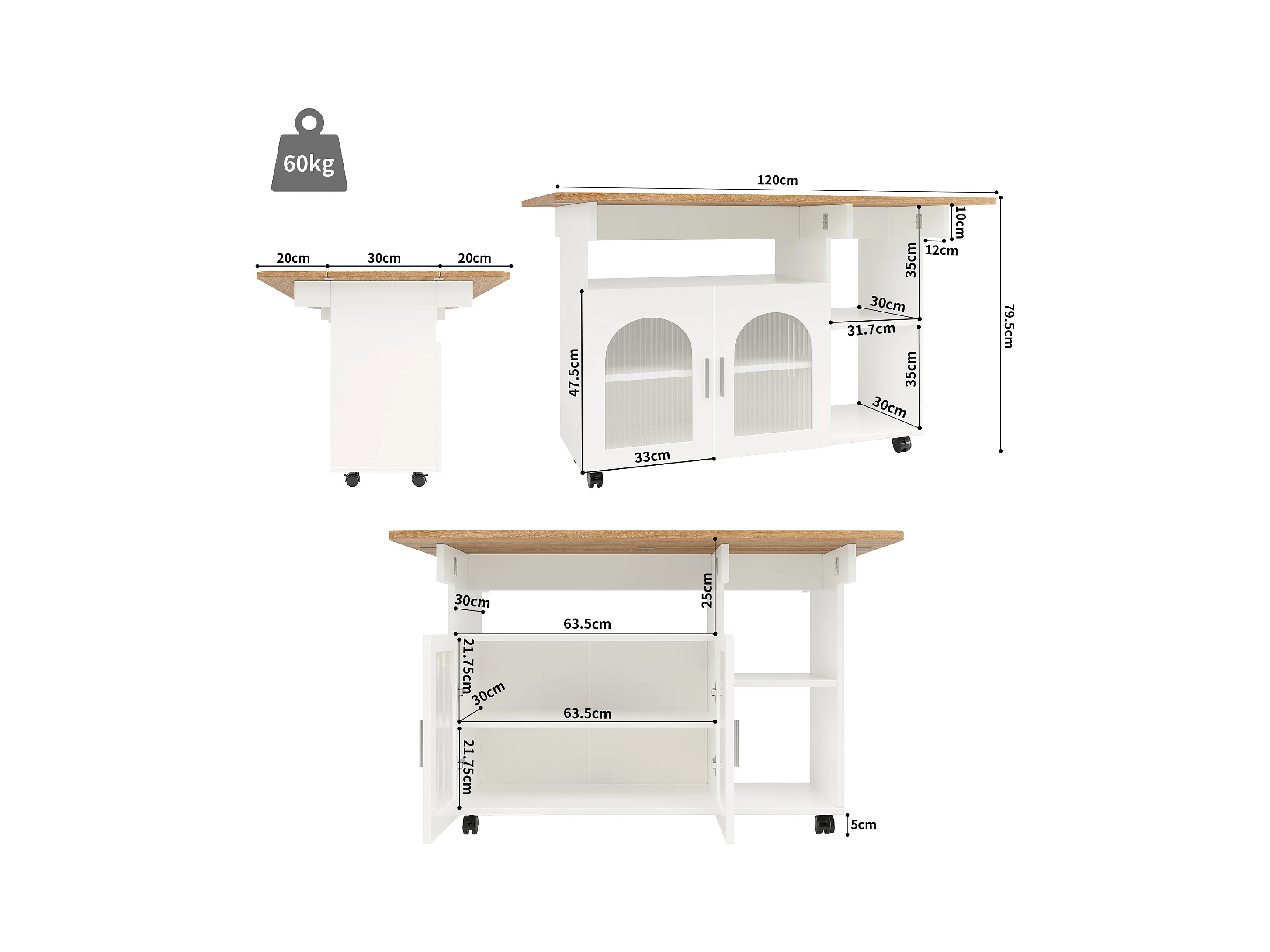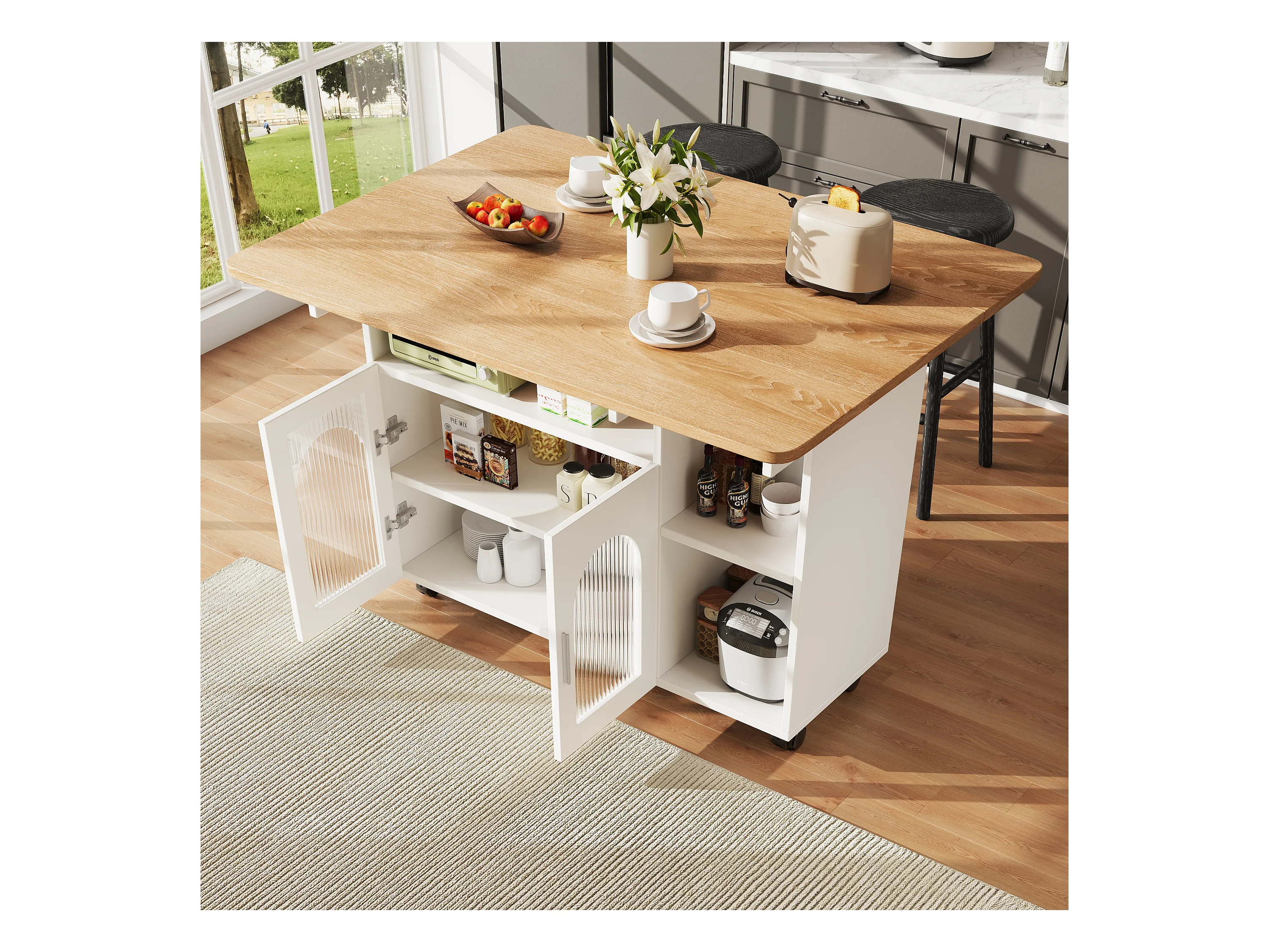 Desserte de cuisine 120x(30/70)x79.5 cm 2 portes en verre Îlot de cuisine avec plateau extensible - blanc