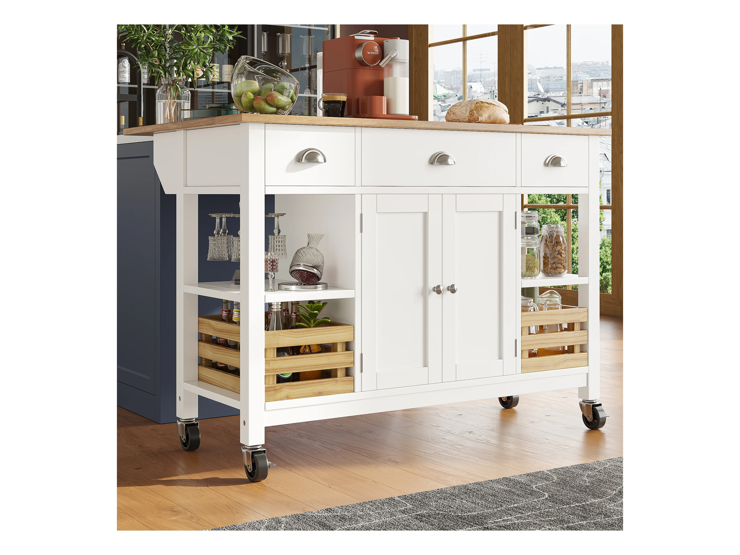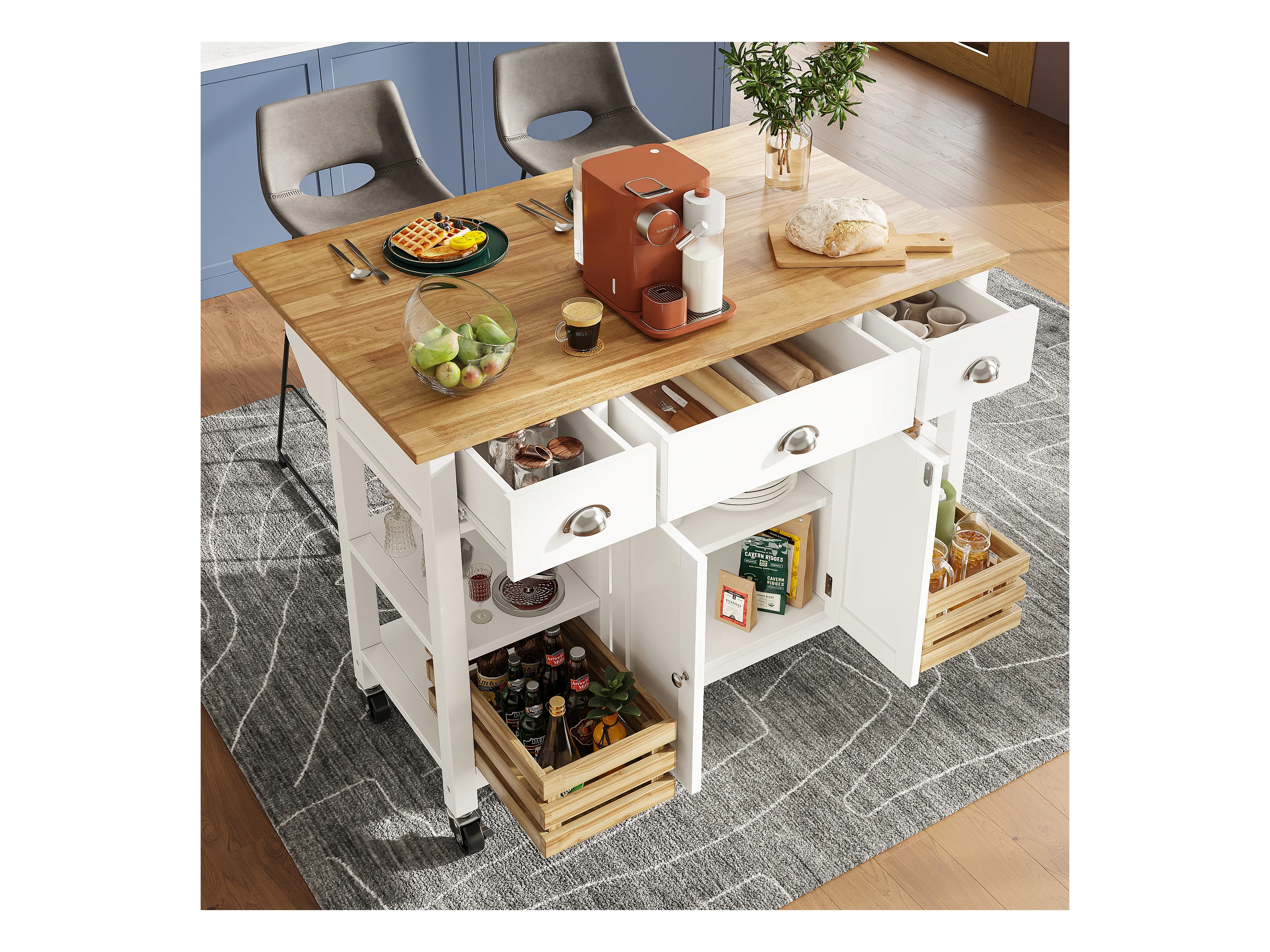 Desserte de cuisine 128x(45-73)x90 cm 2 portes et 3 tiroirs Îlot de cuisine avec plateau extensible - blanc