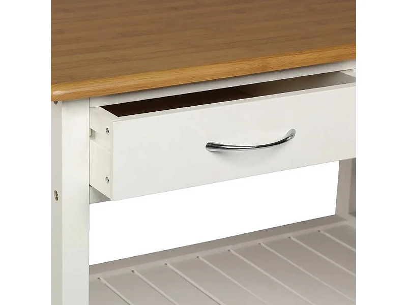 Desserte de cuisine à roulettes - tiroir, placard, porte-serviette - MDF blanc plateau bois hévéa