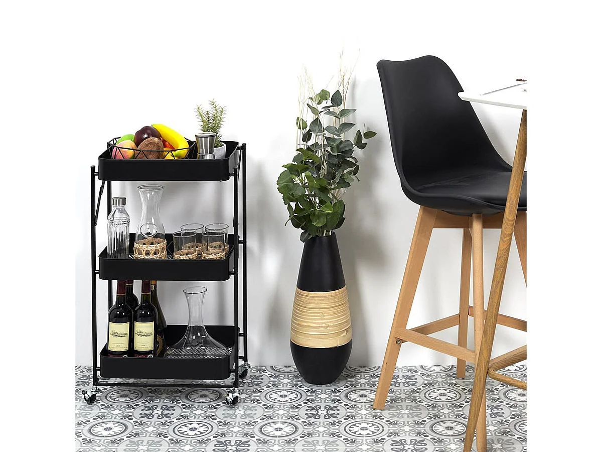 KALIO - Desserte sur roulettes en Métal imitation bois et Plateaux en Plastique Noirs