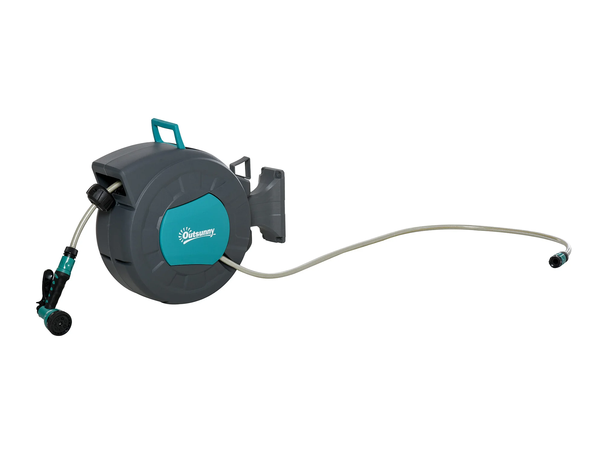 Dévidoir mural enrouleur automatique pivotant 180° tuyau 25 + 2 m avec lance arrosage 7 modes support mural intégré gris clair bleu