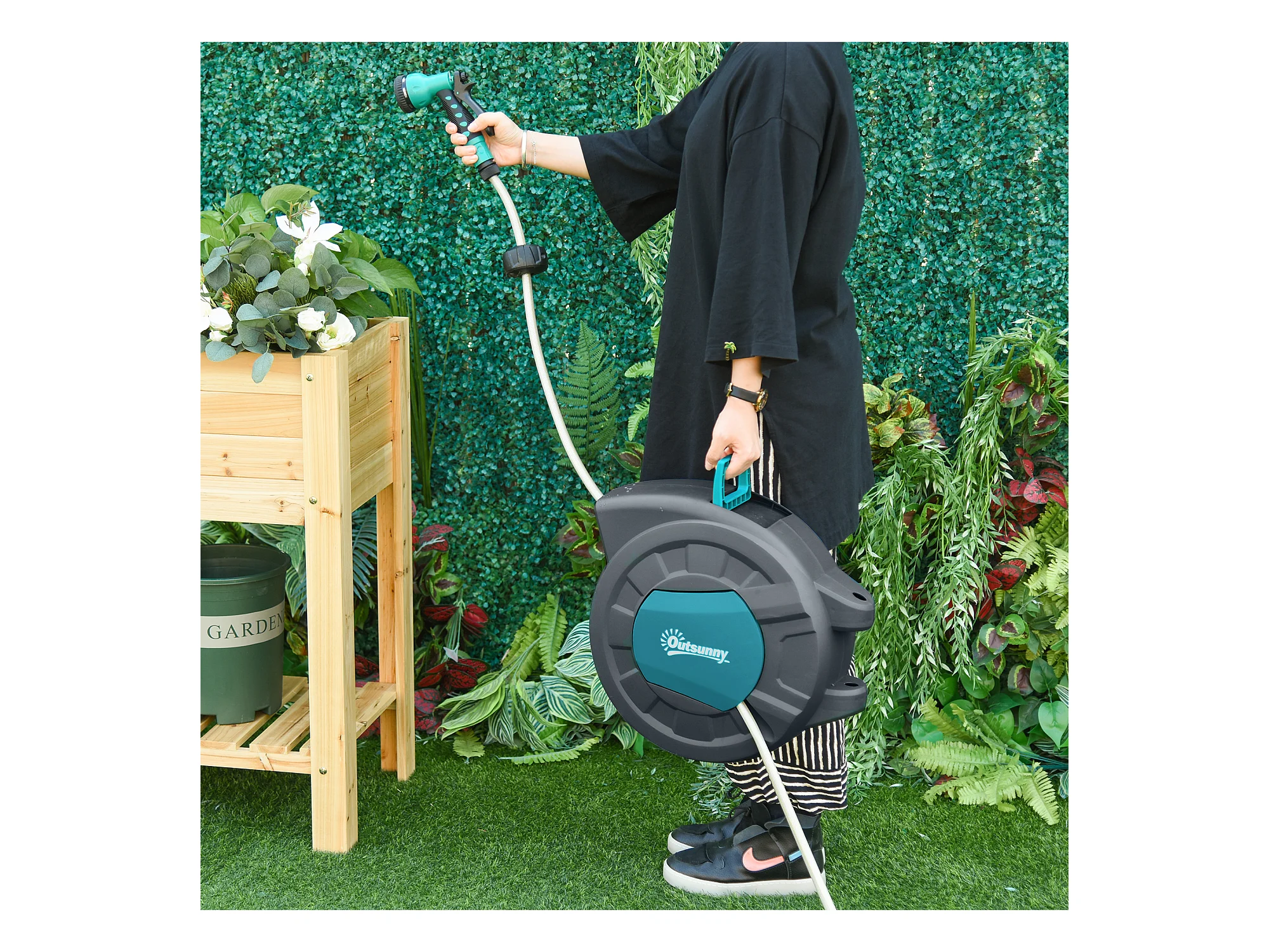 Dévidoir mural enrouleur automatique pivotant 180° tuyau 15 + 1,4 m avec lance arrosage support mural intégré turquoise gris