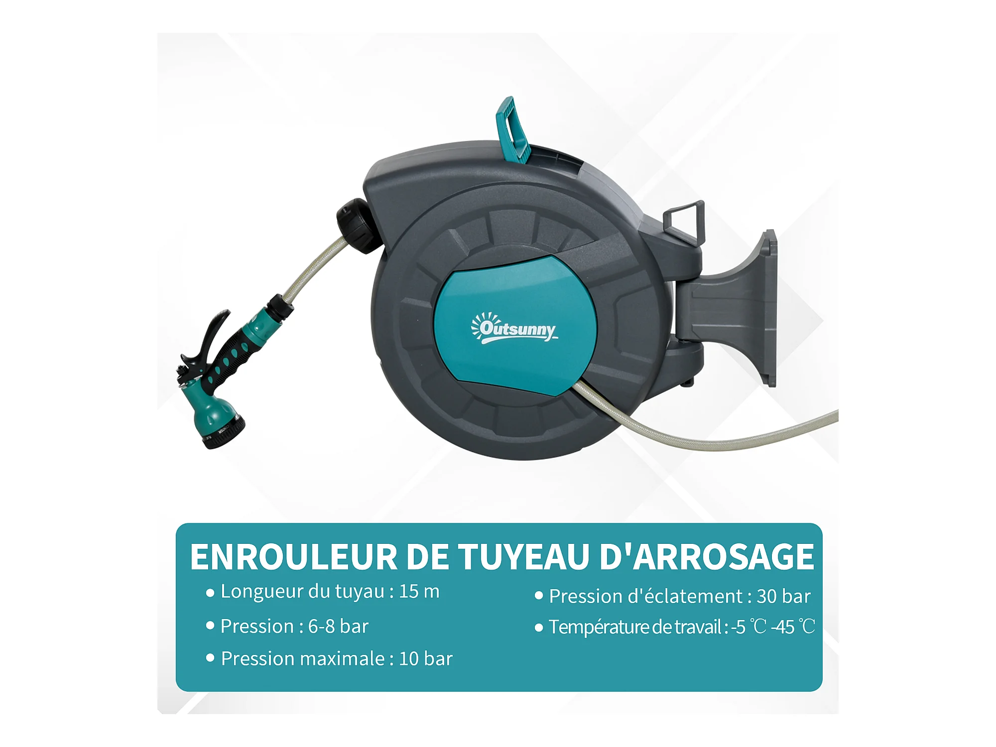 Enrouleur de tuyau d'arrosage mural 15m + 1,5m pivotant à 180° rétraction automatique fonction d'arrêt 9 fonctions de pulvérisation en PVC/plastique