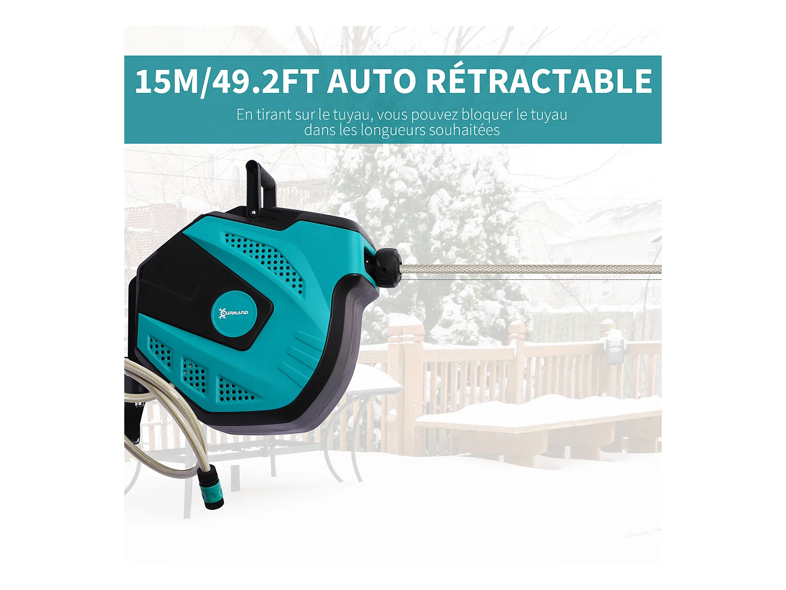 Dévidoir mural enrouleur automatique pivotant 180° tuyau 15 + 1,5 m avec lance arrosage support mural intégré turquoise noir