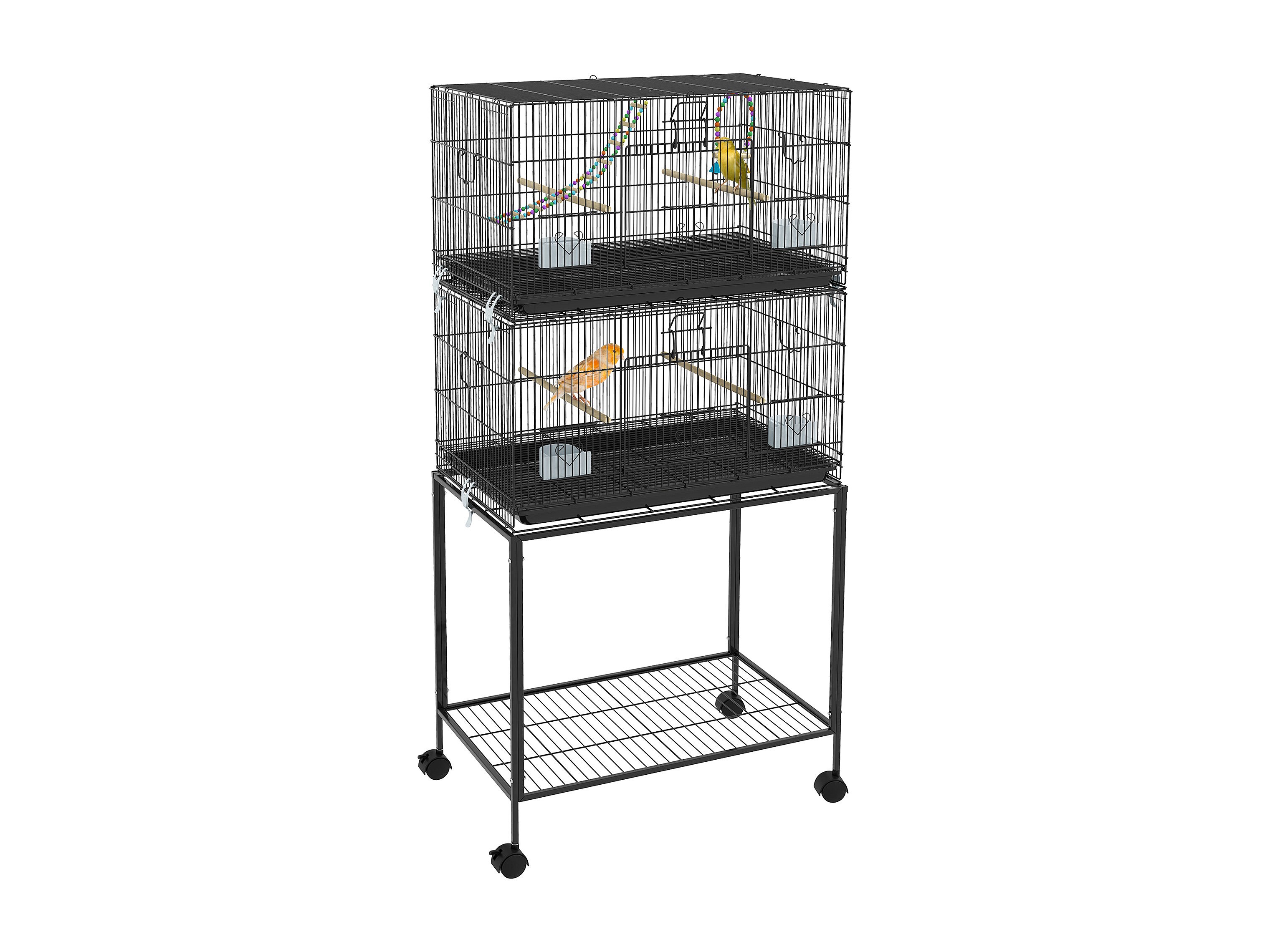 Double cage à oiseaux sur roulettes - étagère, plateau déjection, 4 perchoirs, 4 mangeoirs, poignée - dim. 77L x 46l x 164H cm acier noir