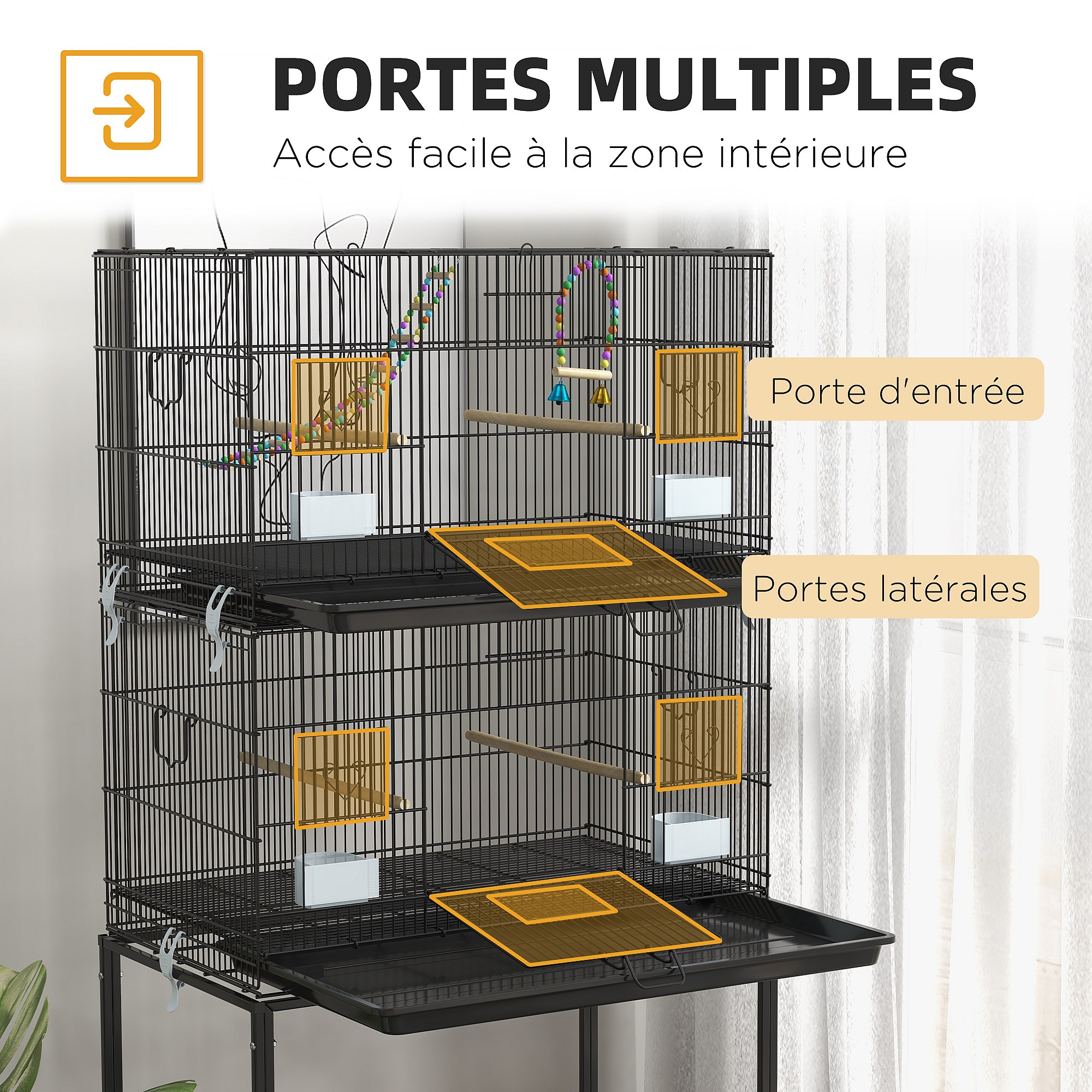 Cage à oiseaux sur roulettes - étagère, plateau déjection, 3 perchoirs, 4 mangeoirs, 2 portes, 8 trappes, accessoires - acier noir