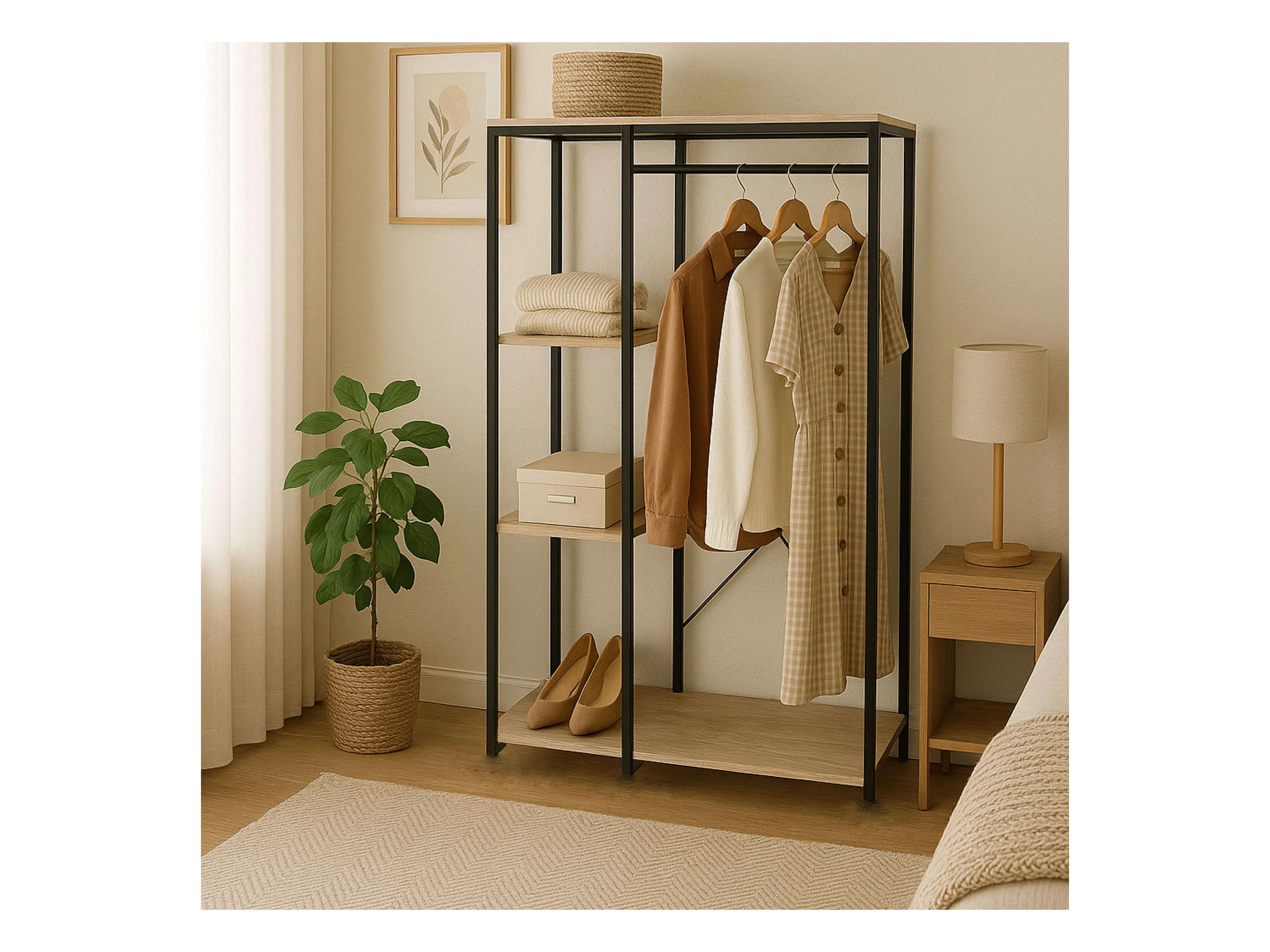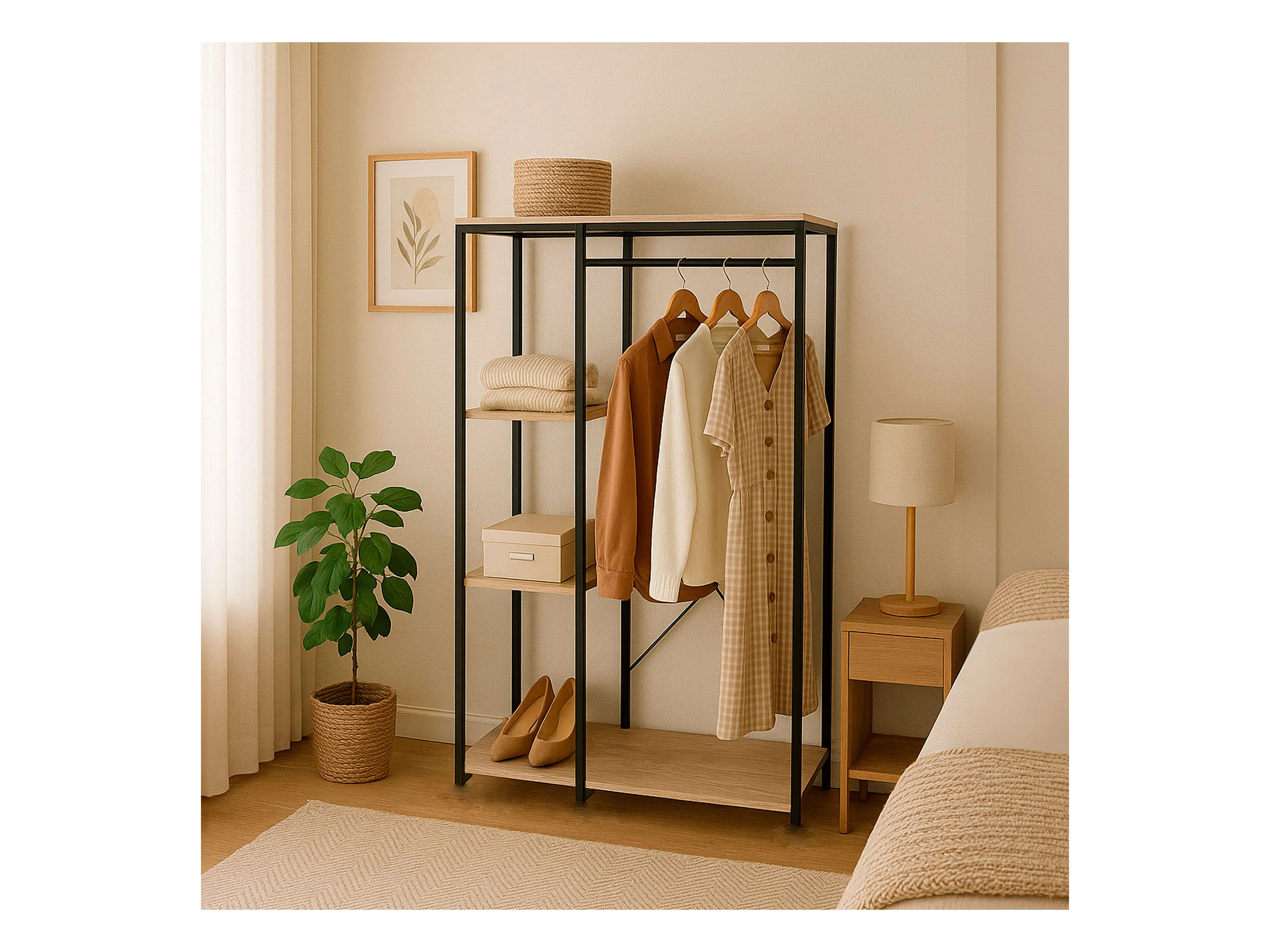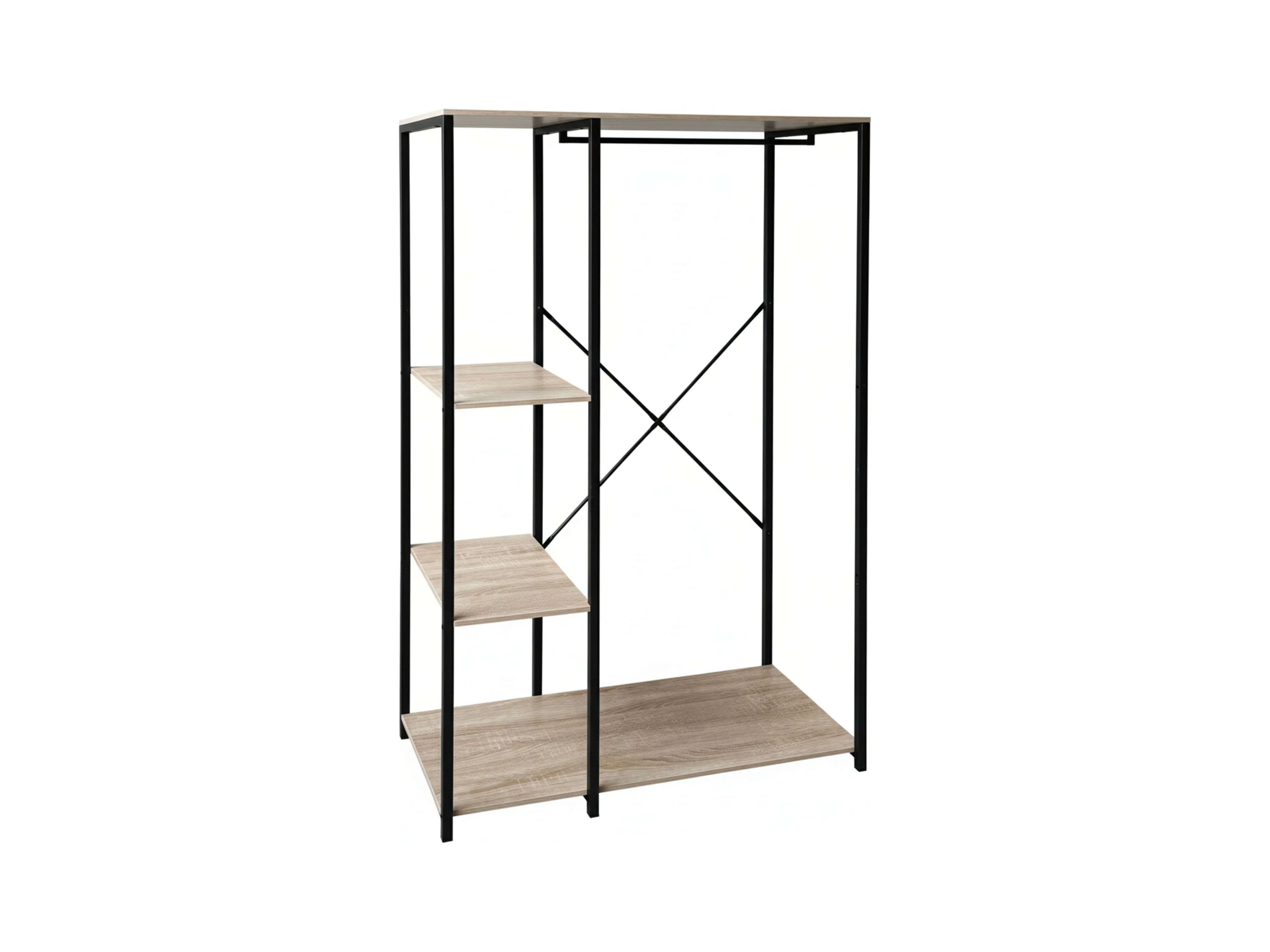 Dressing ouvert avec 3 étagères et penderie, bois clair/noir, 90x167x40 cm