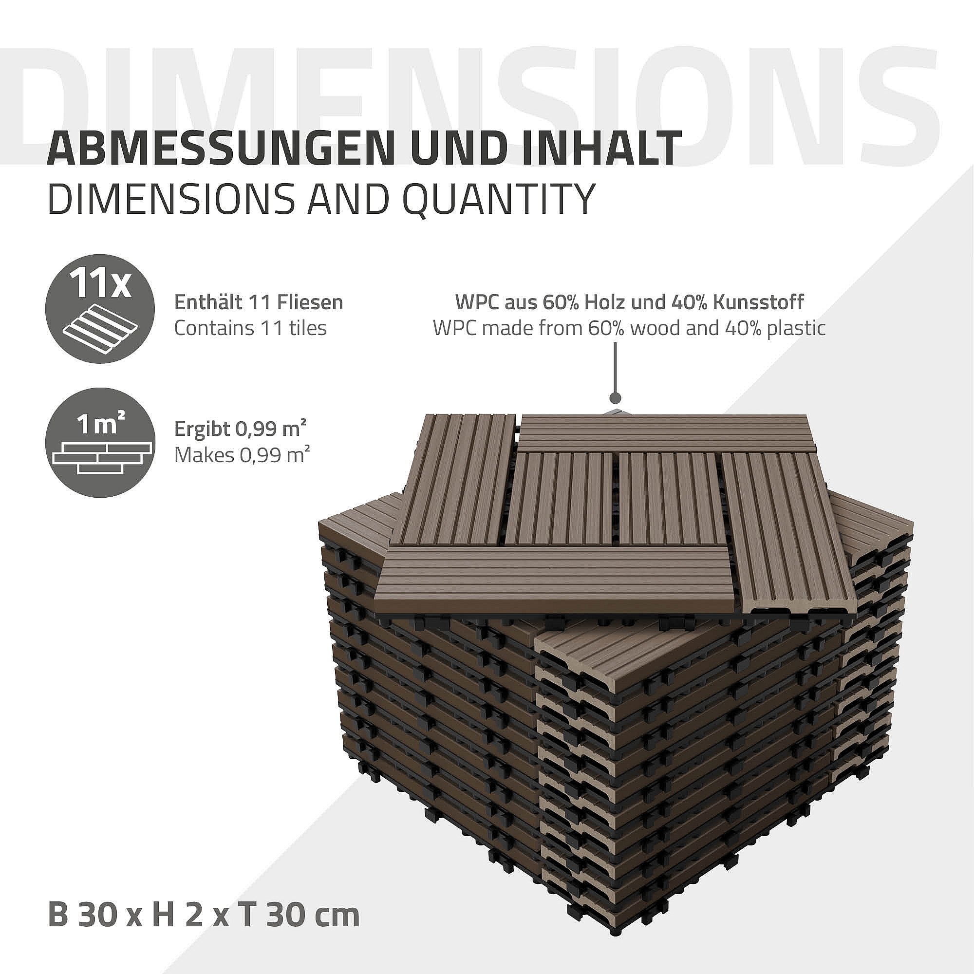 WPC Carreaux 30x30 cm 33 Pièces par 3m² avec Aspect Bois ECD Germany