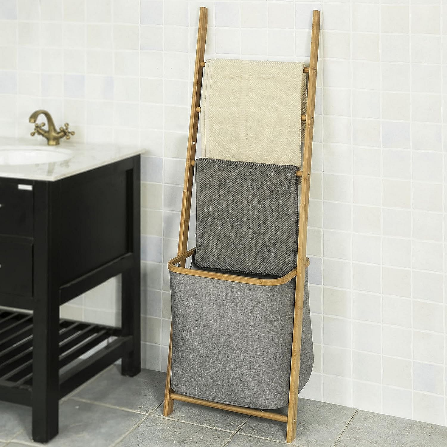 Échelle Porte-Serviettes Support avec 1 Panier à Linge Amovible et 3 Barres, FRG263-N